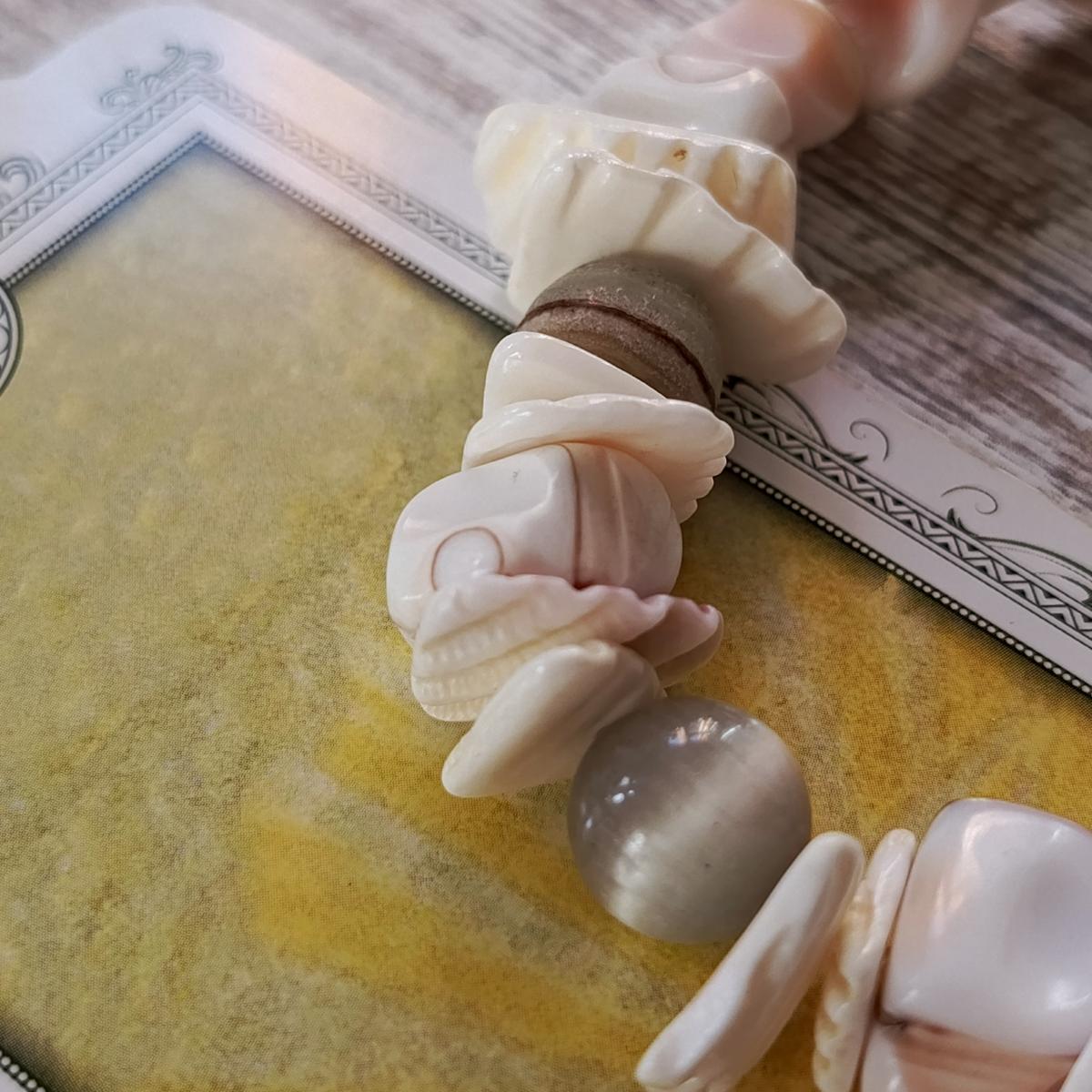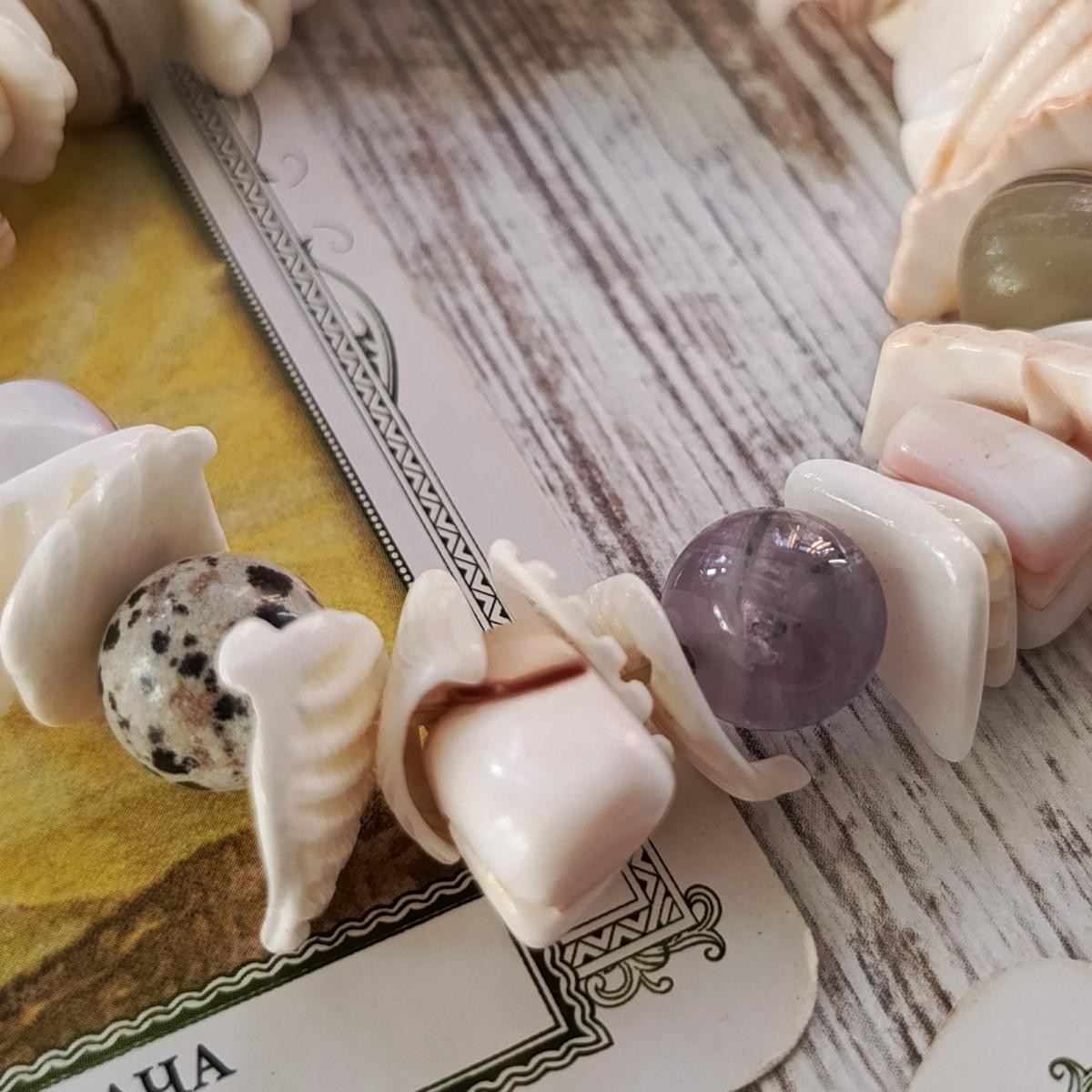 Это сочетание микса камней - оникса, аметиста, джаспера и селенита - вместе с ракушками создает мощный и сбалансированный энергетический комплекс, объединяющий элементы воды, земли и высших вибраций. Каждый из компонентов выполняет свою роль: ракушка смягчает и усиливает эмоциональную связь, оникс обеспечивает защиту и заземление, аметист способствует духовному развитию и очищению. Селенит дополняет композицию, обеспечивая связь с высшими сферами и очищая пространство, а яшма укрепляет стабильность и поддержку в практических делах.