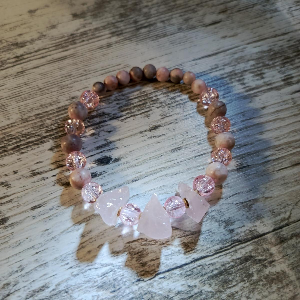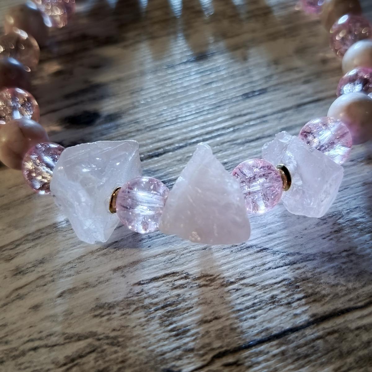 Сочетание розового кварца, розовой яшмы и кварца кракле объединяет энергии любви, исцеления, стабильности и очищения, создавая мощный синергетический эффект: