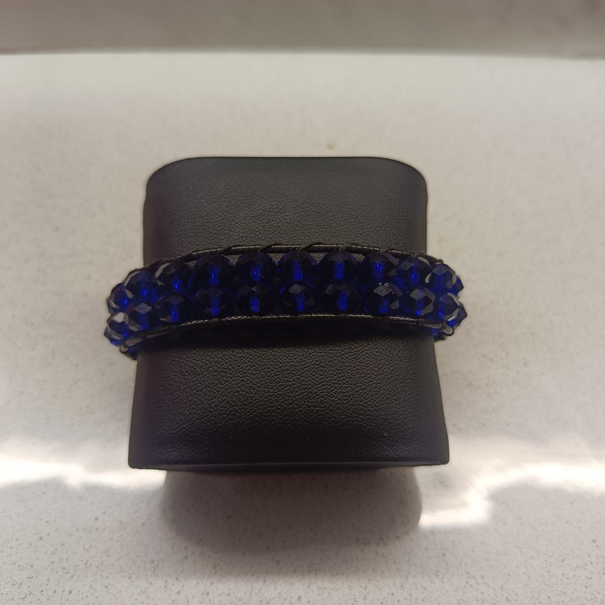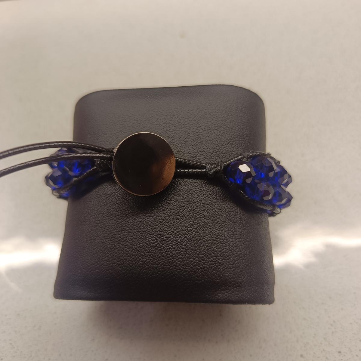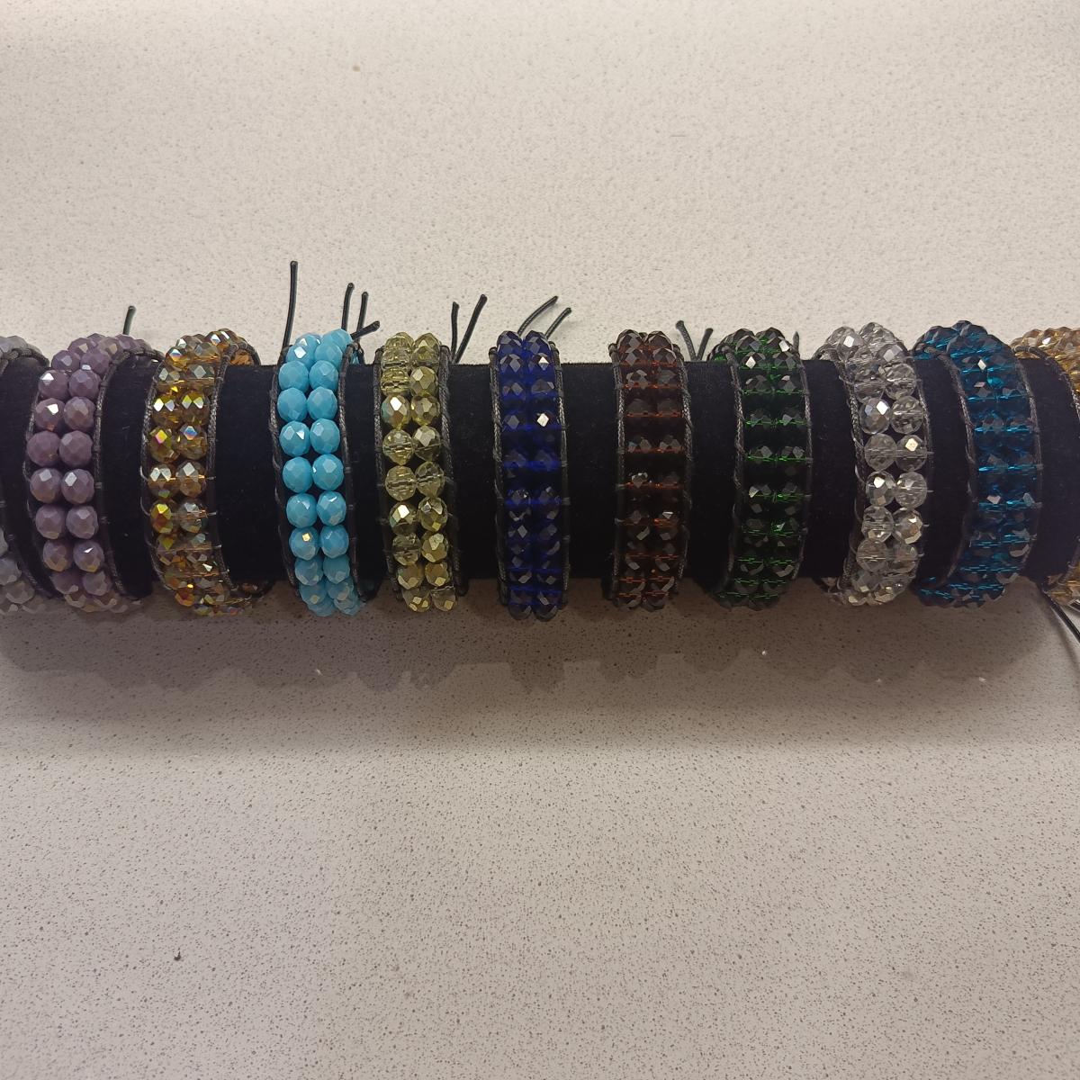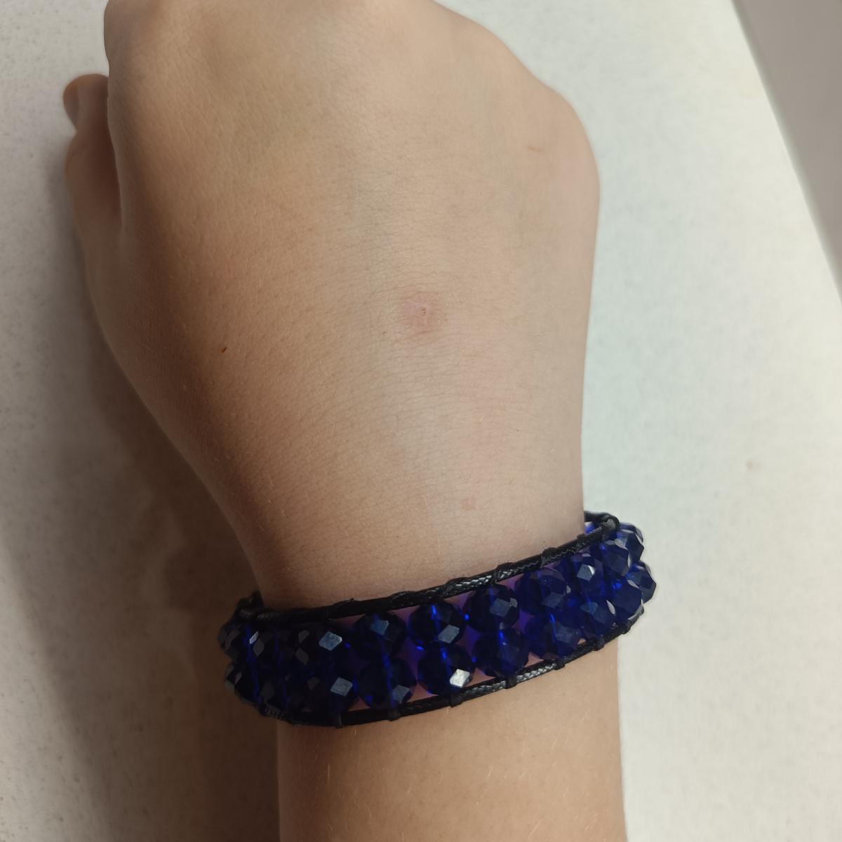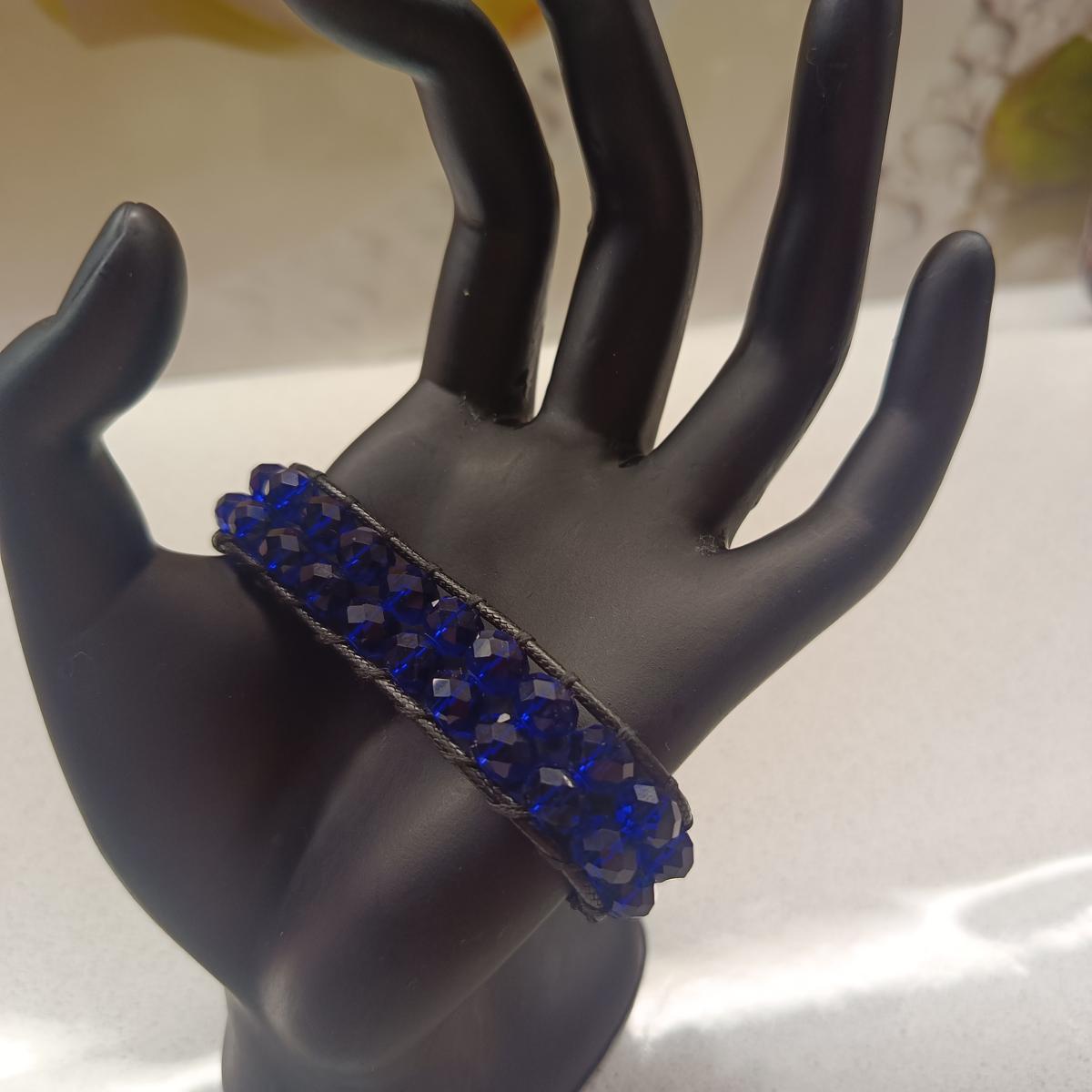Браслеты сплетены в технике Чан Лу в два ряда из хрустальных бусин. В основе браслета вощеный шнур 1,5 мм, вощеные нити или леска. Хрустальные бусины размеров 8 мм. Застежка - металлическая пуговица и петелька. Размер для запястья 15-17 см.