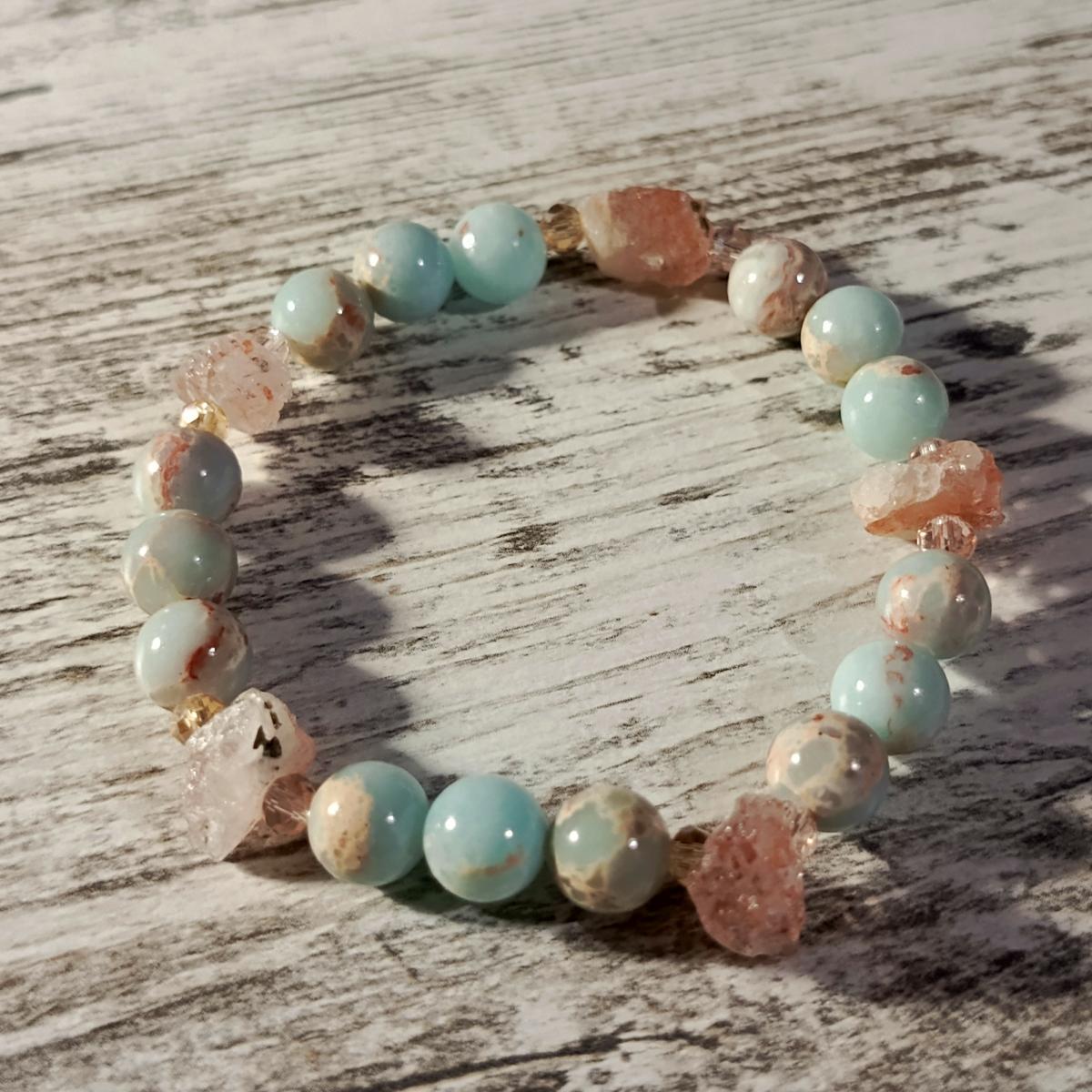 3. Спокойствие + Радость: Умиротворяющая энергия варисцита балансирует с лёгкой, радостной вибрацией кварца, создавая состояние счастливого умиротворения.