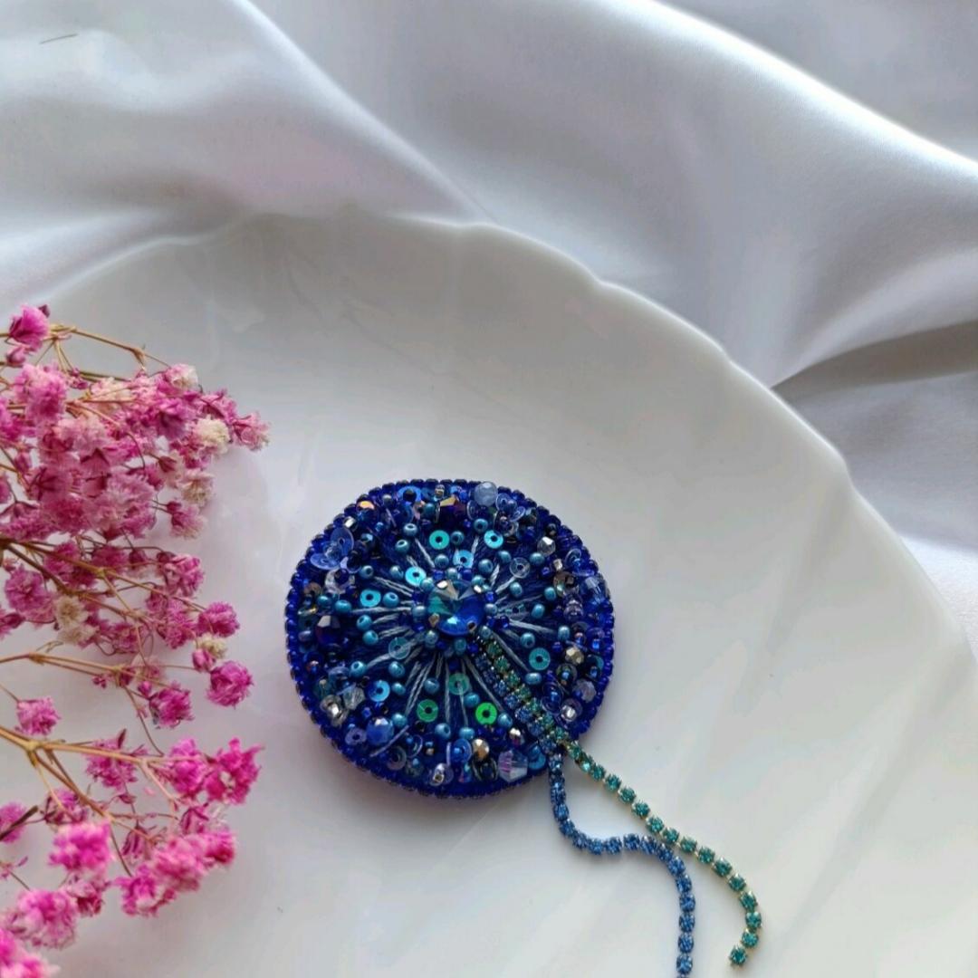 Материалы: нитки мулине, вискоза (искусственный шелк), стразы, стразовая цепь, чешский бисер, японский бисер Тохо, пайетки итальянские и индийские, хрустальные бусины, изнанка экокожа, японская булавка.