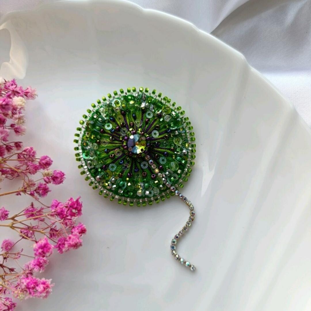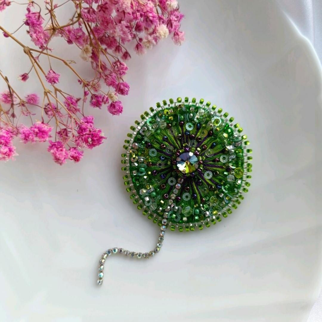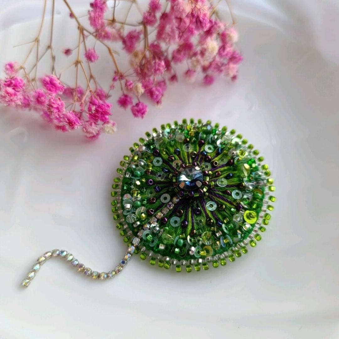 Материалы: нитки мулине, вискоза (искусственный шелк), стразы, стразовая цепь, чешский бисер, японский бисер Тохо, пайетки итальянские и индийские, хрустальные бусины, изнанка экокожа, японская булавка.