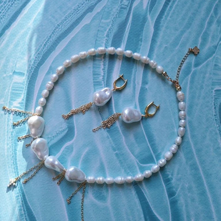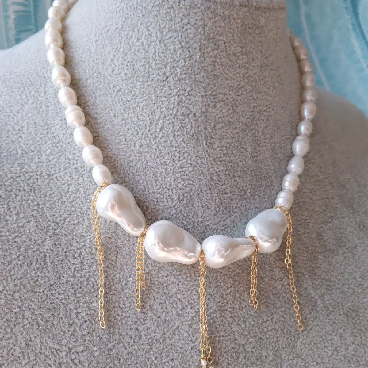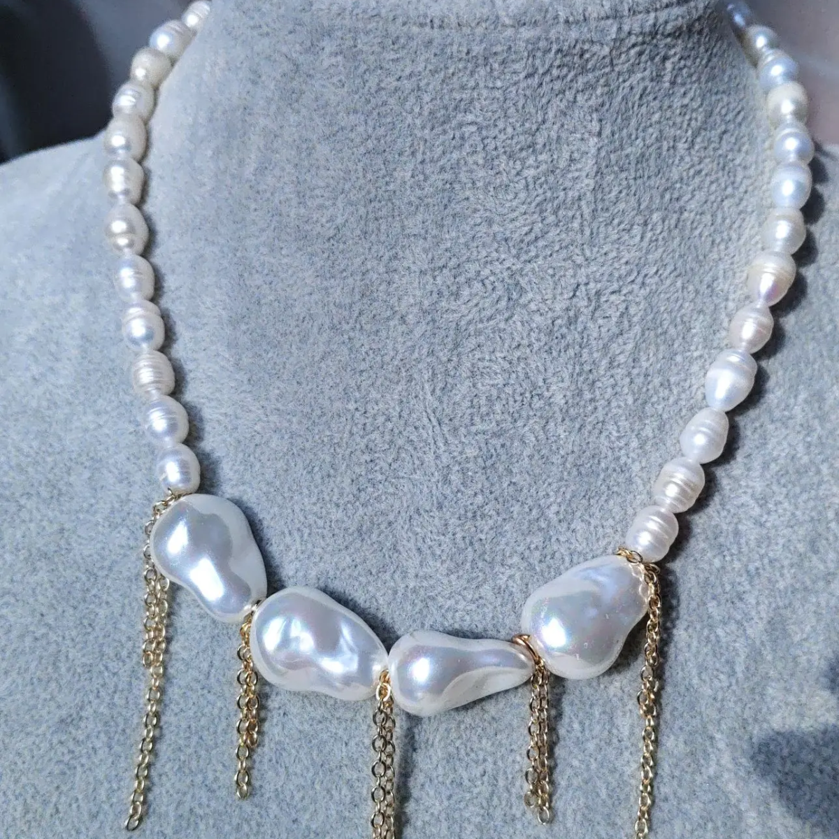 Бусы из натурального речного жемчуга и жемчужин майорка и серьги к ним, длина 41 см + 5 см