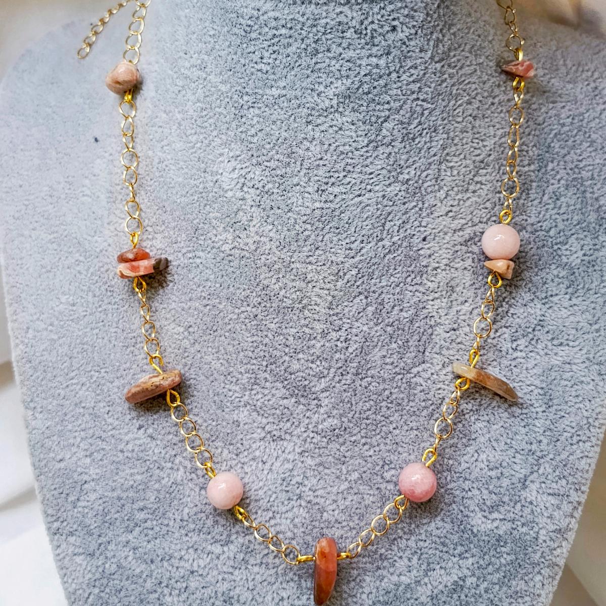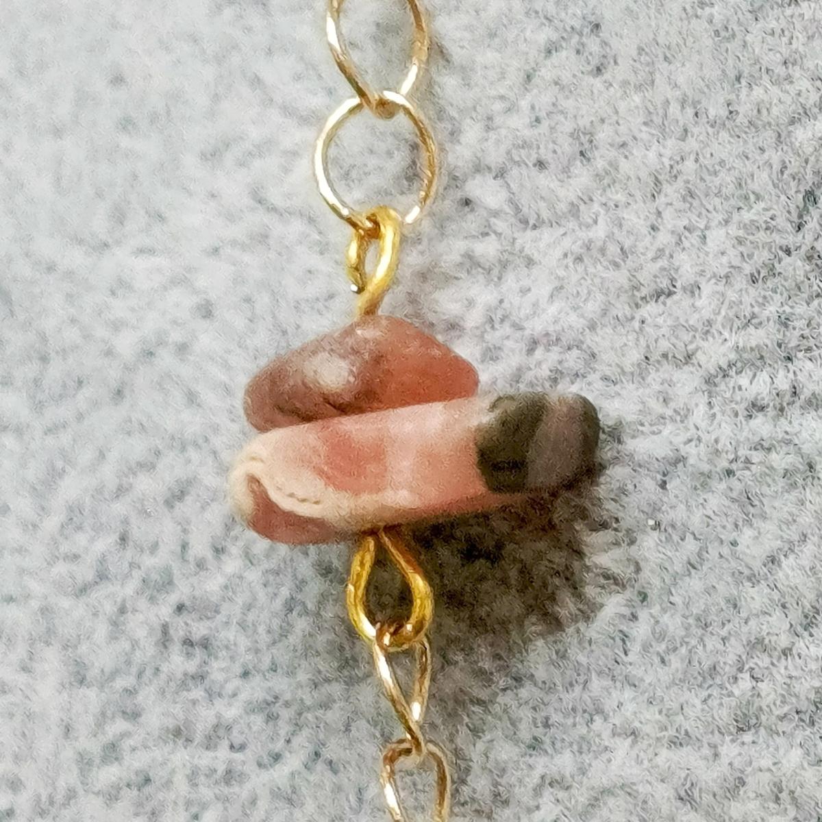 Цепочка с родохрозитом и кварцем Саккура обладают мягкими, гармонизирующими энергиями, связанными с любовью и сердечной чакрой. Их сочетание усиливает исцеление эмоций, привлекая нежность и эмоциональное равновесие.