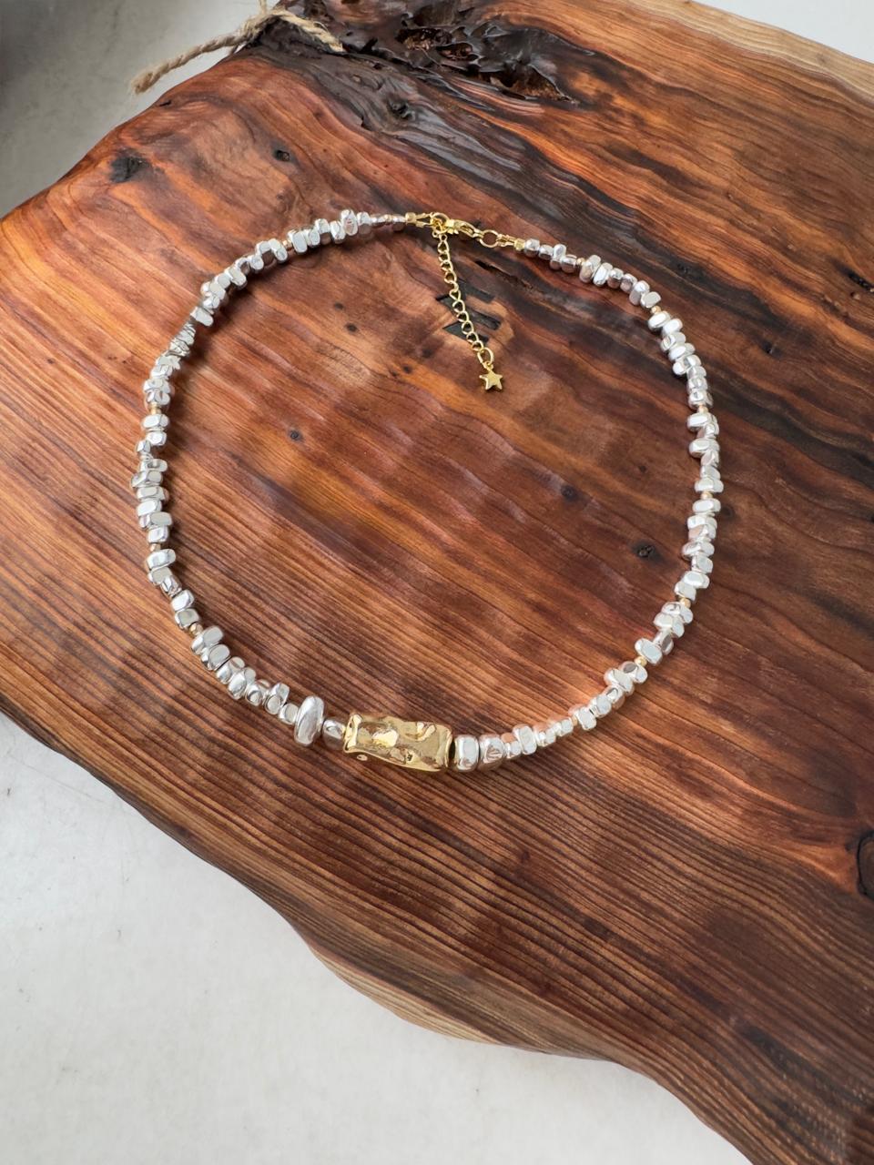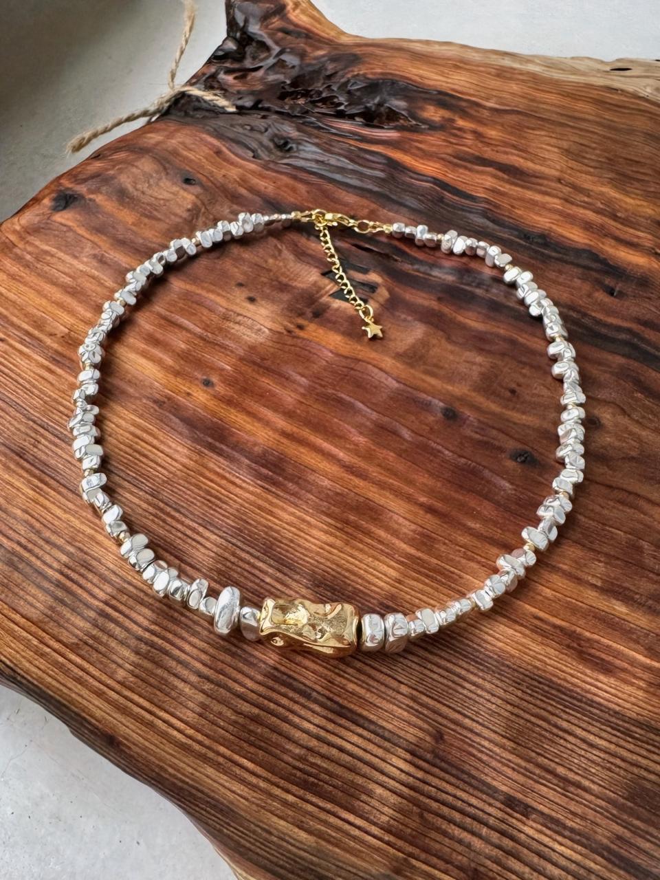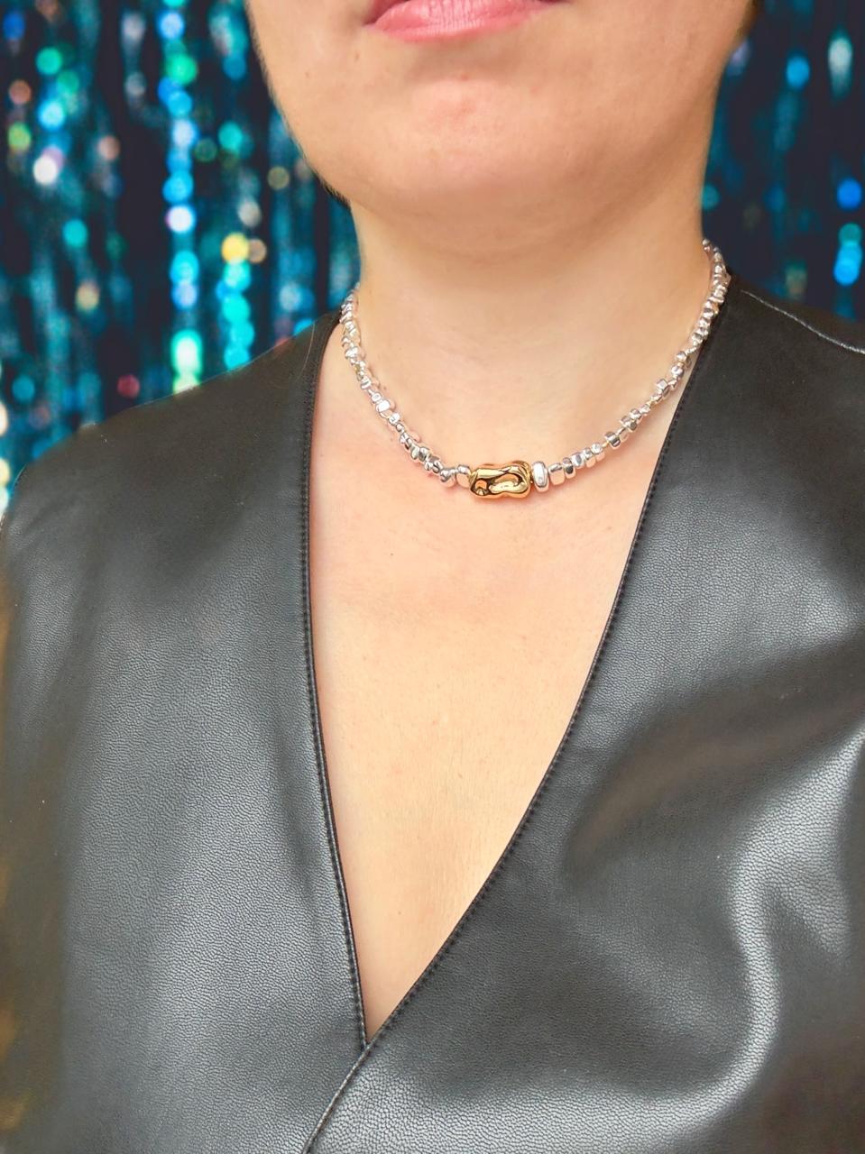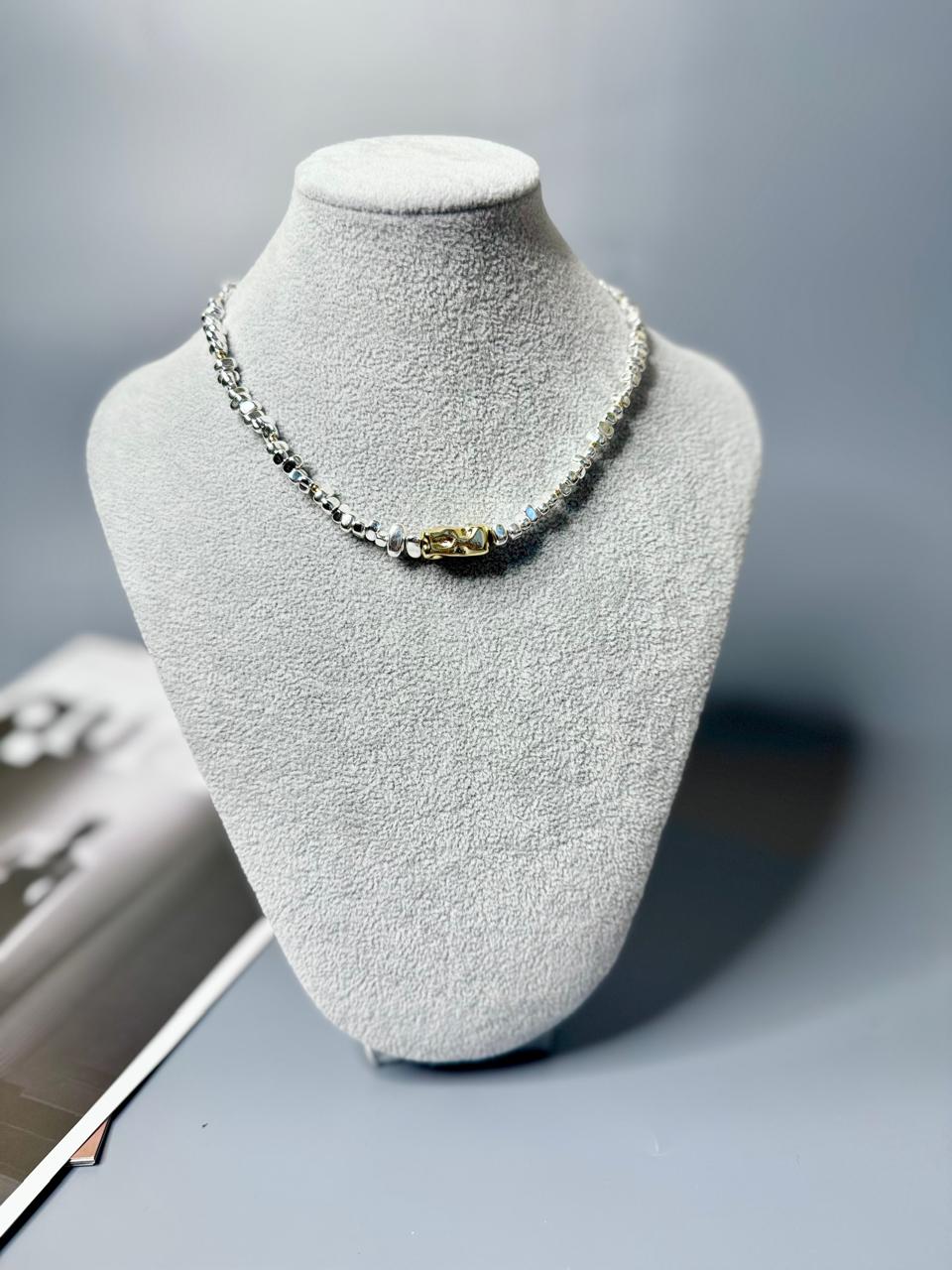 Чокер из серебряного гематита неправильной формы, с крупной золотой бусиной из мятого металла