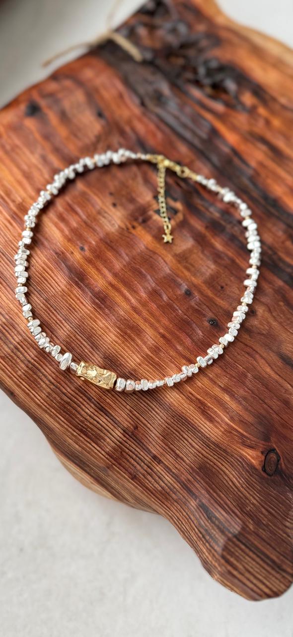 Минимальное количество для товара "Чокер из серебряного гематита неправильной формы, с крупной золотой бусиной из мятого металла " 1.