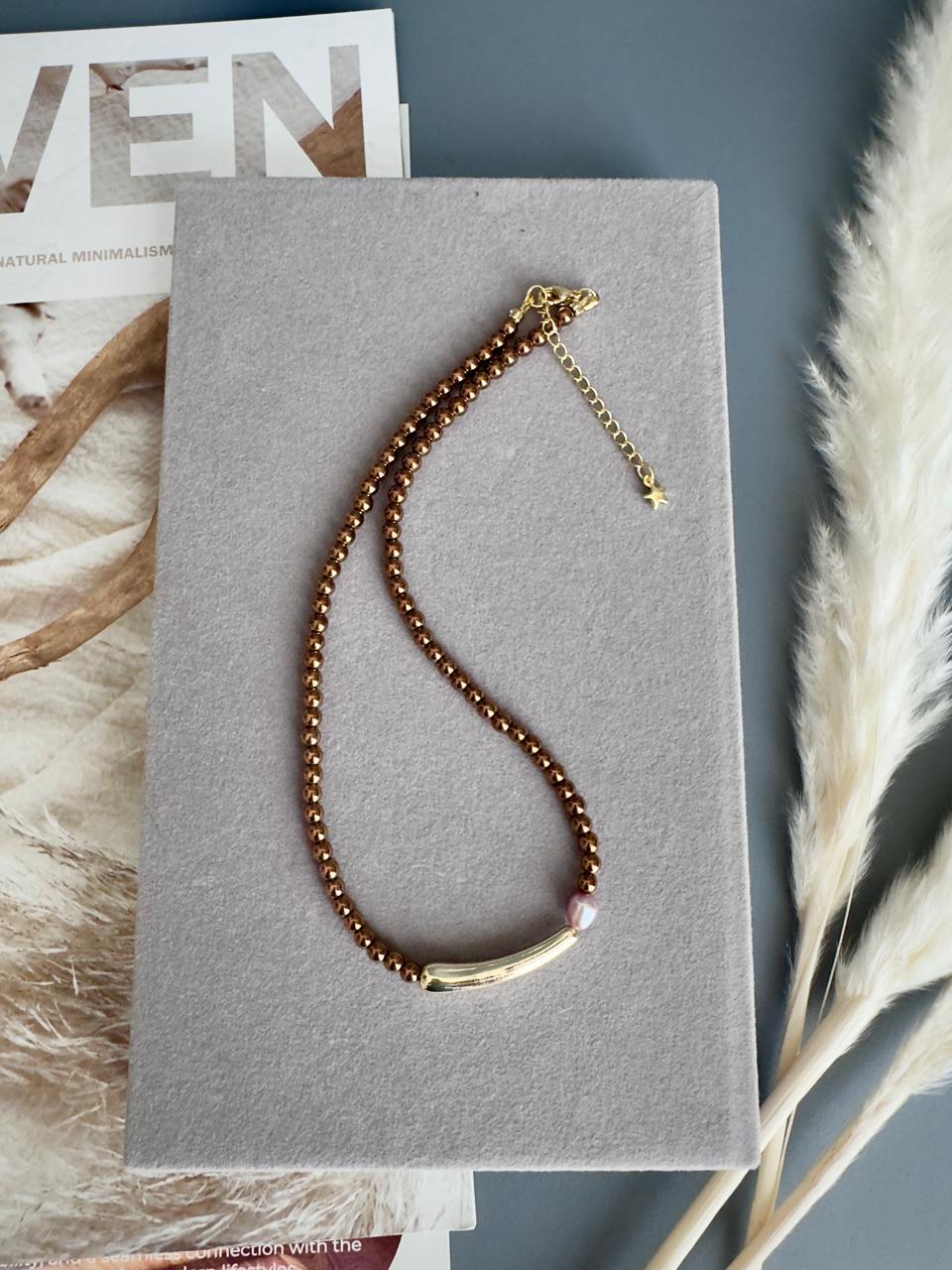 Чокер из и жемчуга майорка цвета шоколад, золотой металлической вставкой и розовой жемчужиной