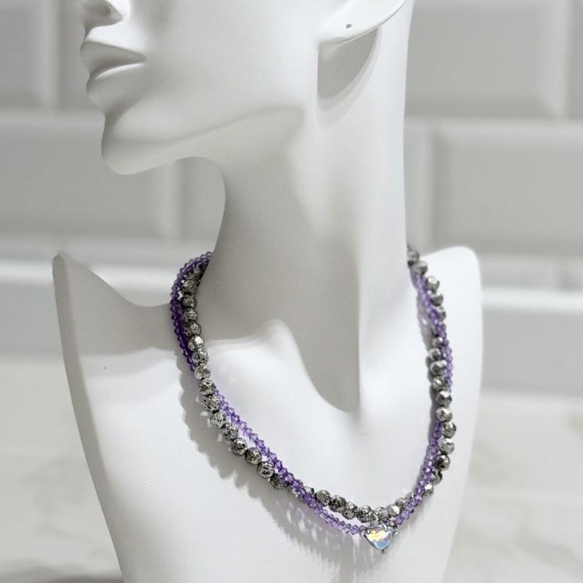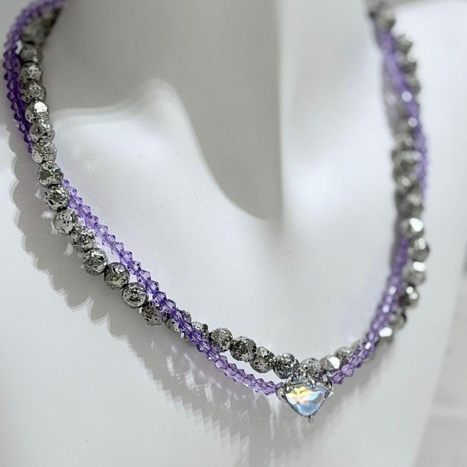 Элегантный чокер из фактурных бусин вулканической лавы и нежно-сиреневых кристаллов с радужной подвеской-сердцем - сочетание силы и романтики.