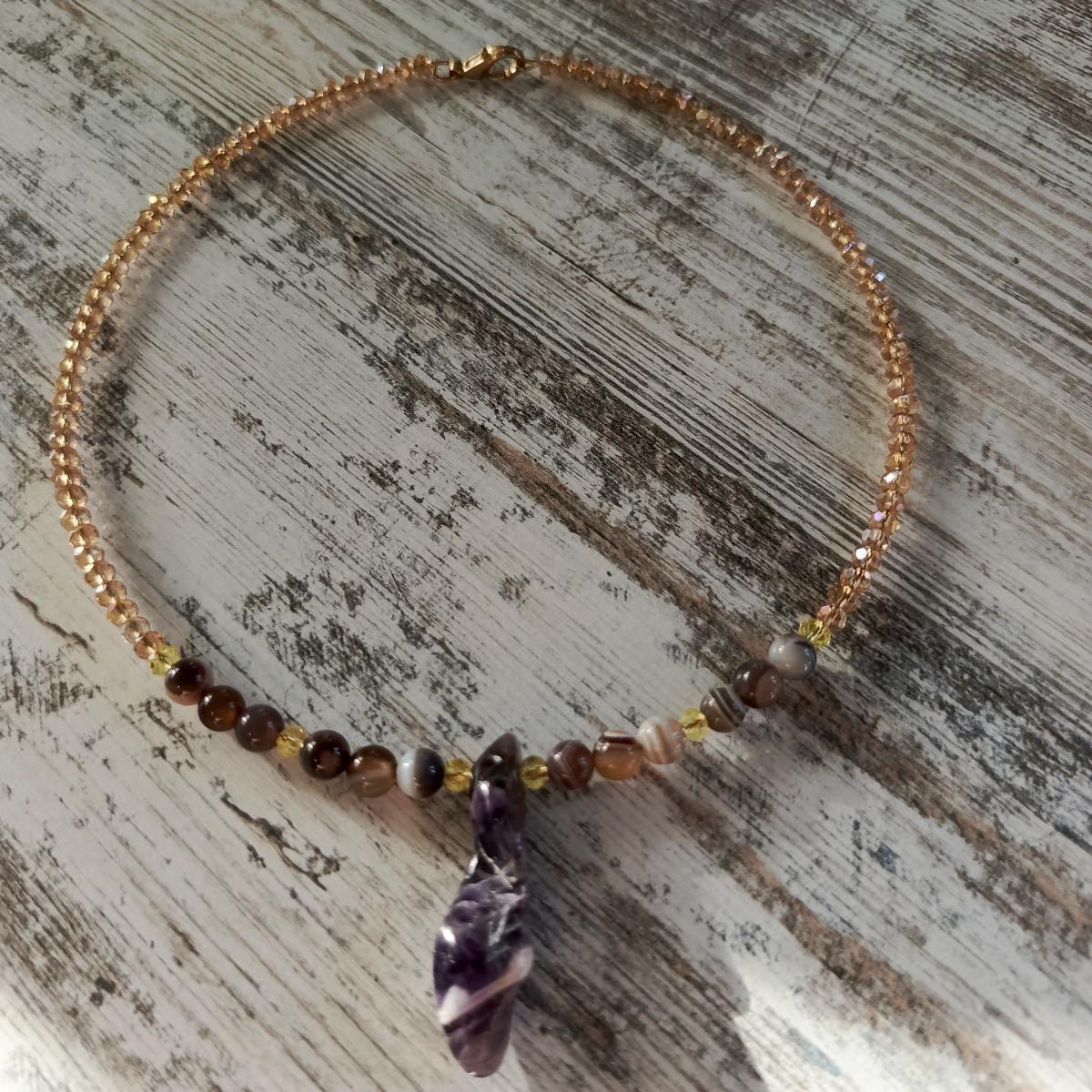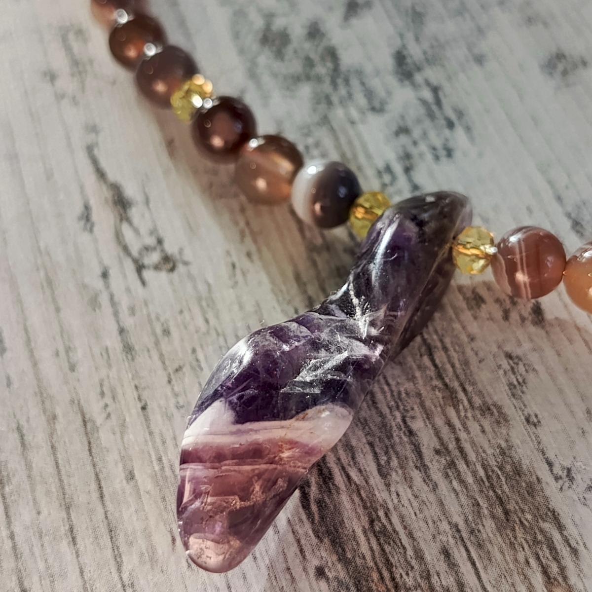 Сочетание аметиста (центральный камень 3 см) и агата боствана (бусины 6мм) представляет собой гармоничную комбинацию, сочетающую духовные и земные энергии. Аметист способствует духовному развитию, защите и очищению, помогает повысить интуицию и соединиться с высшими знаниями. Агат боствана усиливает связь с землей, способствует стабильности, росту и эмоциональному равновесию, а также усиливает действие других камней.