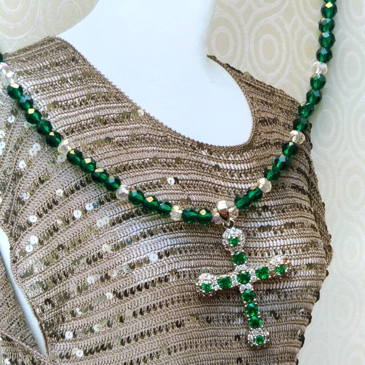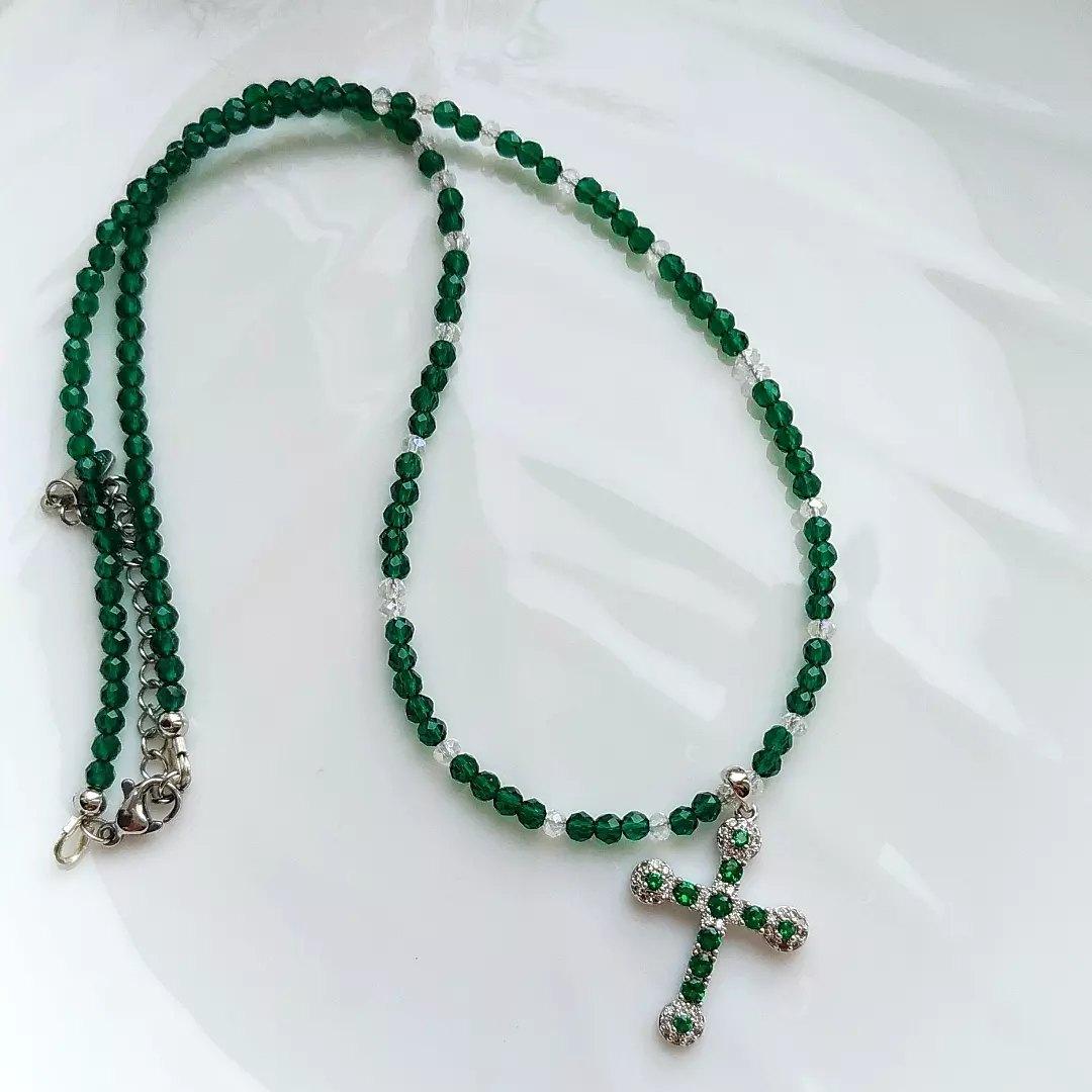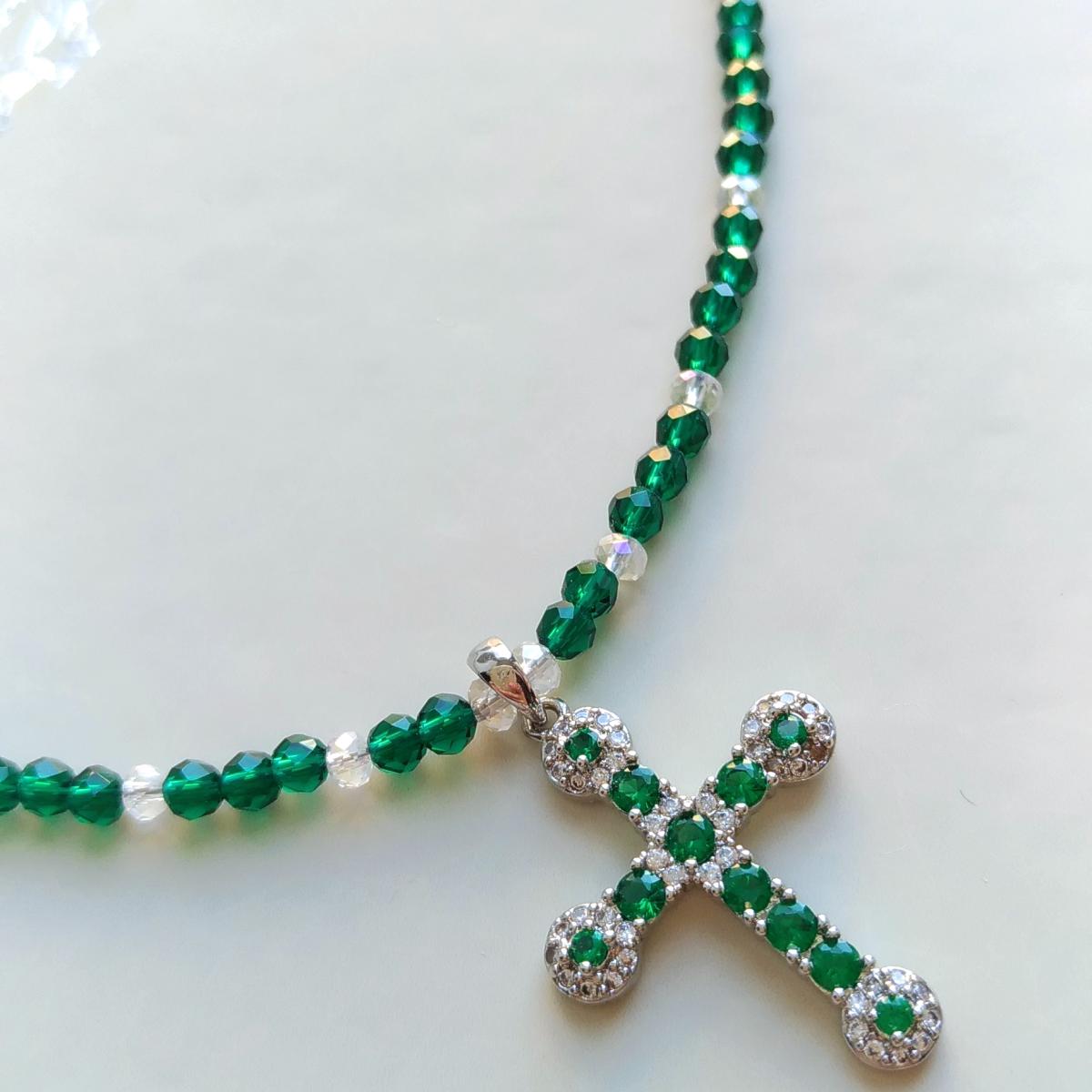 До чего же он хорошо. Нет! Он шикарен! Красоты невероятной зеленая шпинель и крестик из кубических циркониев. Фурнитура хирургическая сталь.