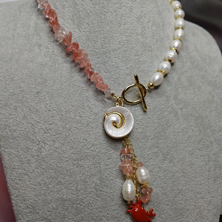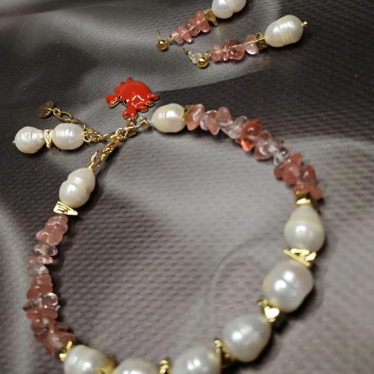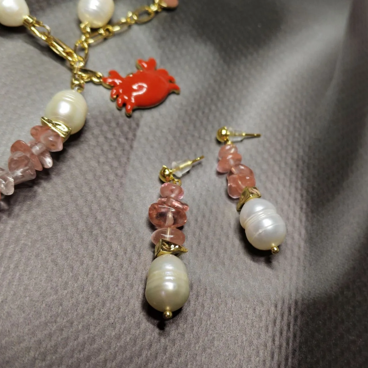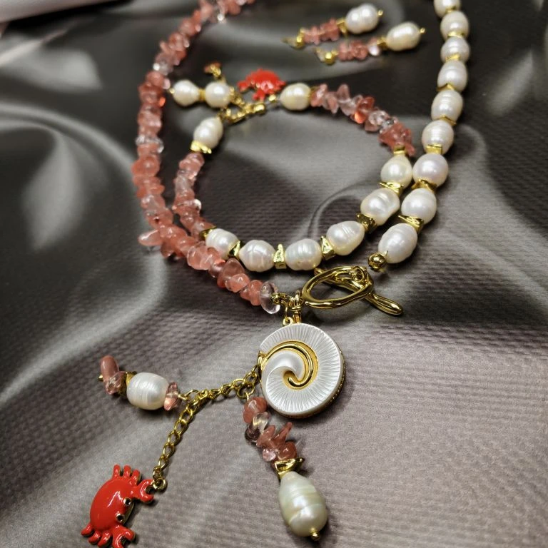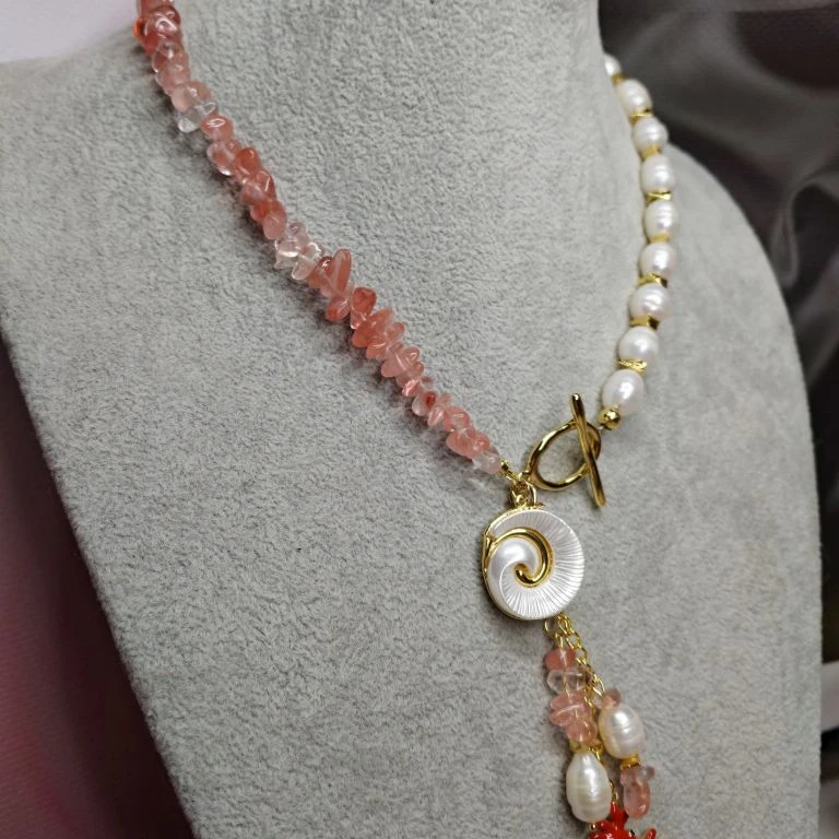 Комплект: колье, браслет и серьги из натурального речного жемчуга и кварца с подвесками. Длина колье 42 см, браслет 20 см + 5 см, серьги 4 см