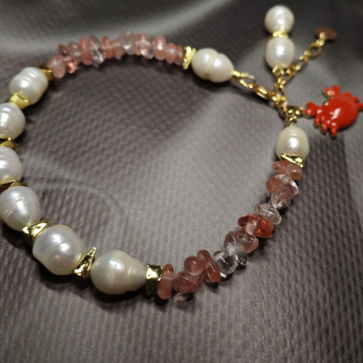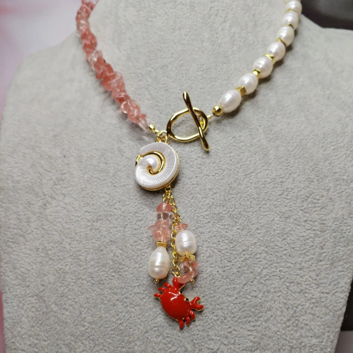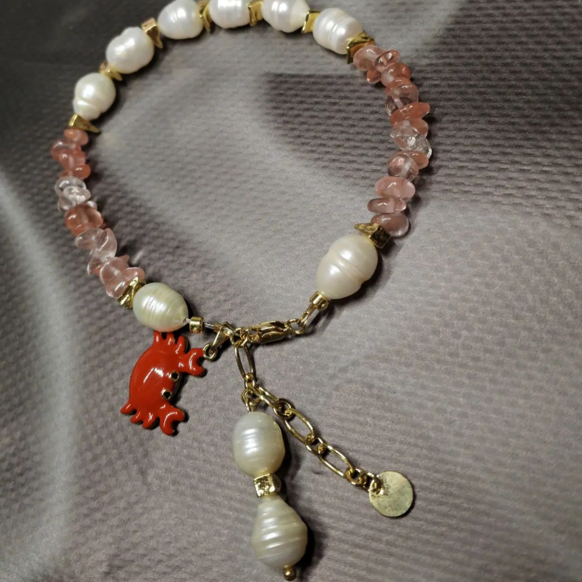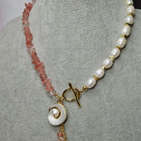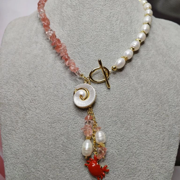 Комплект: колье, браслет и серьги из натурального речного жемчуга и кварца с подвесками. Длина колье 42 см, браслет 20 см + 5 см, серьги 4 см