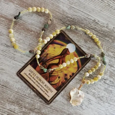 Сочетание желтой яшмы, хризопраза и морской раковины подчеркивает их индивидуальные свойства и потенциал для гармонизации энергетического баланса человека. Желтая яшма способствует стабильности, защите и уверенности, активизируя энергию физического мира и материальных целей. Хризопраз помогает открыть сердце, привлечь удачу и поддержать эмоциональное исцеление, способствуя росту и новым возможностям. Морская раковина символизирует интуицию, внутренний поток и защиту водной стихии, успокаивая ум и укрепляя связь с подсознанием.