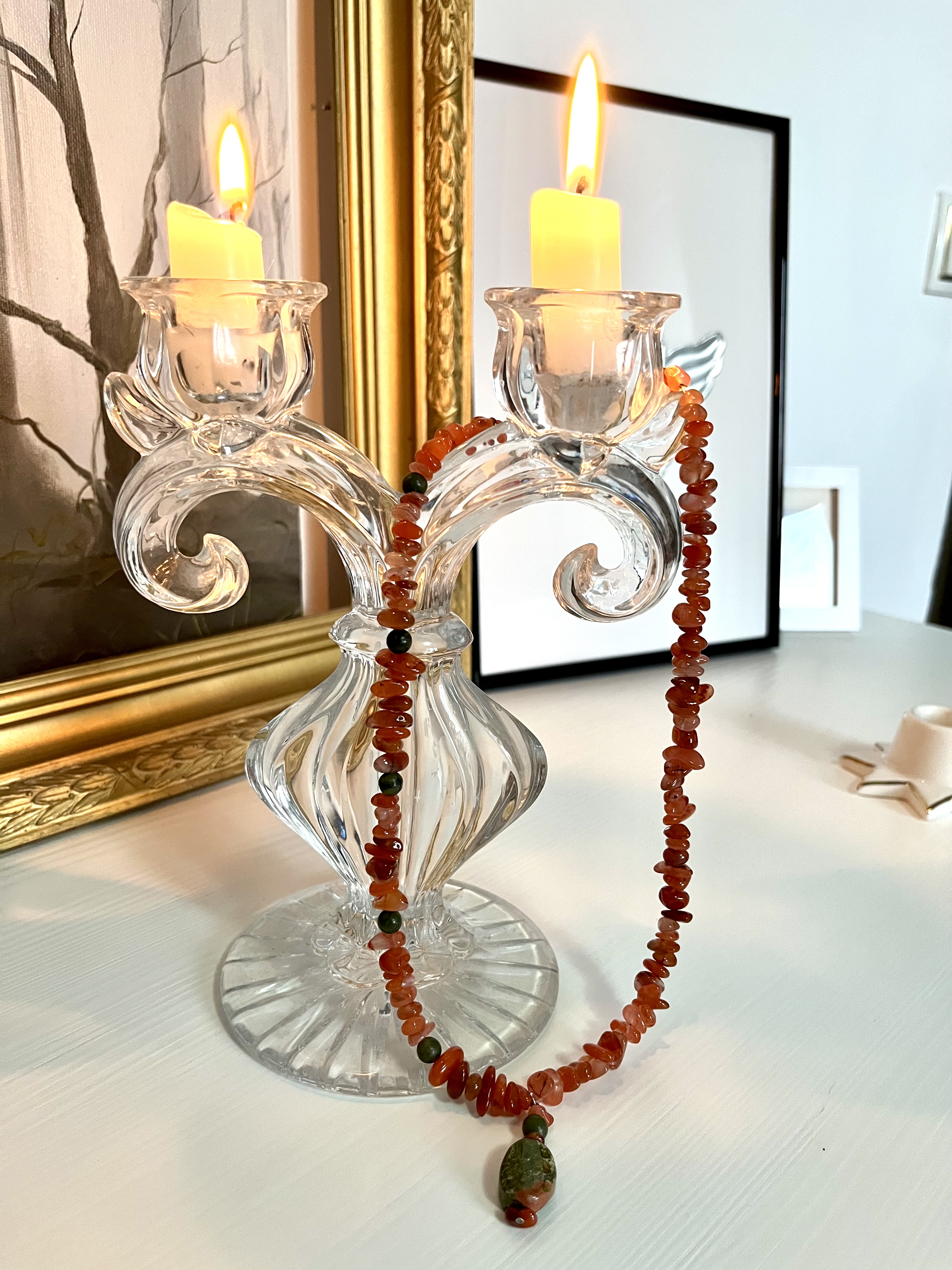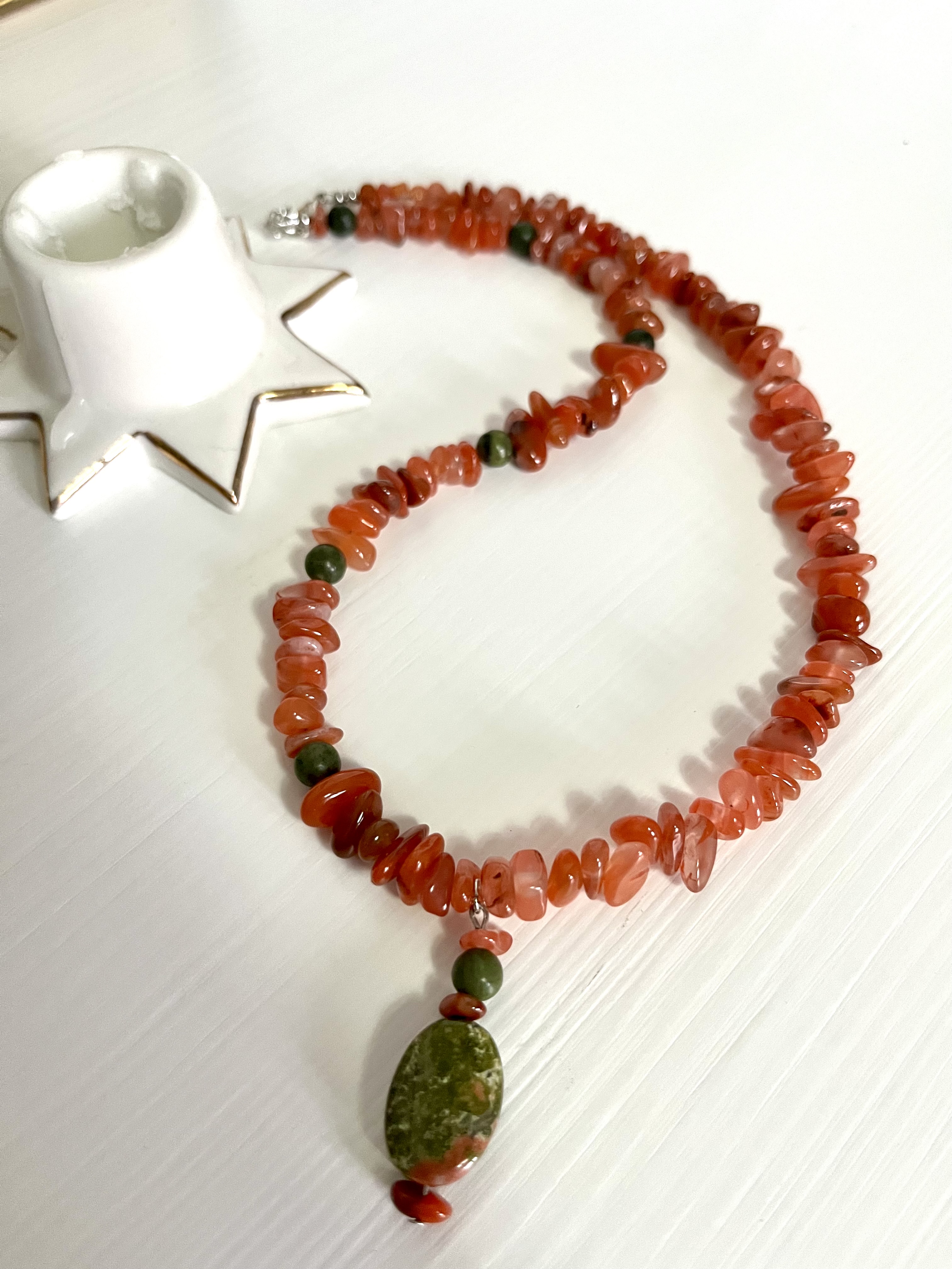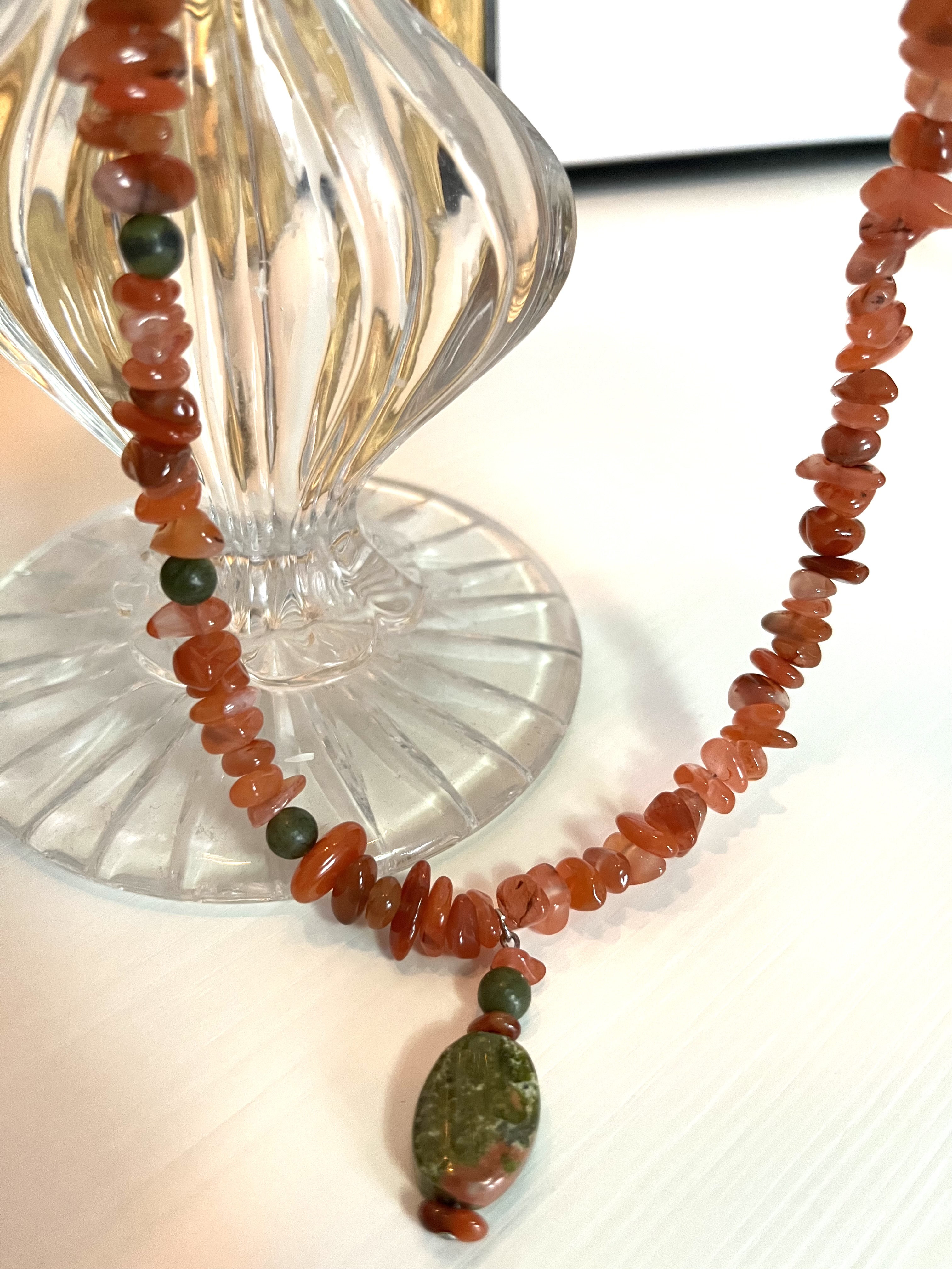 Представляем вам изысканное колье, в котором тепло солнечного сердолика гармонично сочетается с глубиной зелёного нефрита и мистической фактурой зеленой яшмы. Это украшение создано для тех, кто ценит не просто аксессуары, а настоящие обереги, наделенные природной силой.