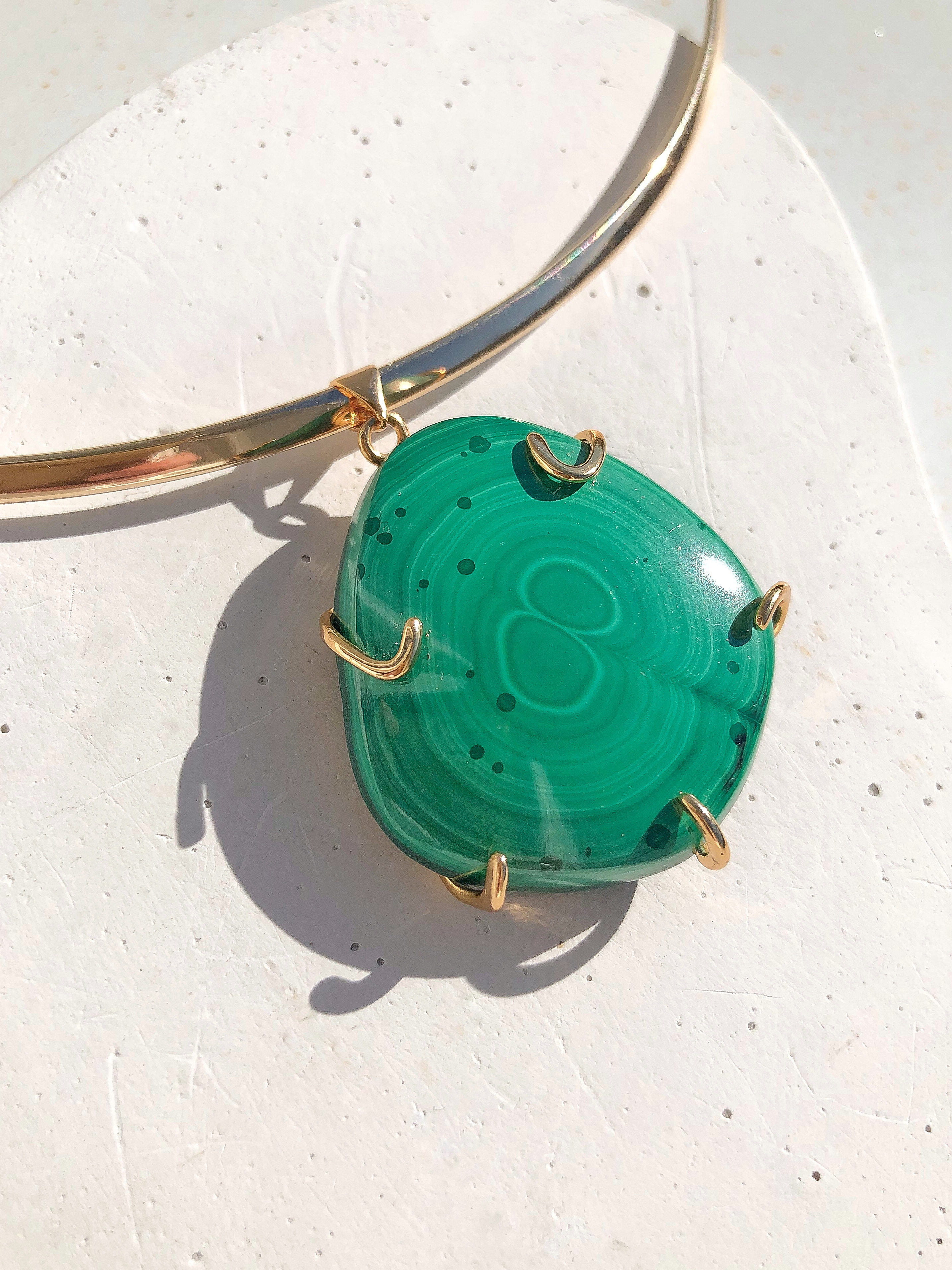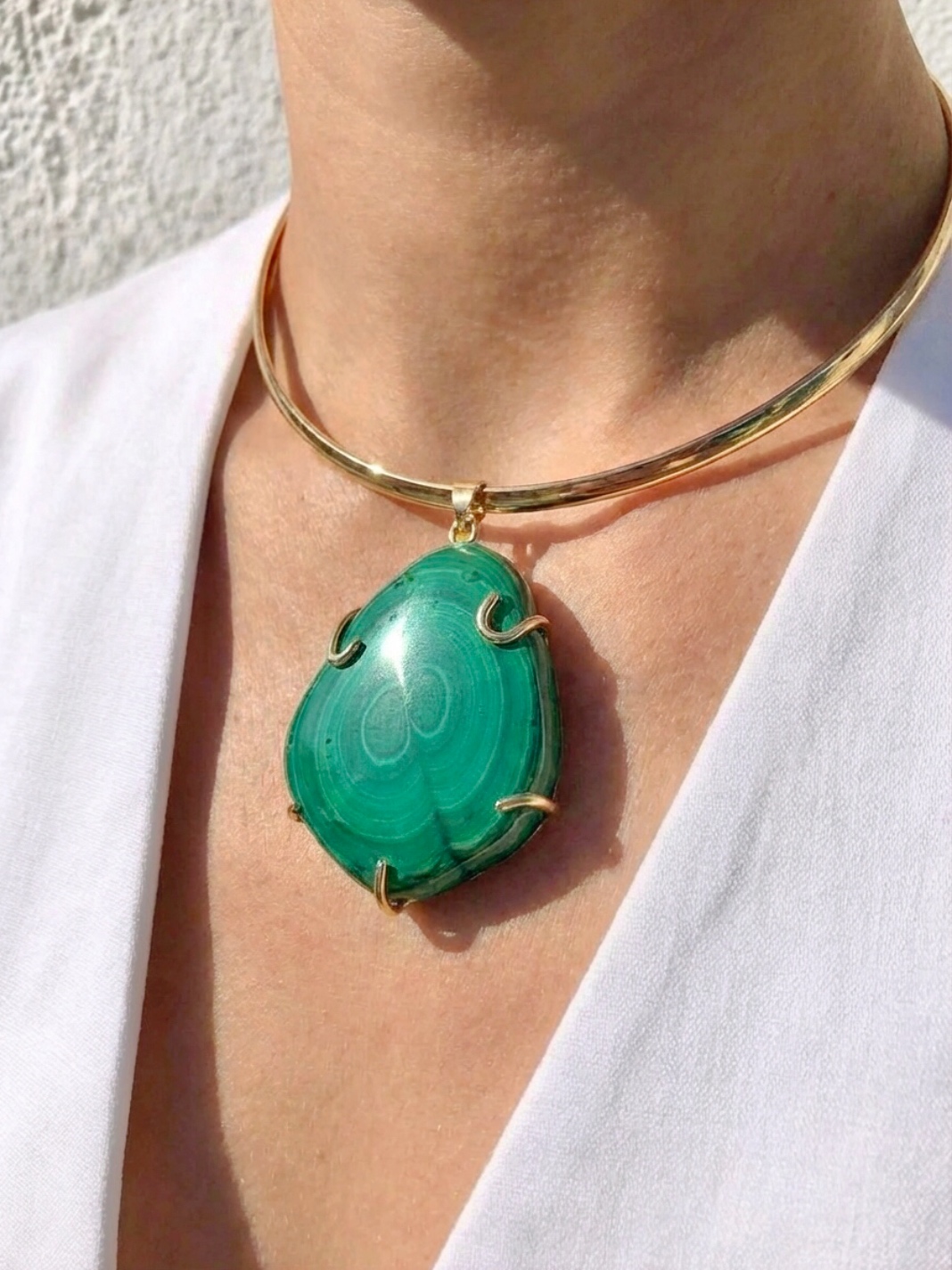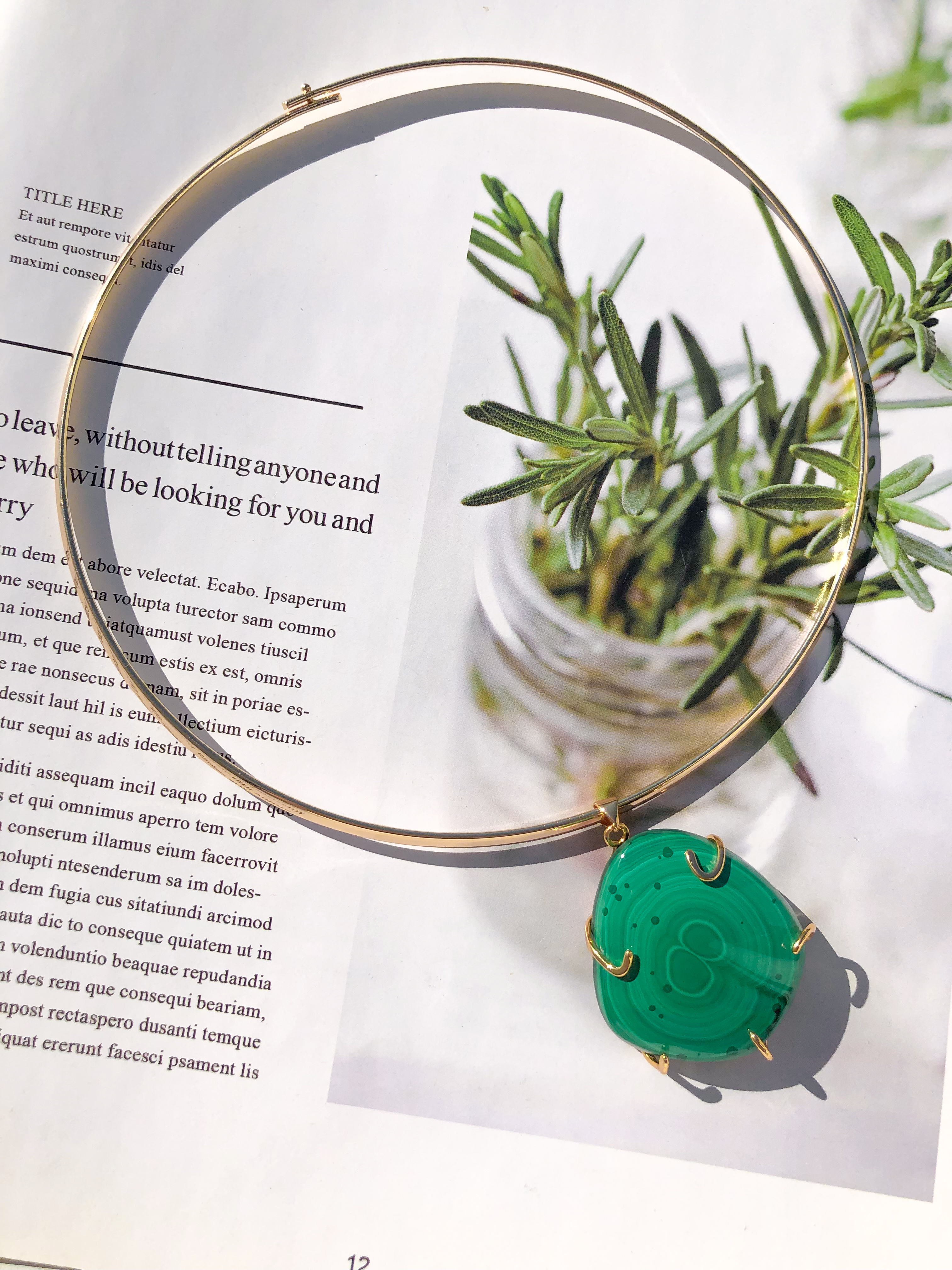 Стильный чокер-обод из позолоченного бижутерного сплава подчеркивает цвет малахита, насыщает его теплыми нотами, делая украшение ультрасовременный и универсальным, подходящим для образов в любой стилистике.