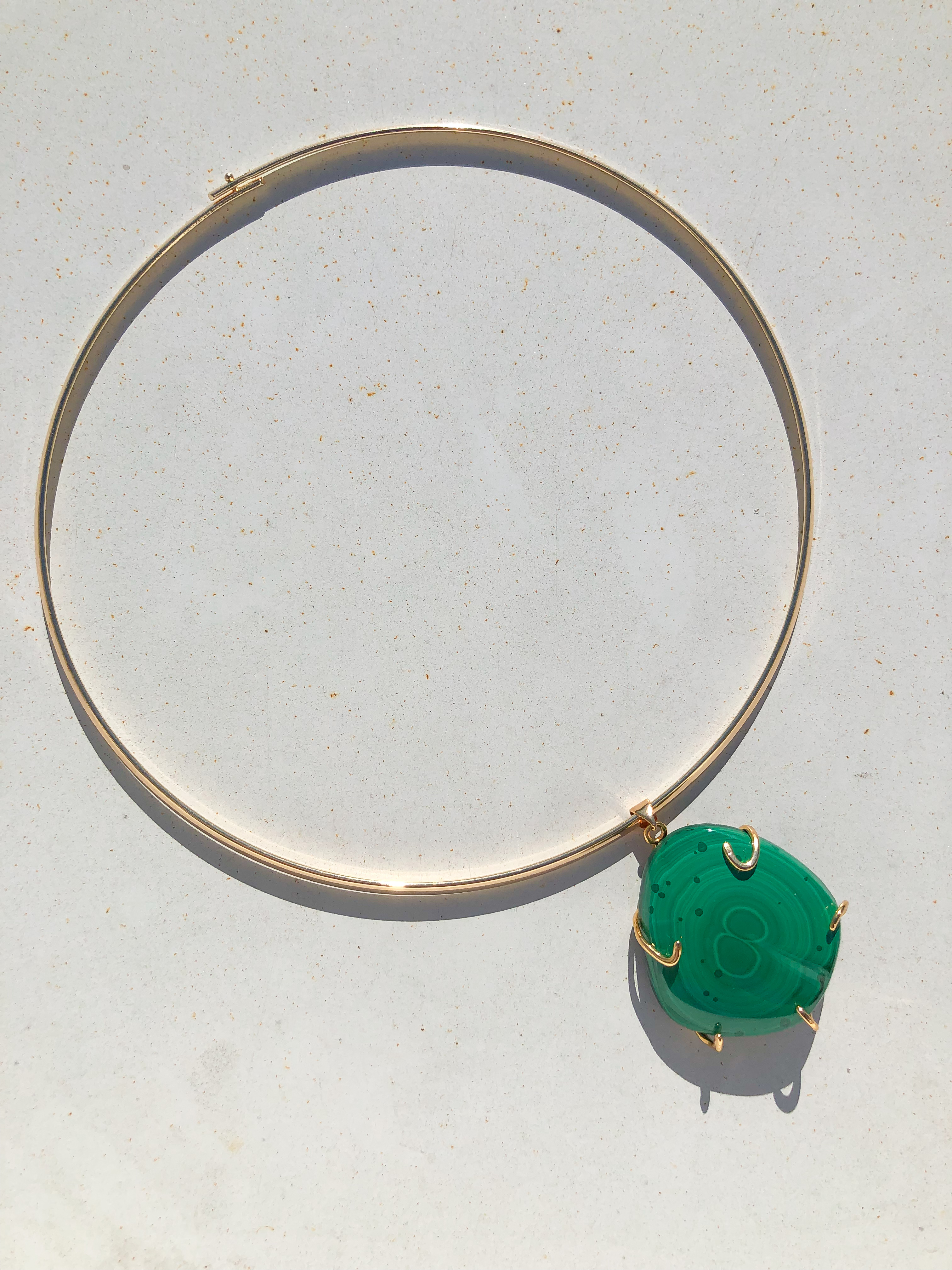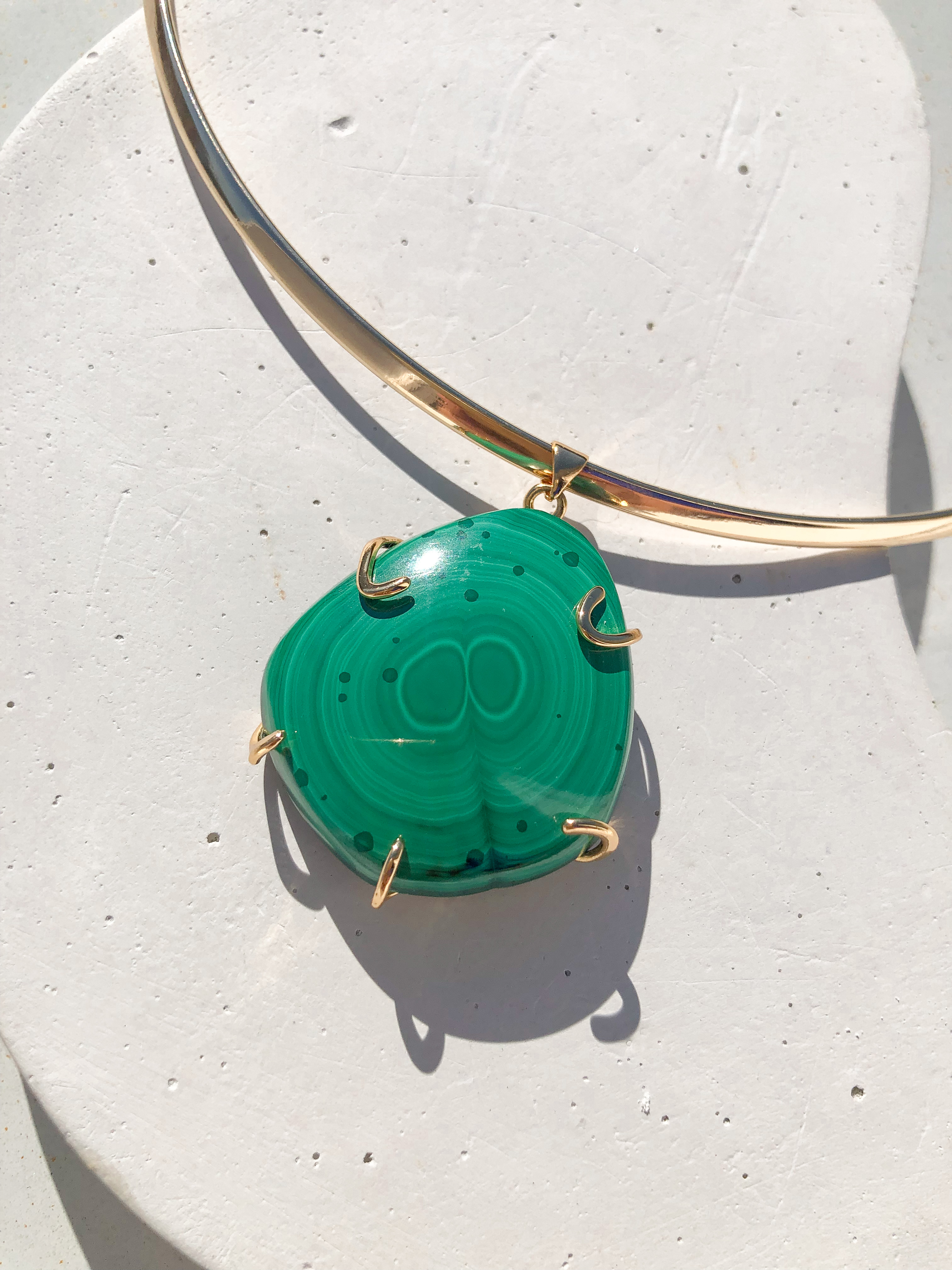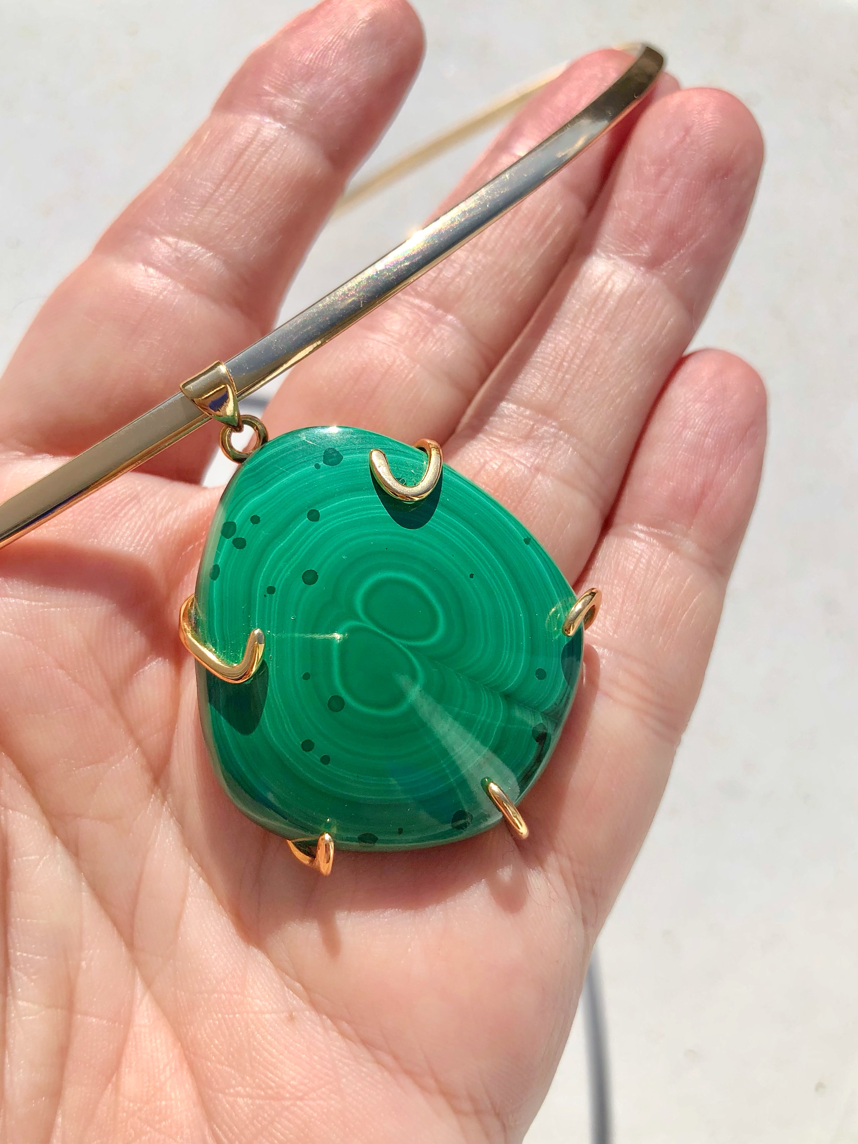 Стильный чокер-обод из позолоченного бижутерного сплава подчеркивает цвет малахита, насыщает его теплыми нотами, делая украшение ультрасовременный и универсальным, подходящим для образов в любой стилистике.
