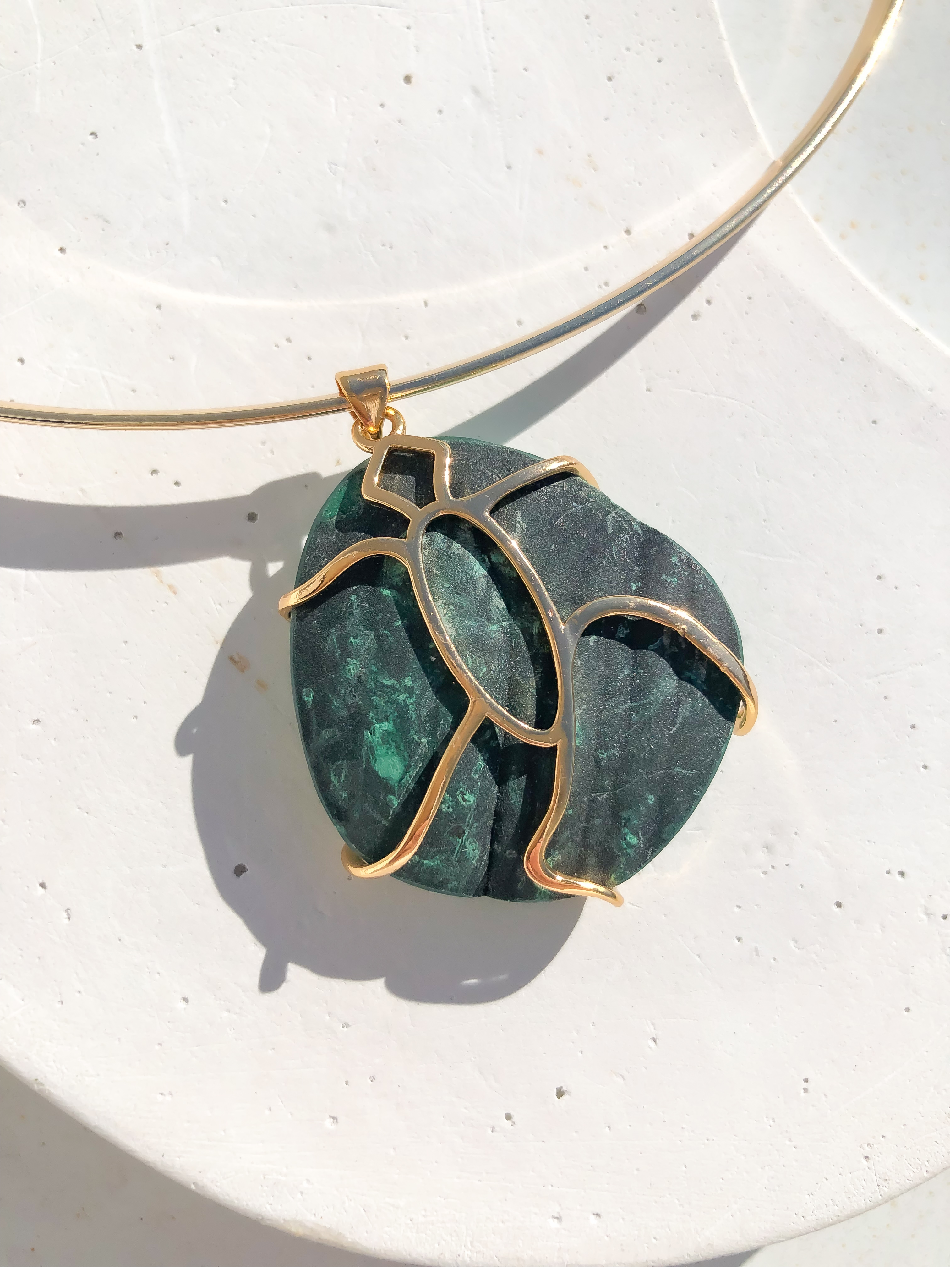 Стильные современное колье-чокер с трендовой крупной подвеской из натурального камня — малахита.