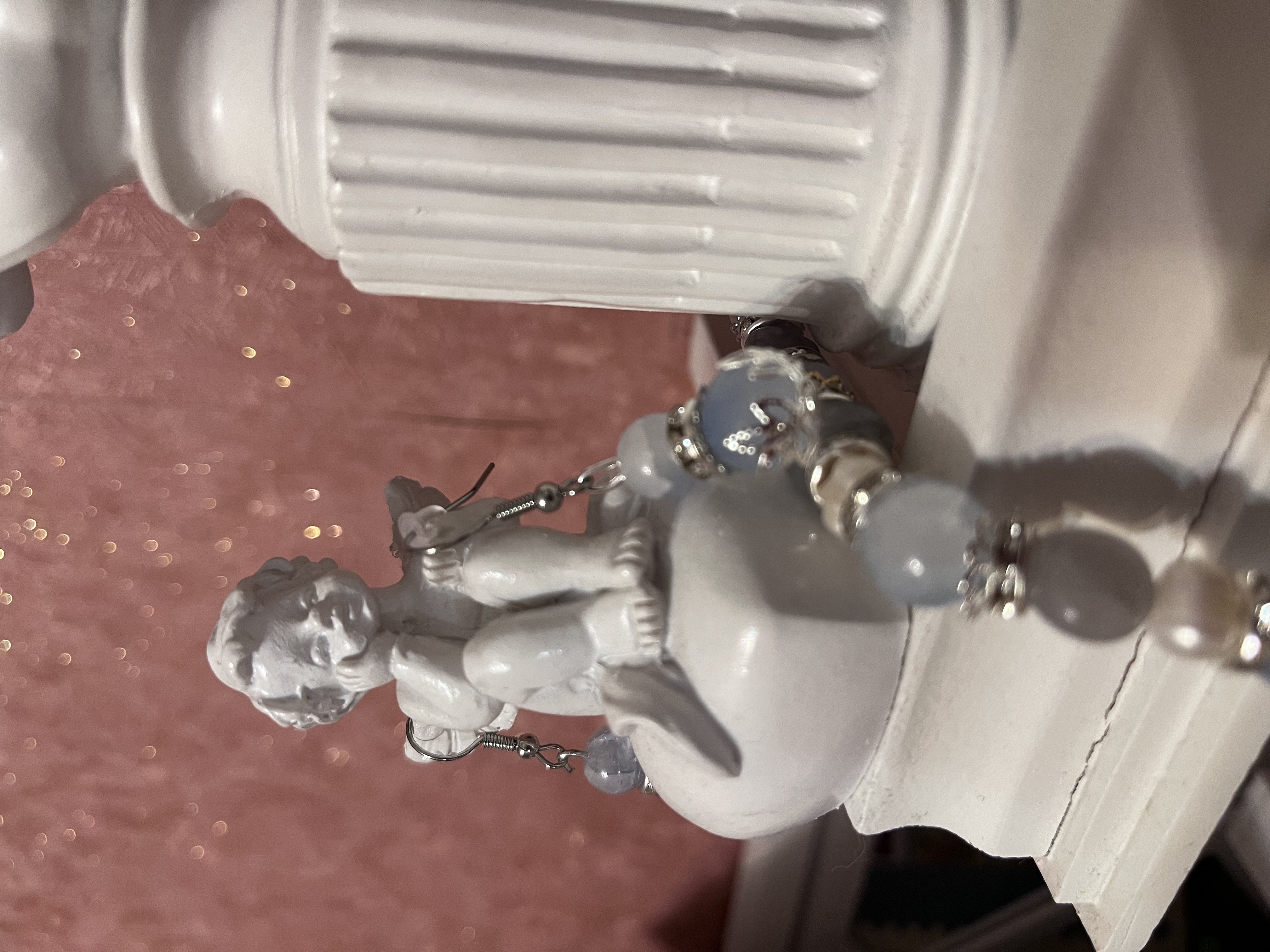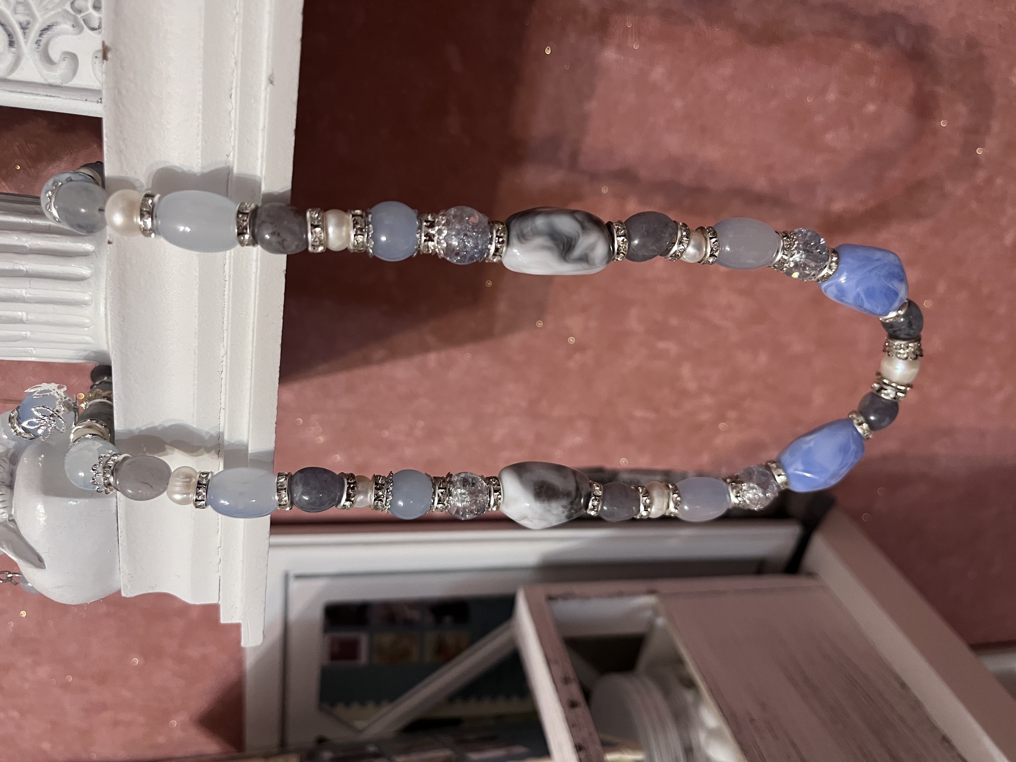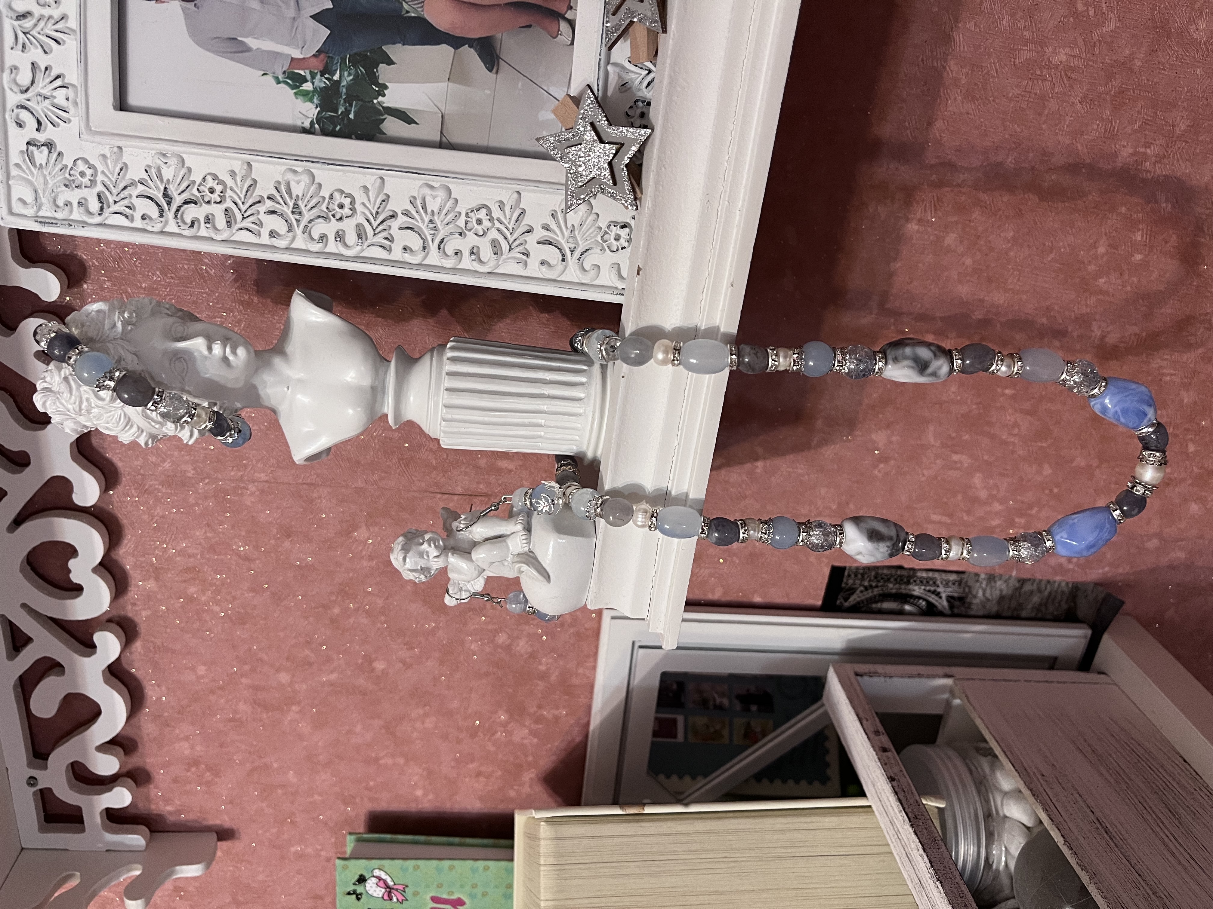 Комплект прекрасно дополнит коллекцию «для молодых дам», передавая хрупкость и утонченность юной женщины. Фьюжн из бусин натурального камня, жемчужин, пластмассовых и стеклянных бусин как будто сливаются в кружение первого бала. Маленькая капля сережек у шаловливого завитка волос притягивает поцелуй. Подойдет к глазам голубого, серого и холодных оттенков кожи.