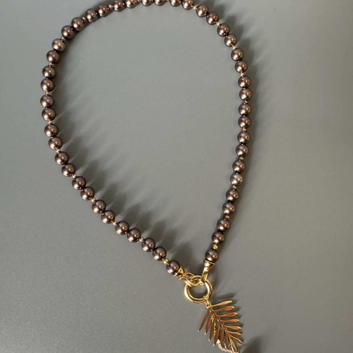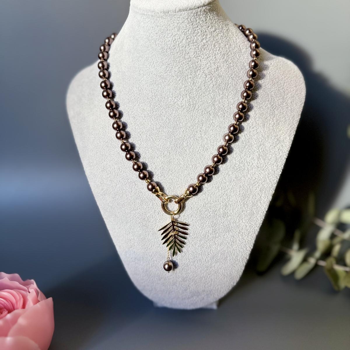 Колье из шоколадного жемчуга майорка, подвеска лист пальмы позолота.