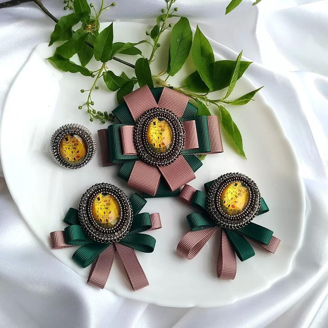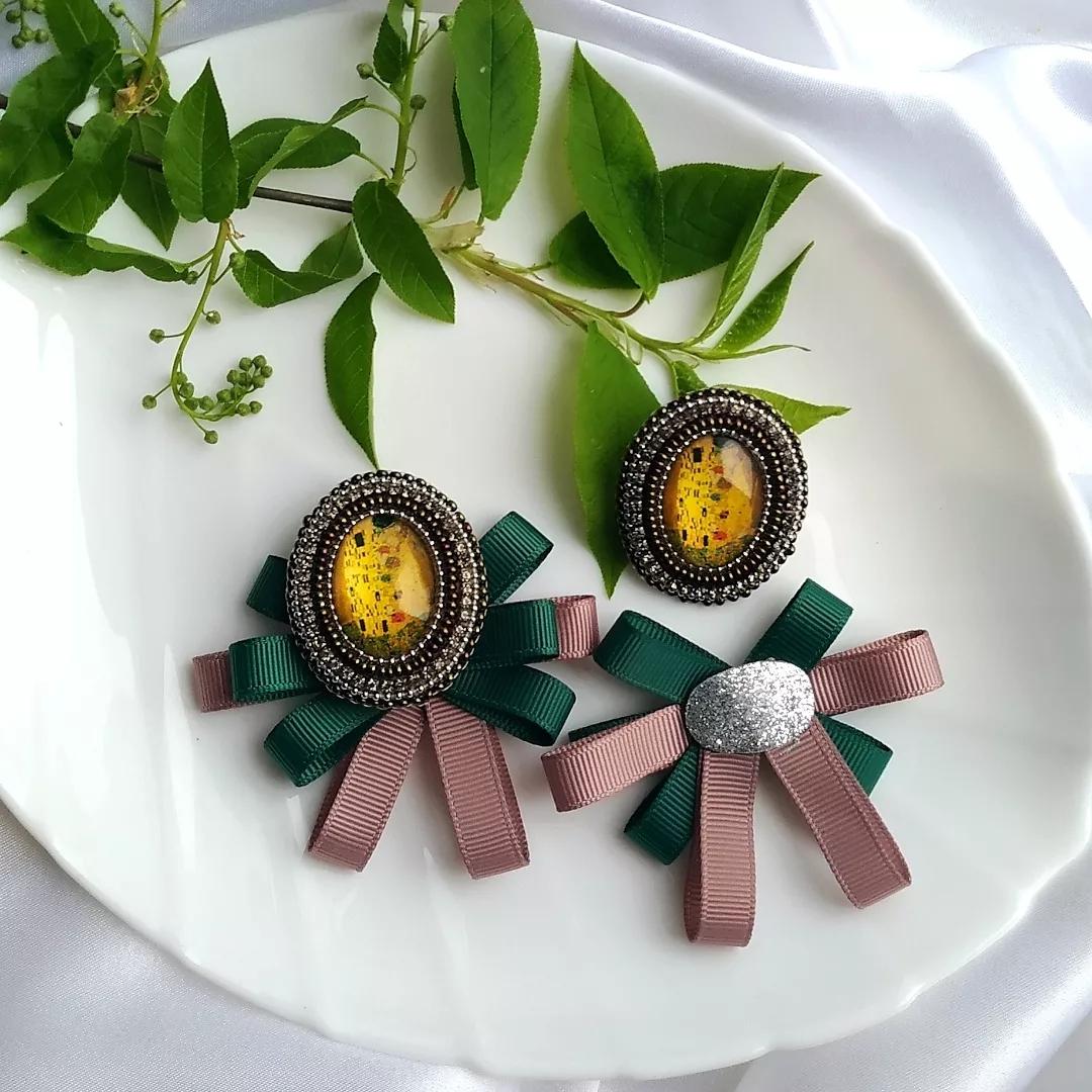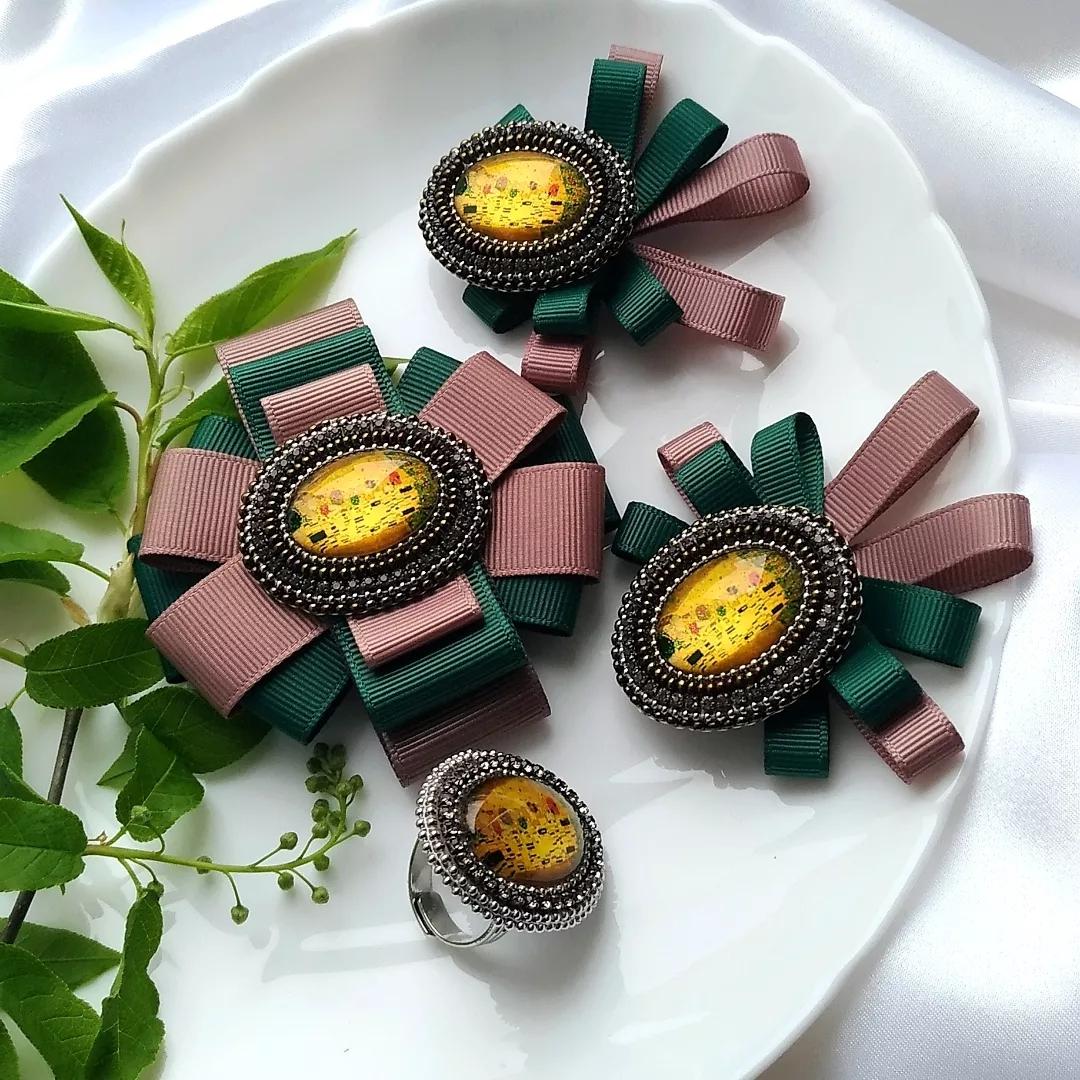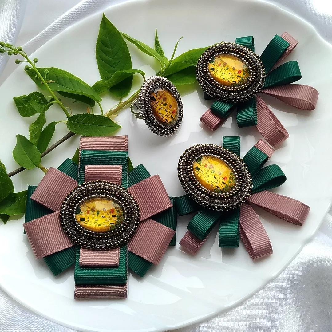 Материалы: кабошоны стекло, стразовая цепочка, чешский бисер, фурнитура хирургическая сталь, репсовые ленты, основа для сережек итальянский замок, основа для броши японская булавка.