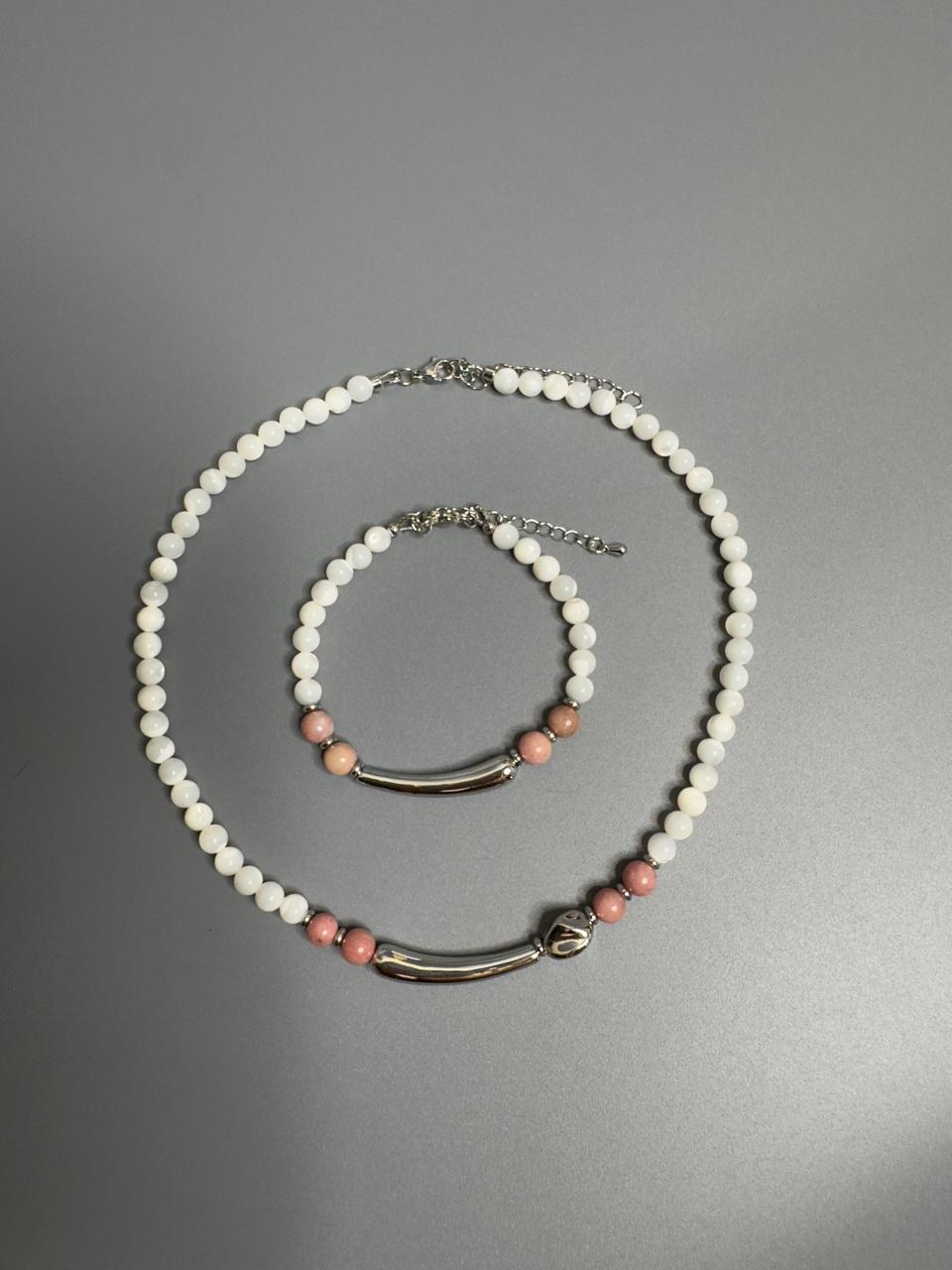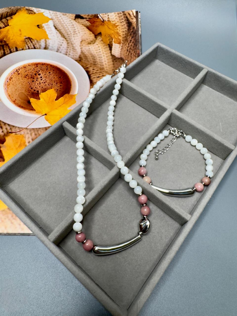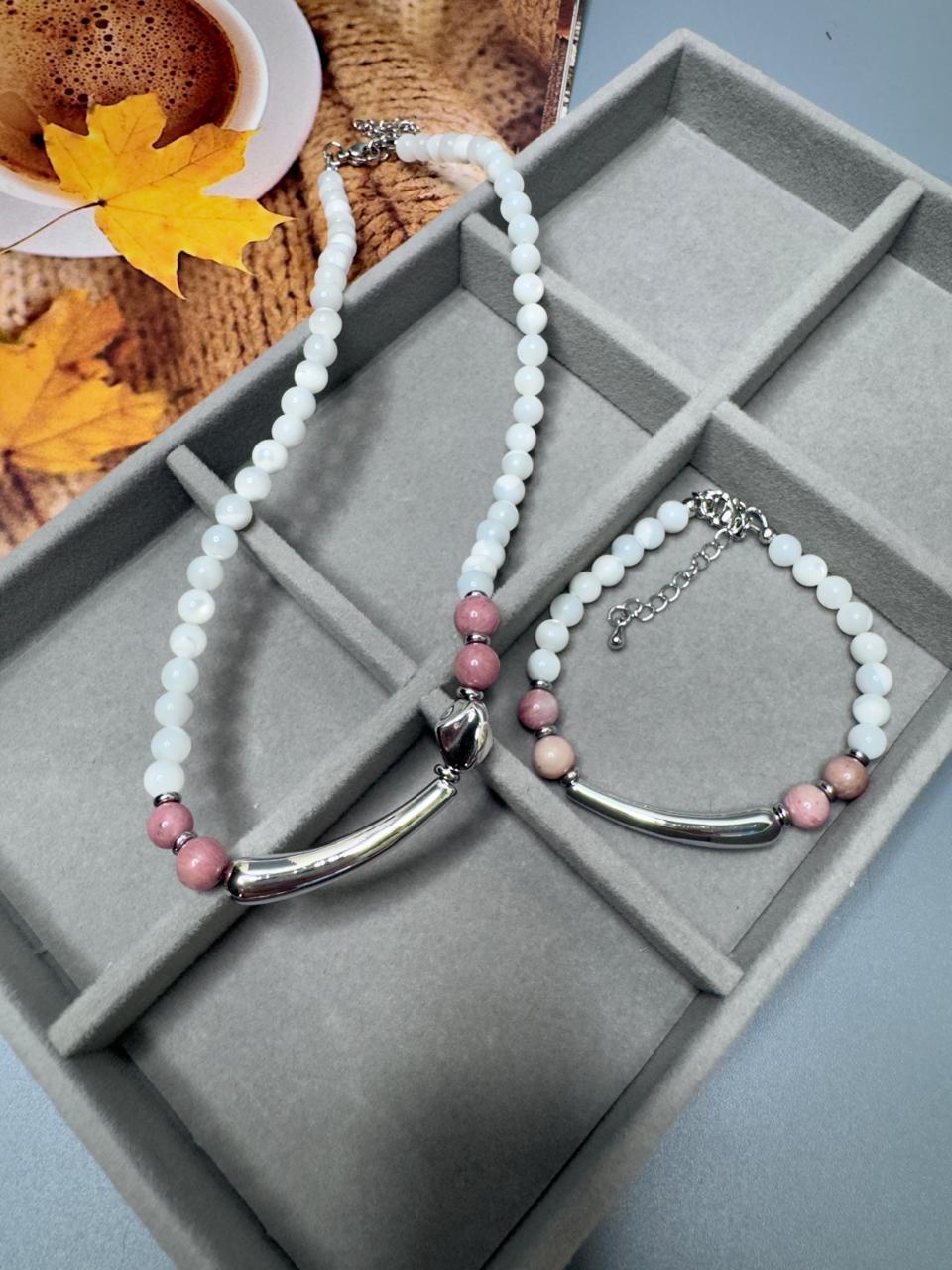 •Перламутр - это застывший лунный свет. Его мягкое, переливчатое сияние окутывает заботой и дарит ощущение тихой радости. Он успокаивает, и напоминает о вашем внутреннем свете. •Родонит - это камень сердца. Его нежно-розовые, с прожилками узоры, полны тепла и сострадания. Он помогает исцелить старые раны, открыться любви и почувствовать уверенность в завтрашнем дне.