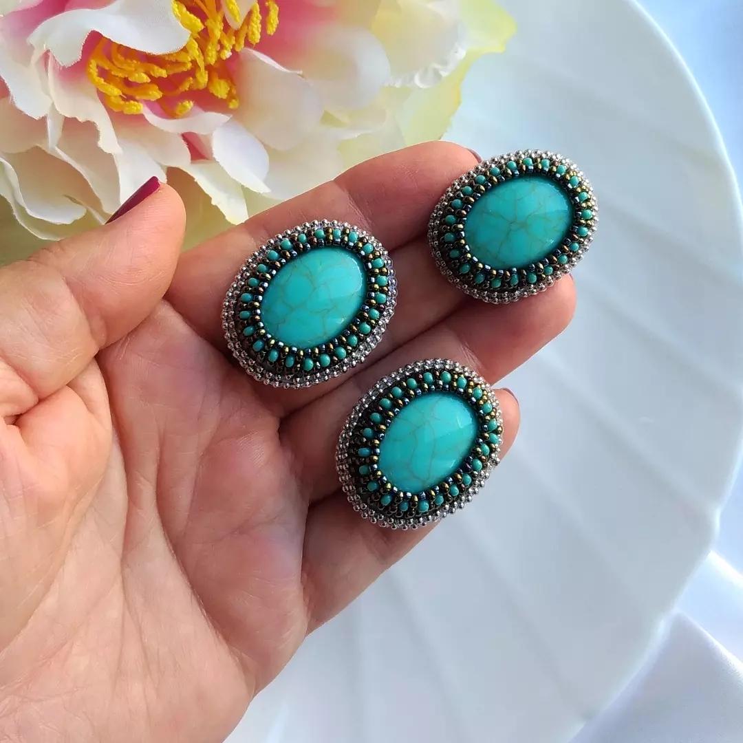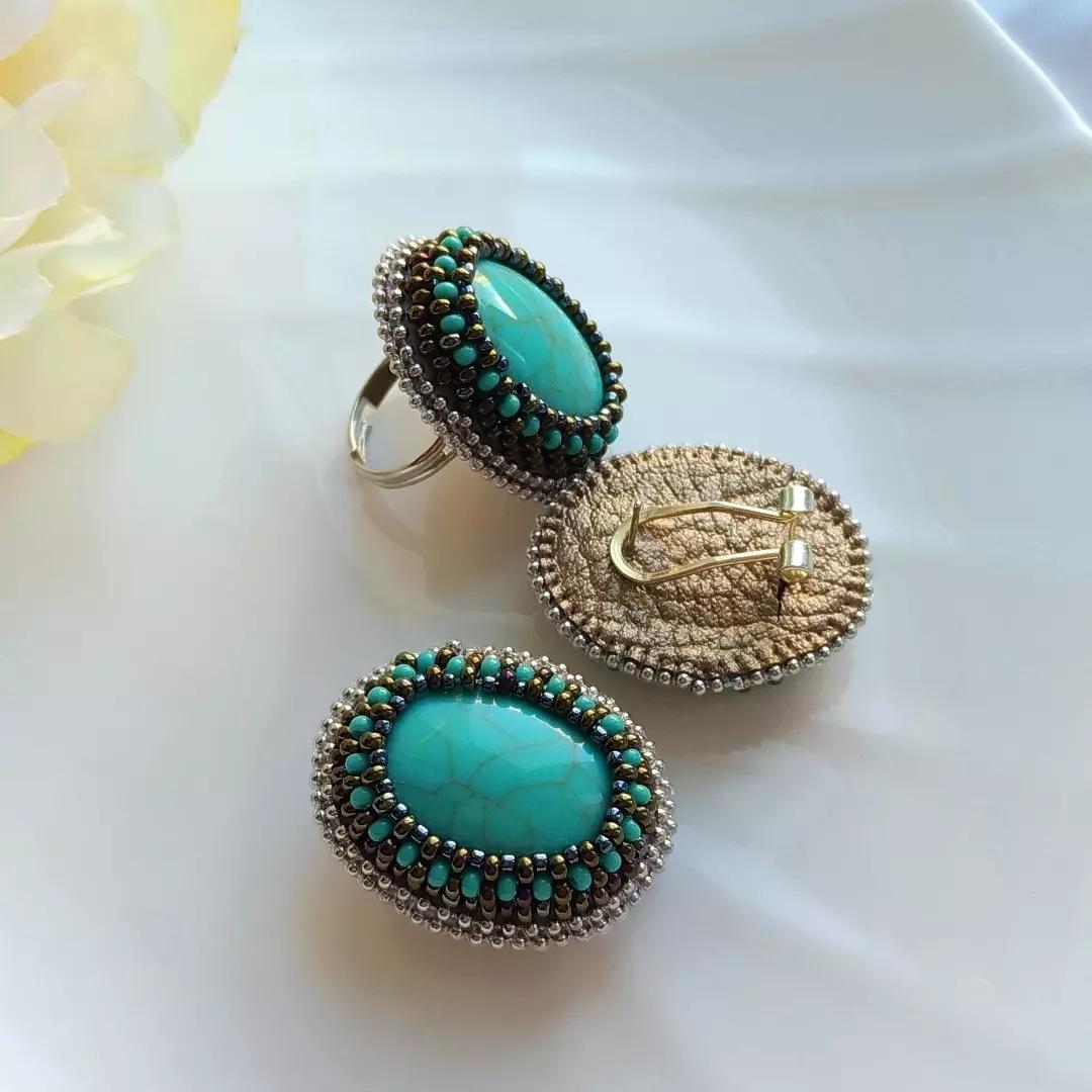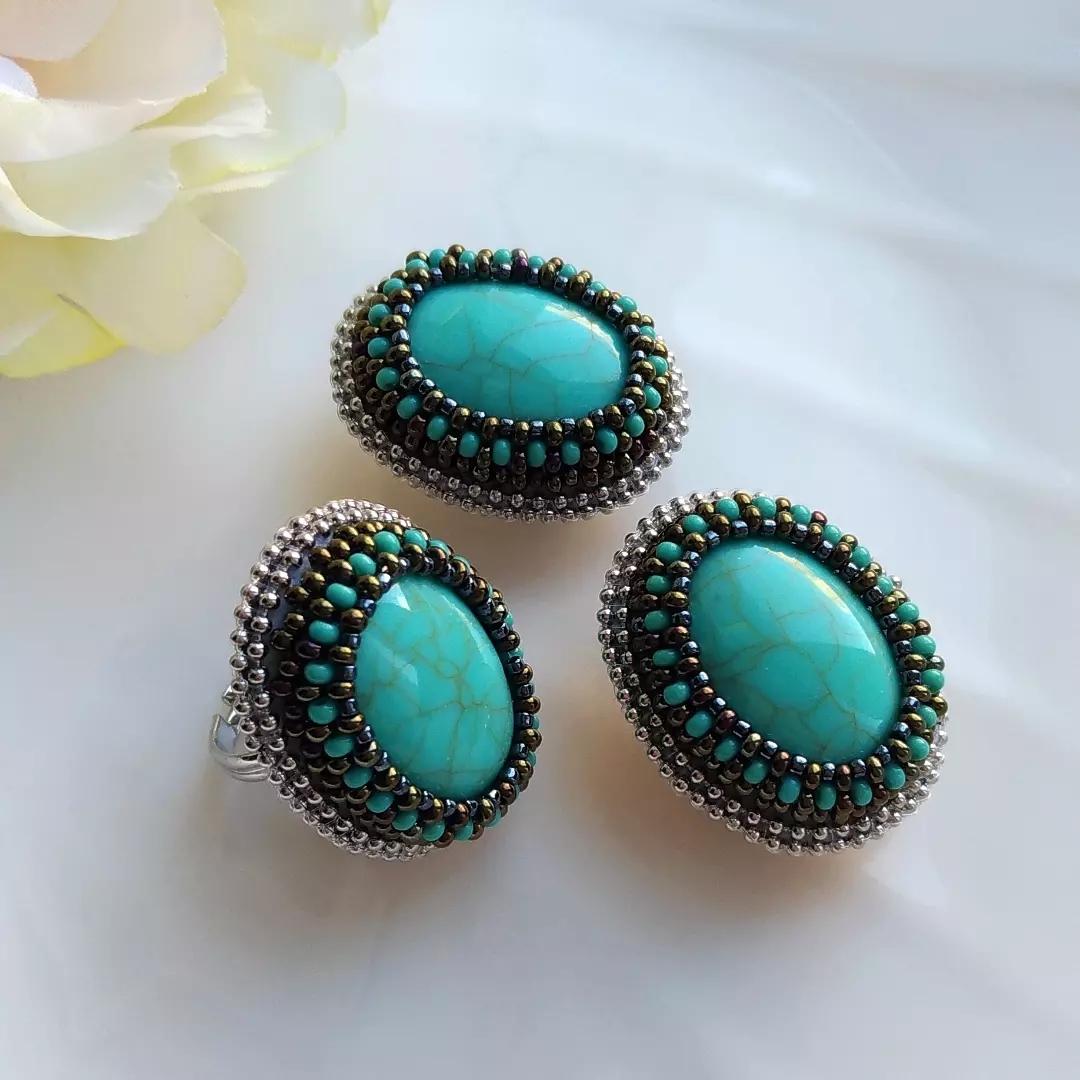 Материал: кабошон под бирюзу, японский бисер Toho, чешский бисер, фурнитура хирургическая сталь, серьги итальянский замок, кольцо безразмерное.