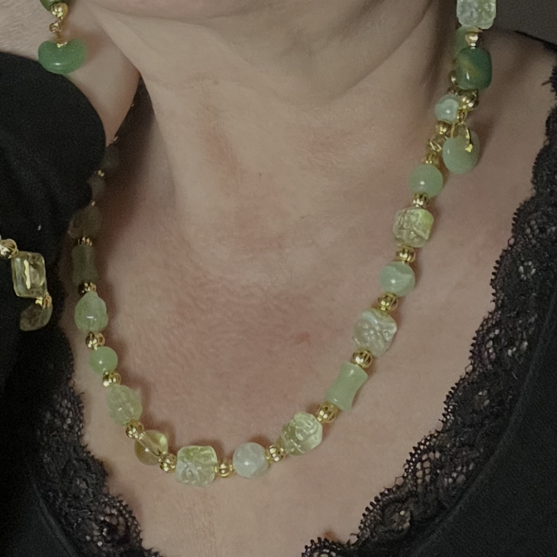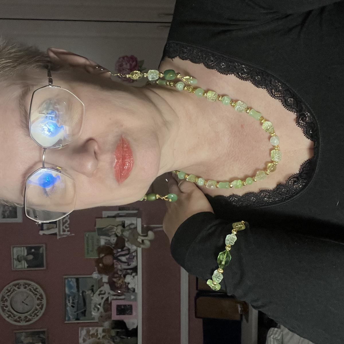 Зеленый оттенок искусственного кварца просится оттенить цвет кожи и глаза рыжеволосых красавиц! Комплект короткого колье, сережек и браслета никого не оставит равнодушным