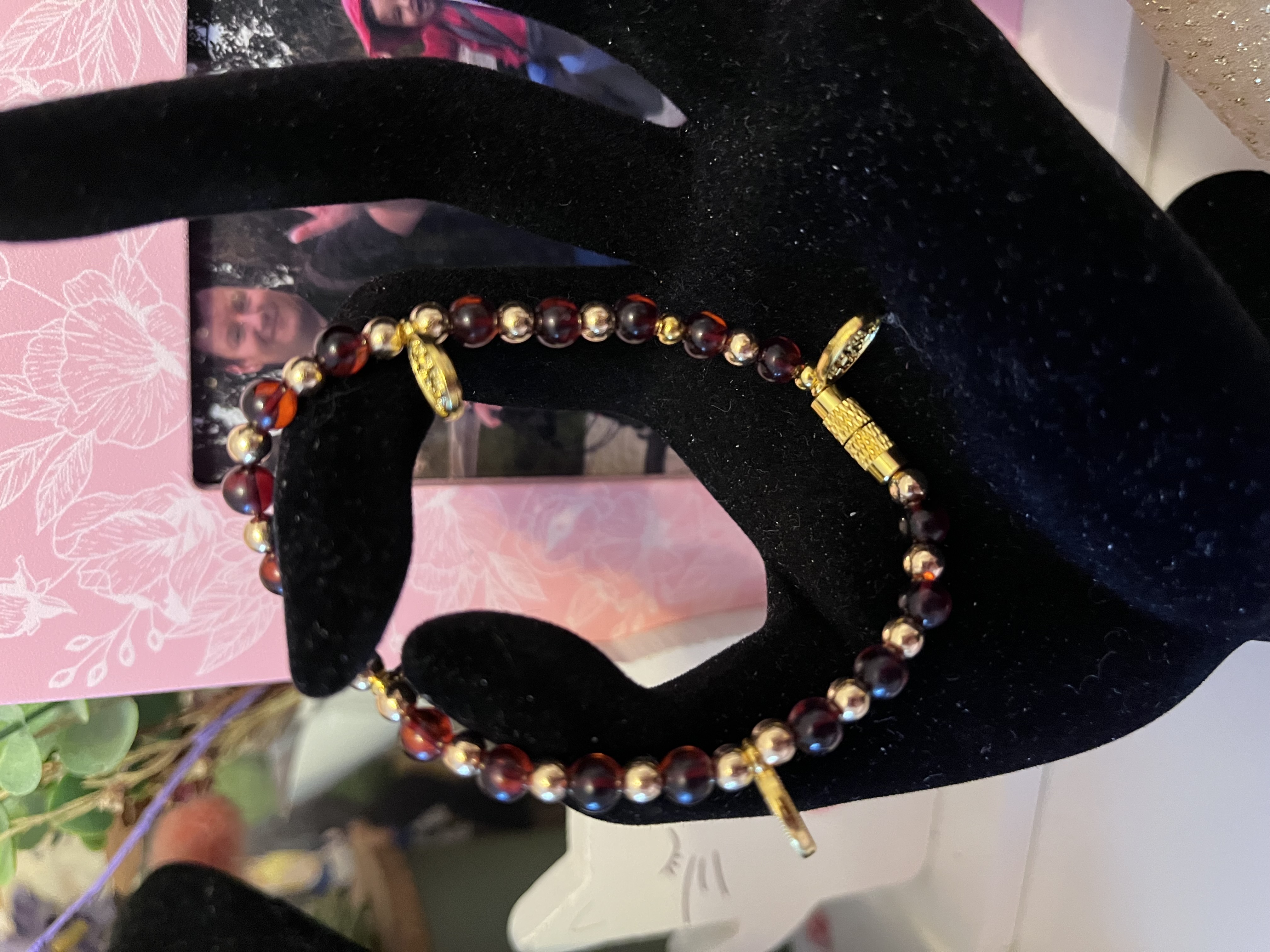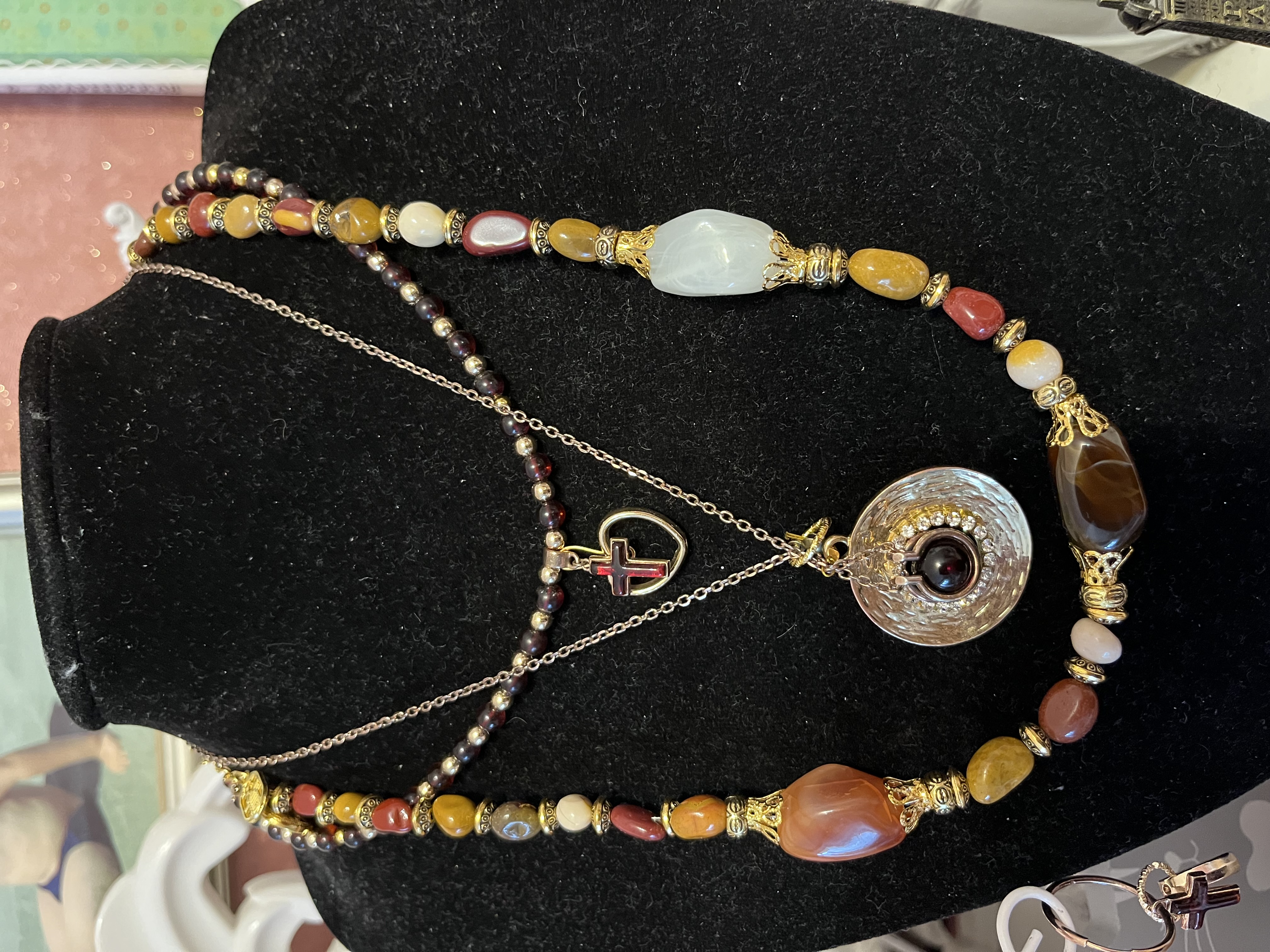 Редкий оттенок янтаря - темно-вишневый- является основой композиции, состоящей из чокера с подвеска -крестиком, серебряной цепочки с крупным золотистым медальоном с подвеской из янтаря в центре и игривых бус, в которых есть все оттенки шоколада. Серьги- кольца с подвесками крестиками поддерживают композицию, так же как и браслет на леске-резинке с денежными талисманами. Носите вместе или раздельно