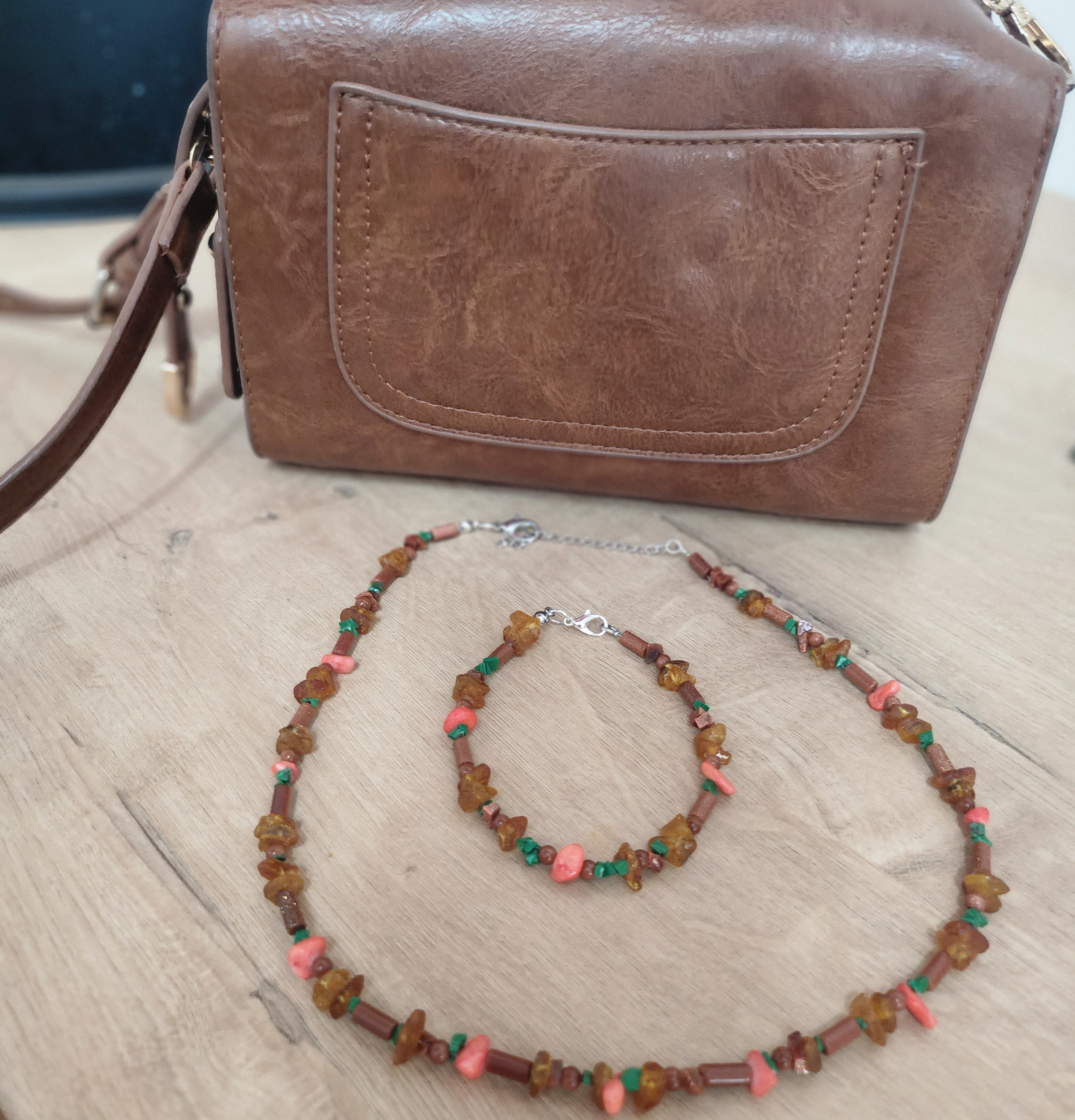 Колье и браслет, на тросе с камнями, яшма, крошка малахита, коралл, цитрин.