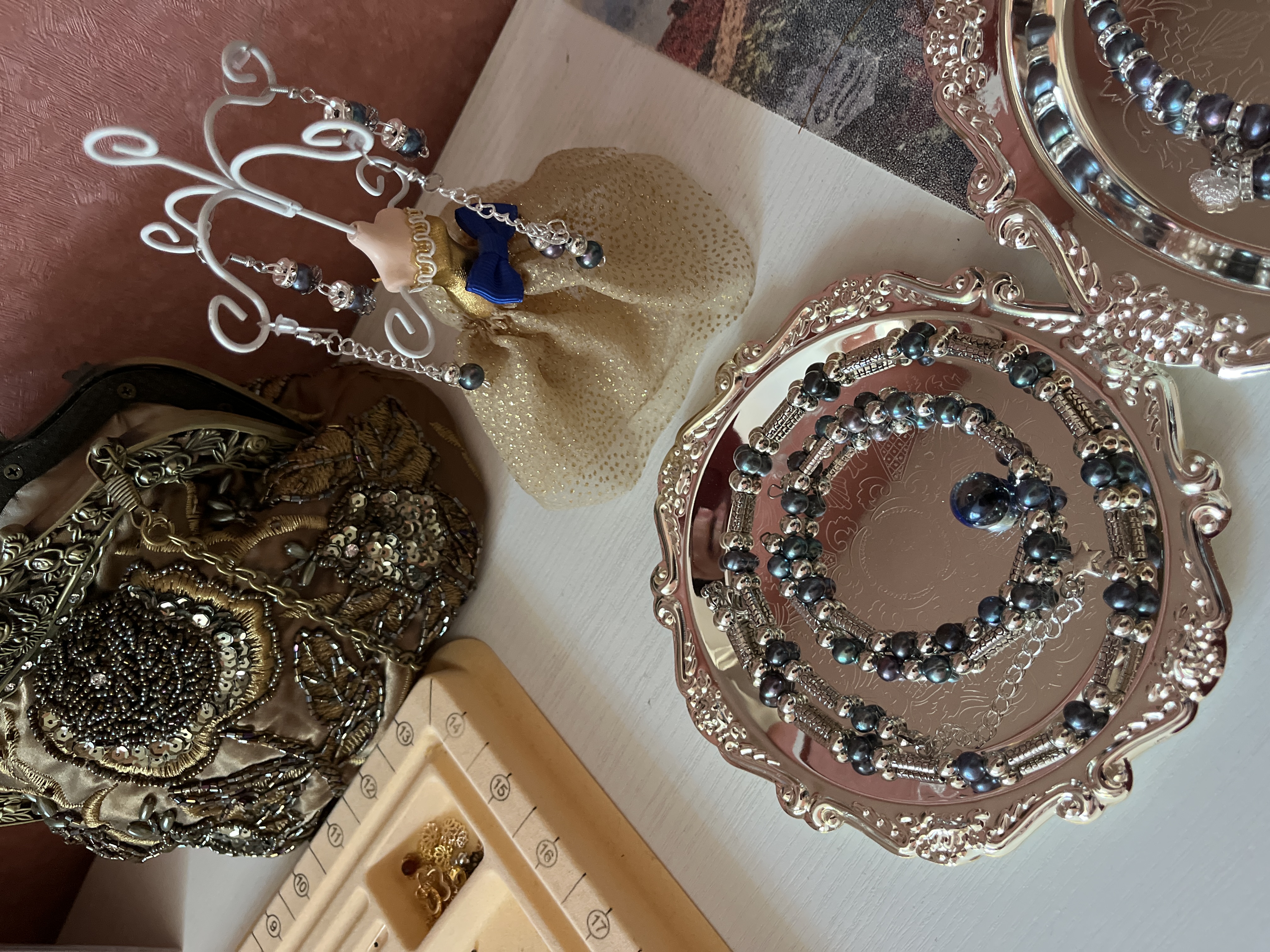 Комплект из колье, браслета и серег-подвесок с речным черным жемчугом и серебристой фурнитурой лаконичного дизайна.
