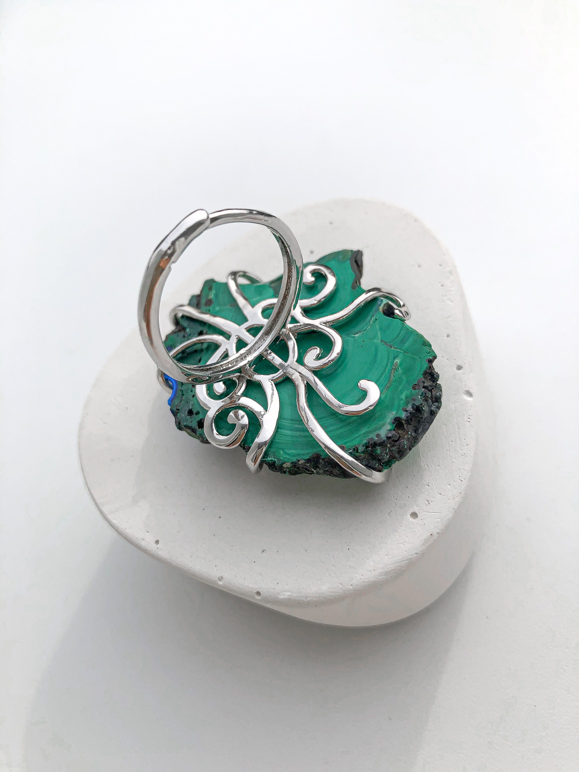 Женское безразмерное кольцо ручной работы с натуральным малахитом — эффектное авторское украшение с ярким природным характером. Крупный кабошон неправильной формы выполнен из натурального малахита, добытого в России, в Кемеровской области, на Каменушенском карьере. Необработанный дикий край подчеркивает естественную красоту камня и делает кольцо особенно выразительным.