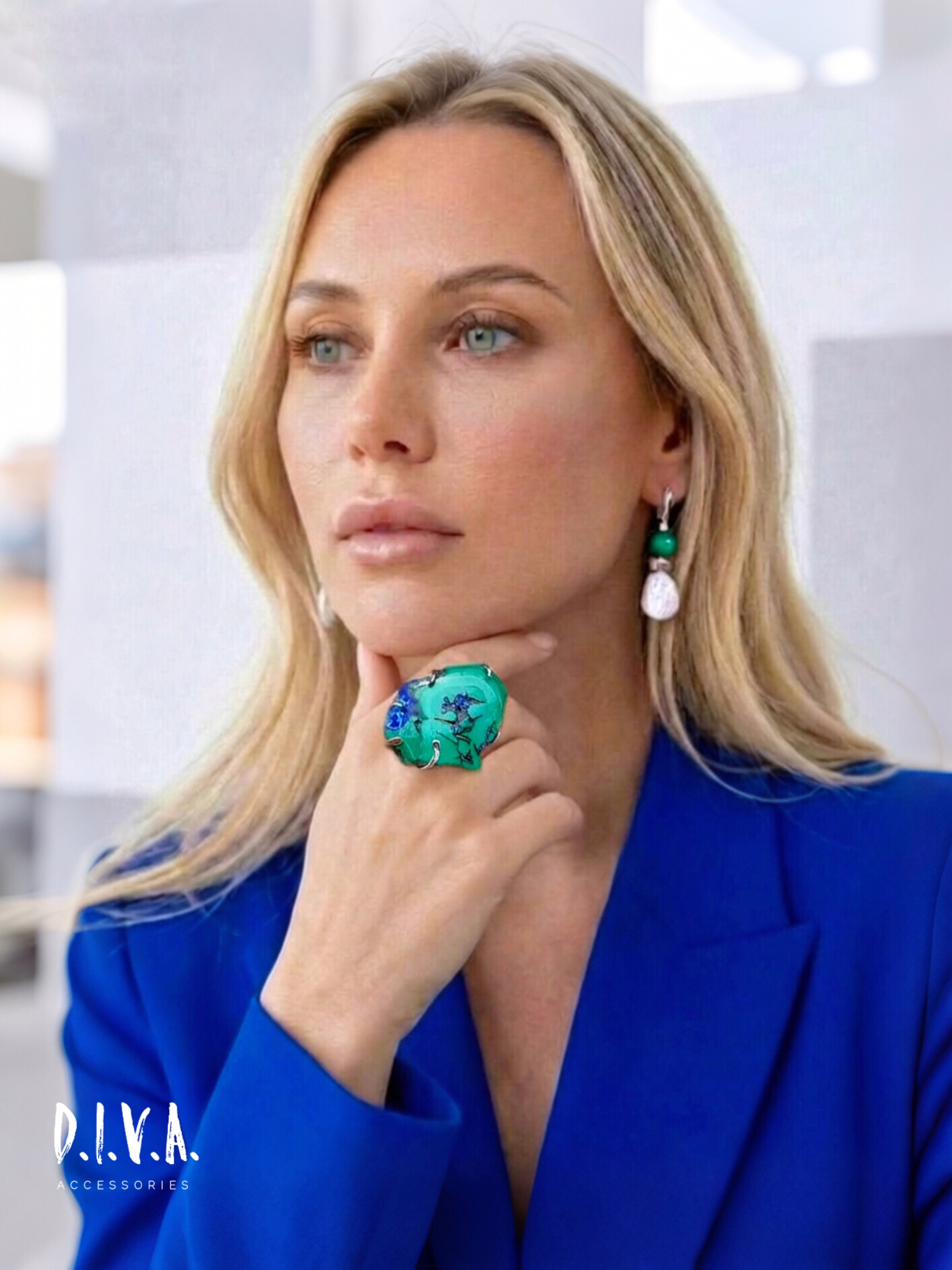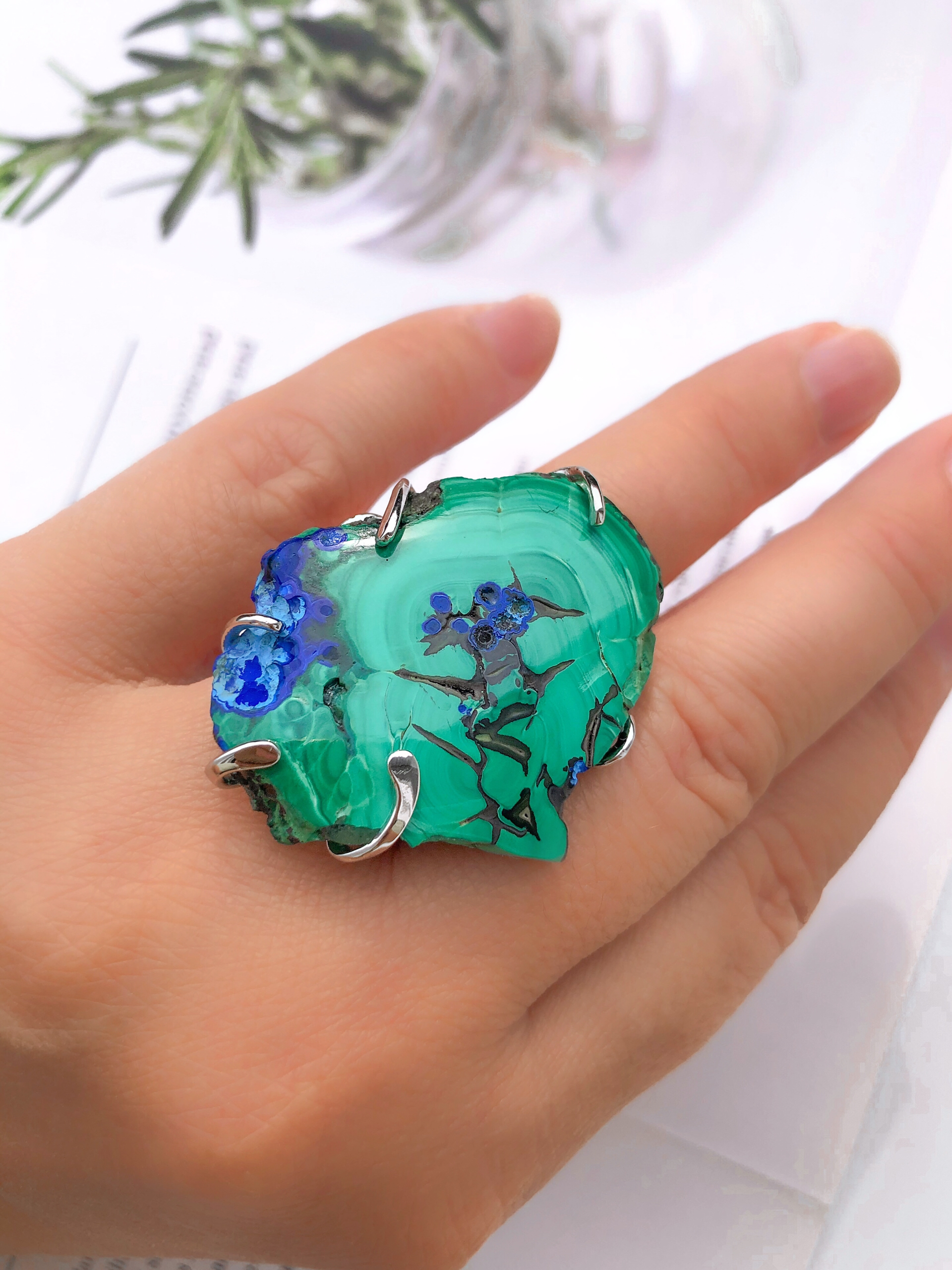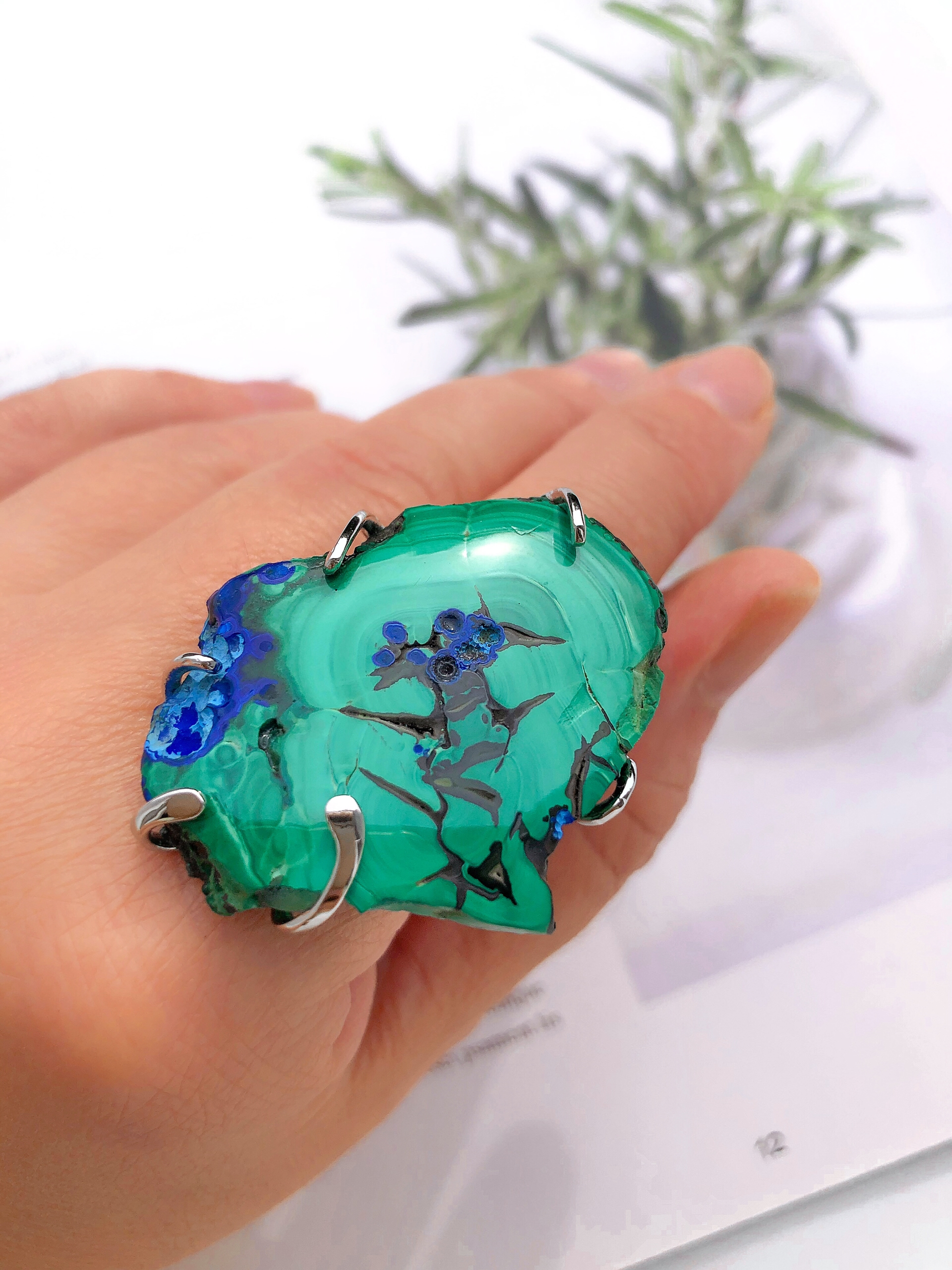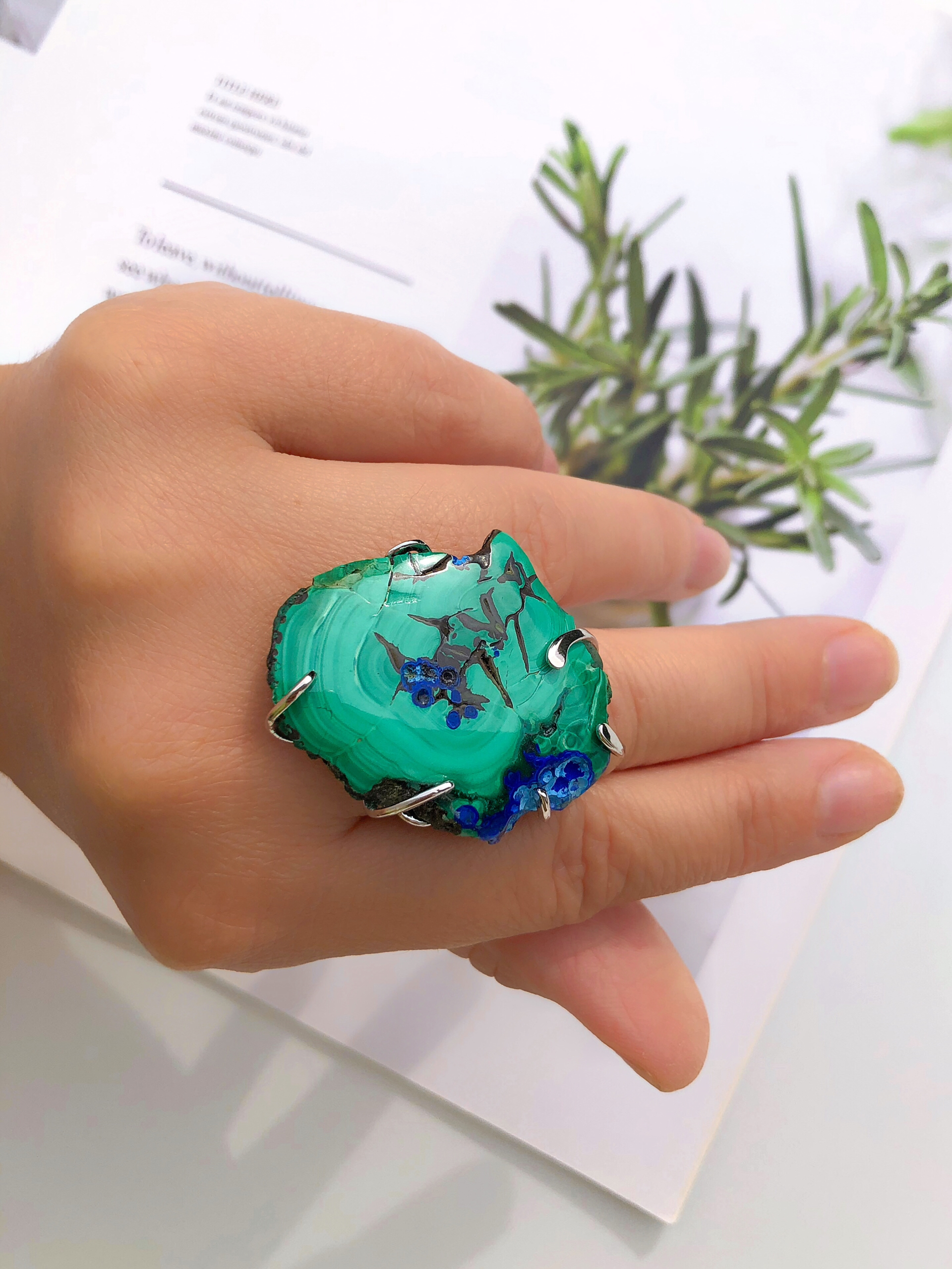 Малахит отличается насыщенным контрастным рисунком с красивыми природными переходами оттенков и вкраплениями азурита, благодаря которым каждое украшение выглядит уникально. Размер камня 40х35 мм делает кольцо заметным акцентом в образе — это украшение для тех, кто любит натуральные камни, крупные формы и индивидуальный стиль.