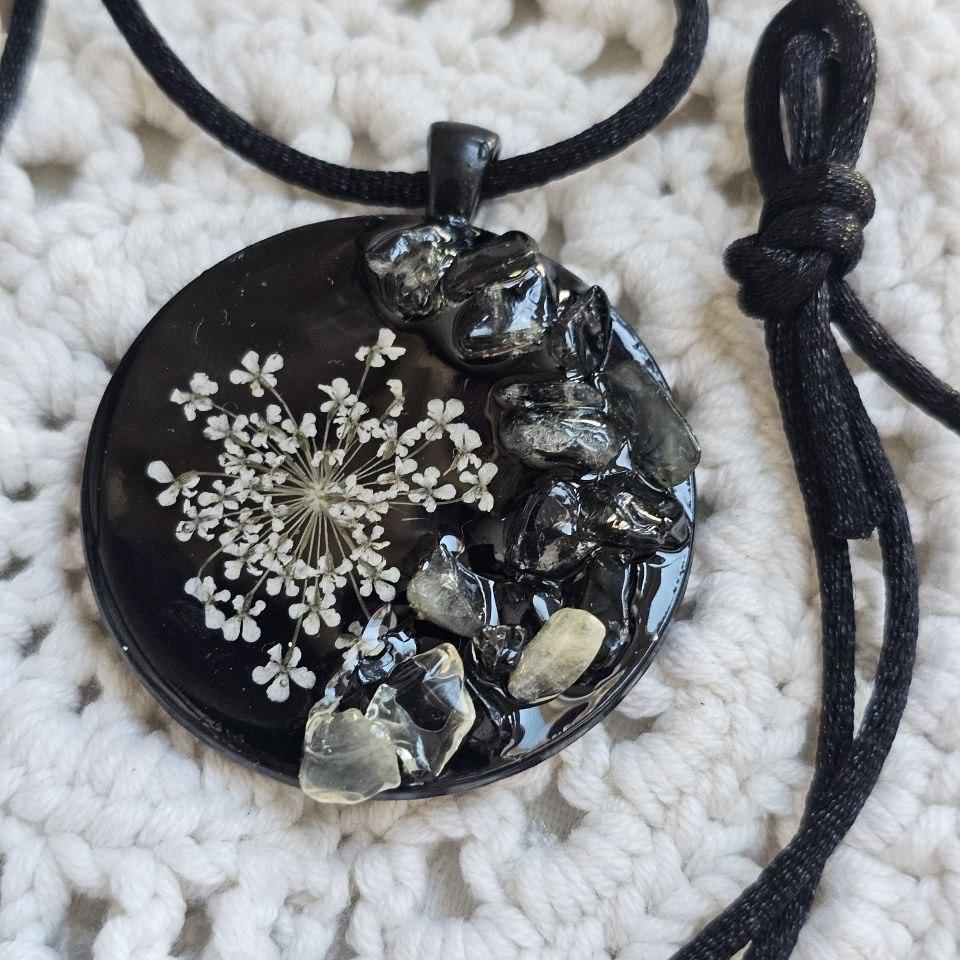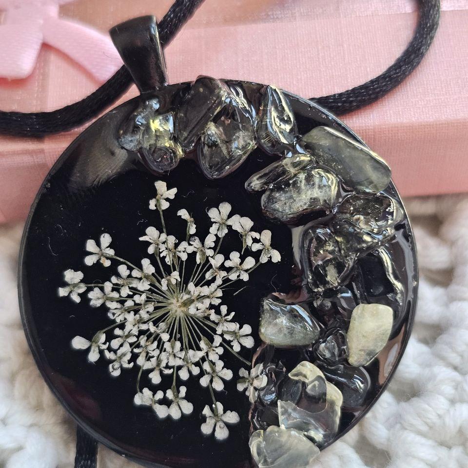 Кулон из нержавеющей стали чёрного цвета, на атласном шнурочке. Размер кулона 3,5х3,5 см. Шнурок позволяет регулировать длину. Вставка: натуральный камень лимонный кварц и растение фенхель.