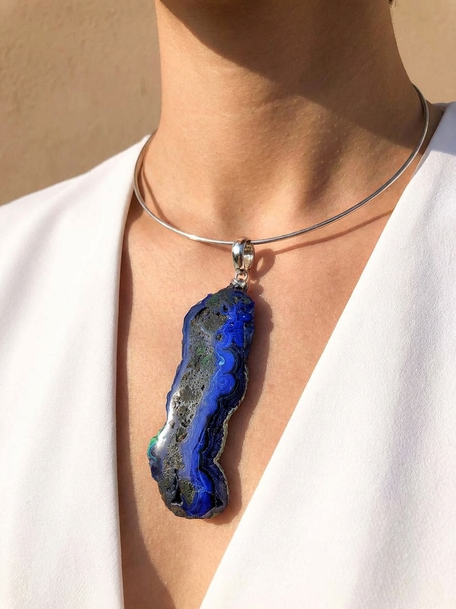 Редкая, непривычная вытянутая узкая форма камня делают кулон визуально ярким и броским, при этом украшение лишено массивности. А продольный узор азурита дополнительно усиливает визуальный эффект вертикали, добавляя изящества.