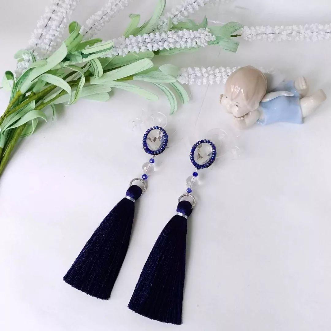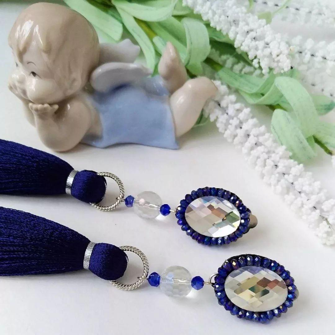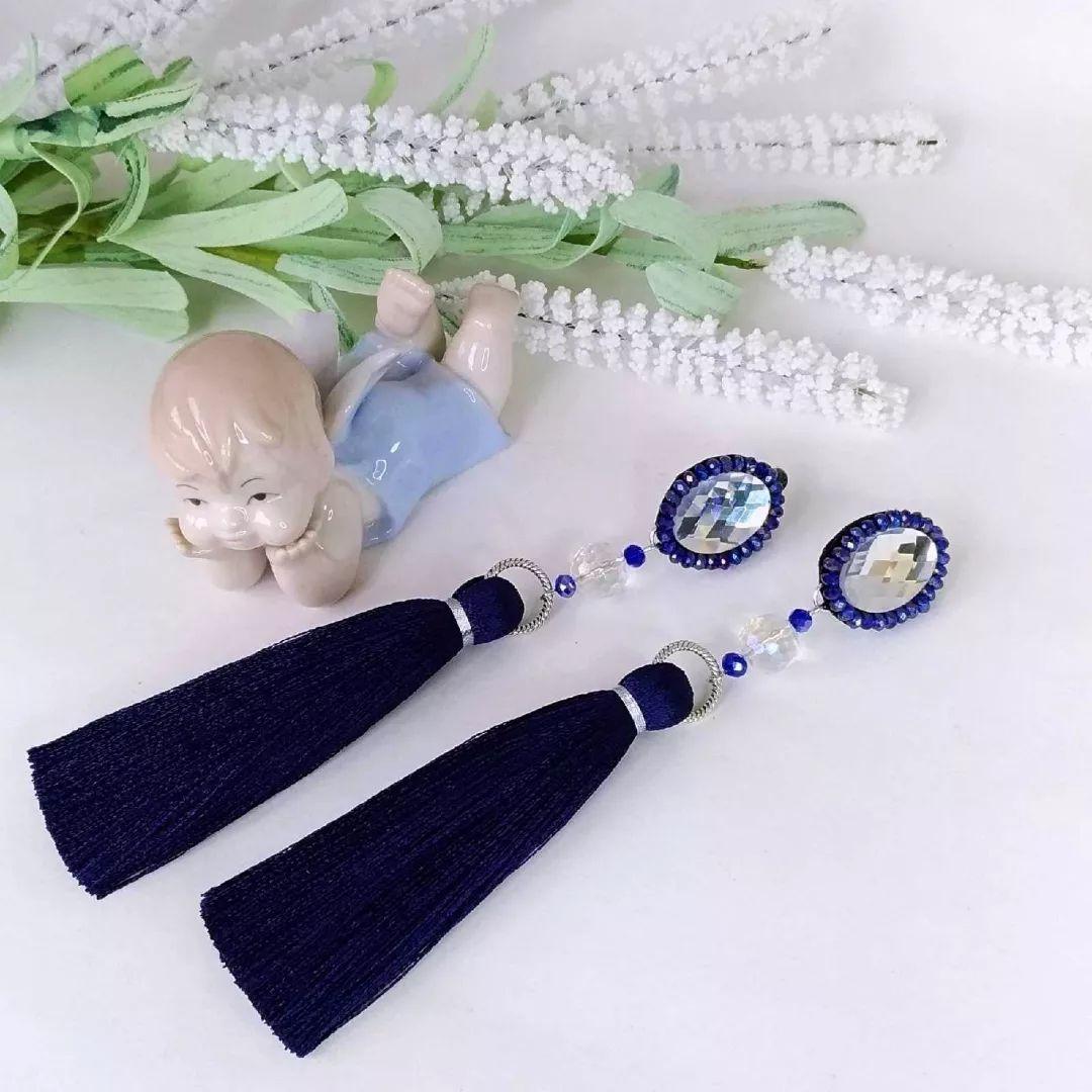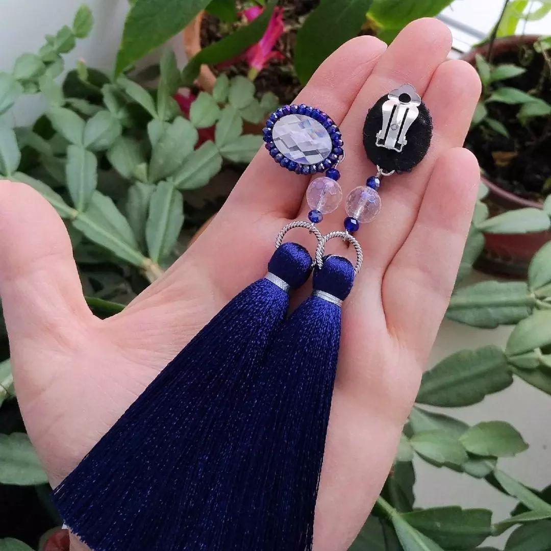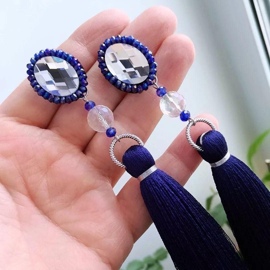 Общая длина 13 см. Кисточки сделаны мной из вискозы (искусственный шёлк), а значит они идеальны! Сверкающий и зачаровывающий кабошон закрепился в основании ушка в обрамлении австрийский стеклянных бусин, обратная сторона сделана из фетра и кожи, имеется застежка в виде клипсы. В середине украшения разместилась граненая бусина горного хрусталя. Серьги очень легкие и комфортные.