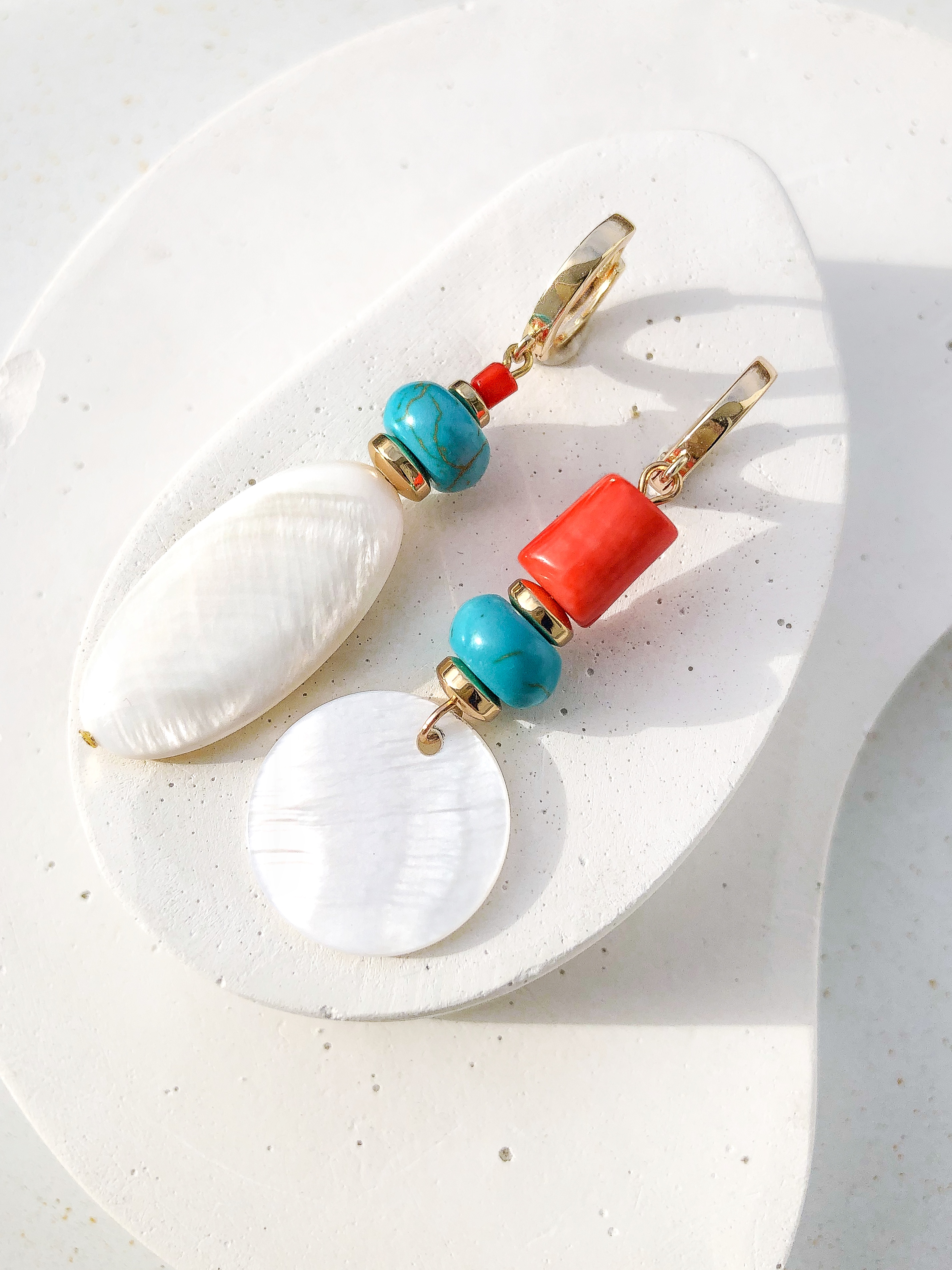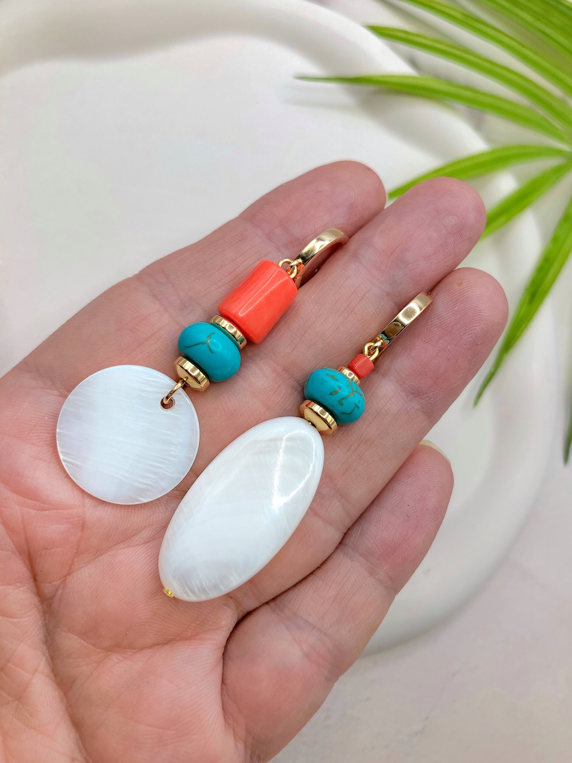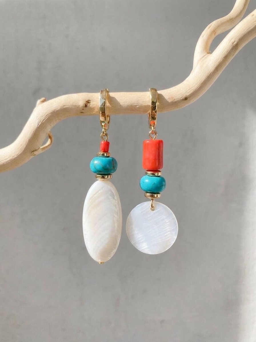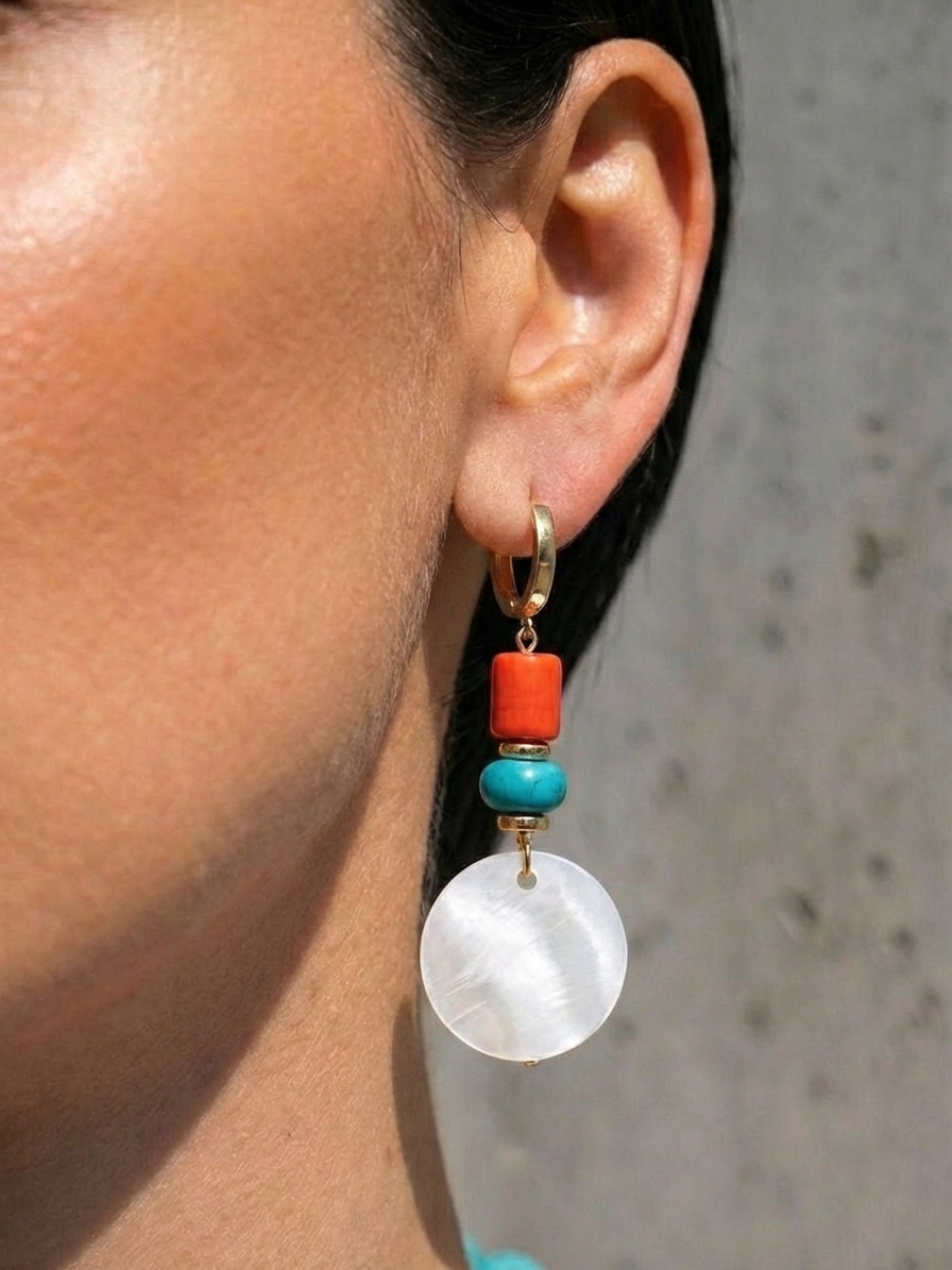 Цветовое сочетание создаёт живой и радостный акцент: бирюзовый турквенит дарит свежесть и прохладу, коралл добавляет солнечную энергетику, а белый перламутр мягко смягчает контраст, придавая лёгкость и воздушность.