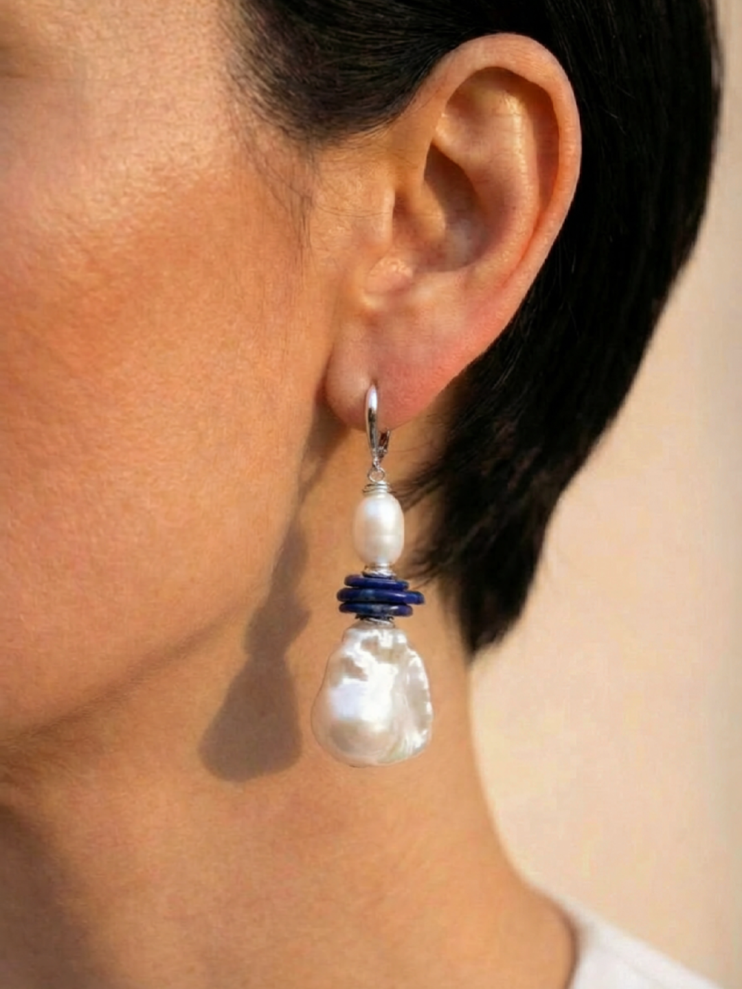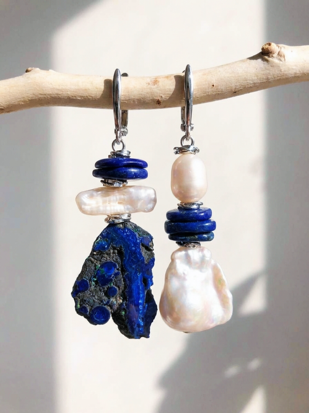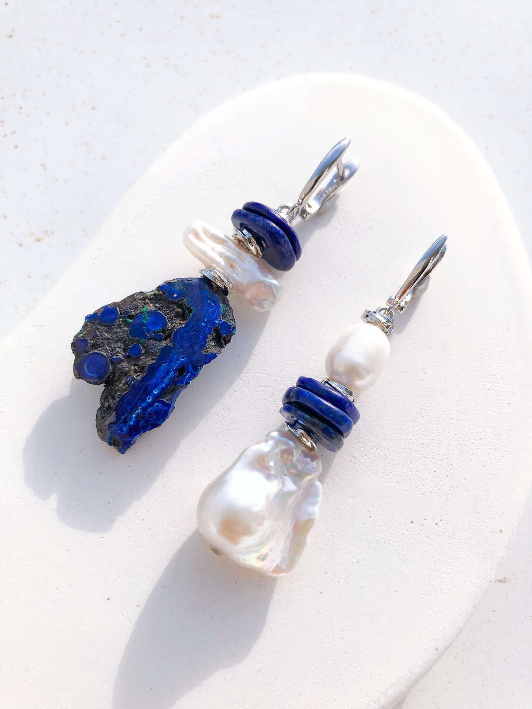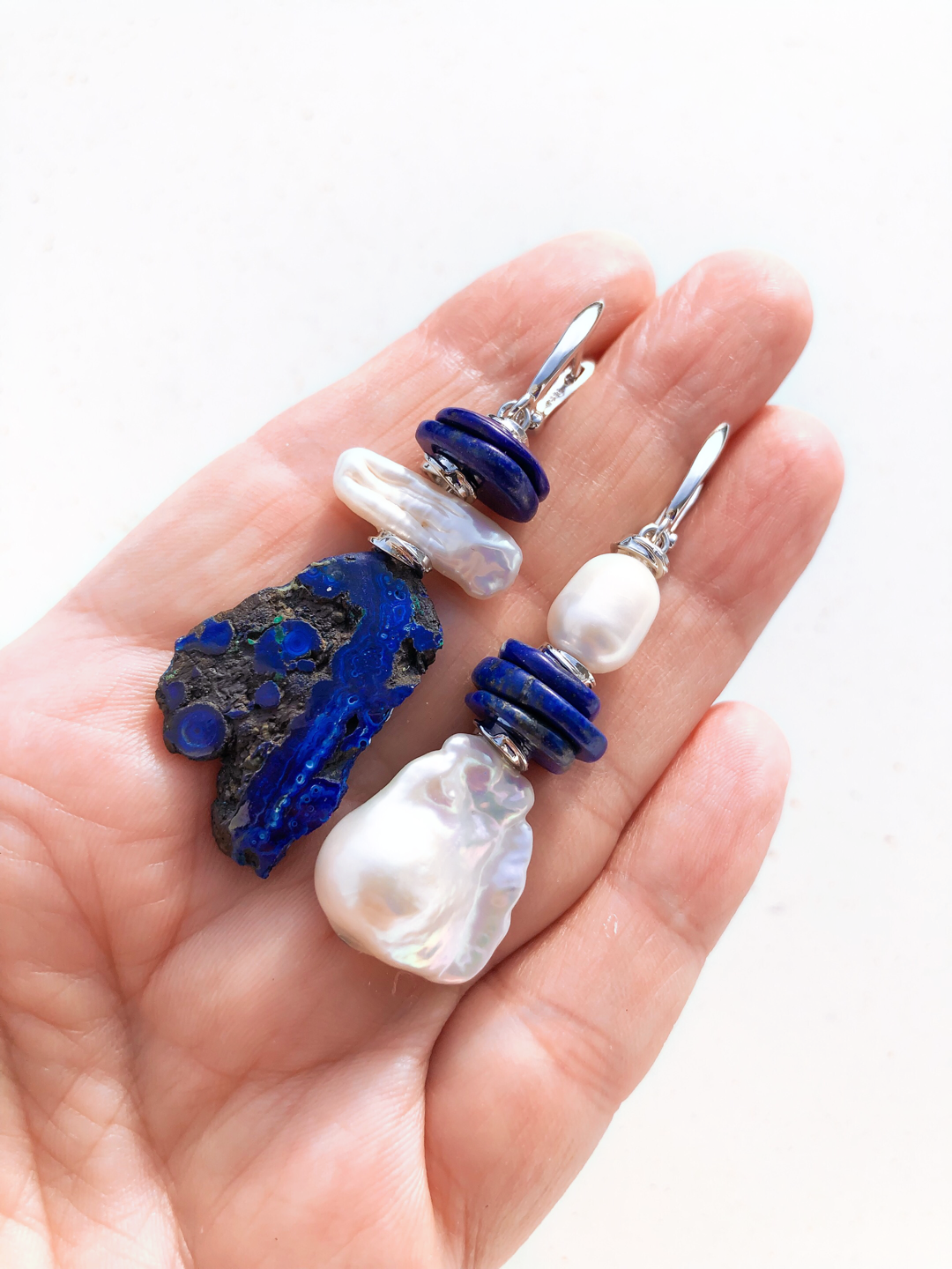 Барочный жемчуг с ярким перламутровым блеском придаёт серьгам ещё больше выразительности. В этих серёжках использована крупная жемчужина формы барокко премиального качества, крупная эффектная палочка сорта Бива и небольшая жемчужины формы "рис", которые сливаются с природным очарованием азурита и лазурита.
