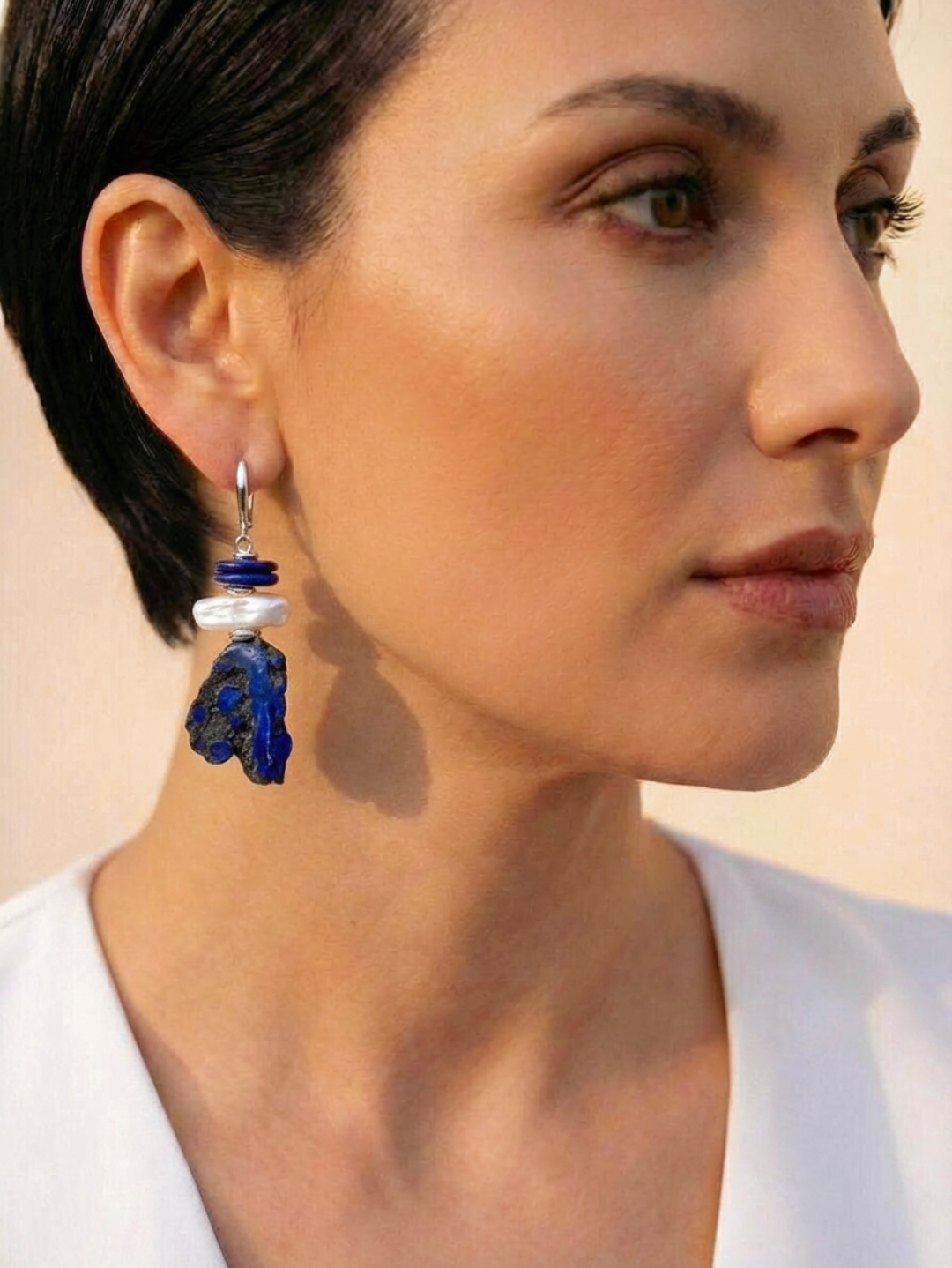Азурит, добываемый в Кемеровской области России, с его уникальной текстурой и богатым васильковым цветом, занимает центральное место в дизайне серёжек. Камень представлен в форме кабошона с диким необработанным краем, что добавляет натуральности и аутентичности изделию.