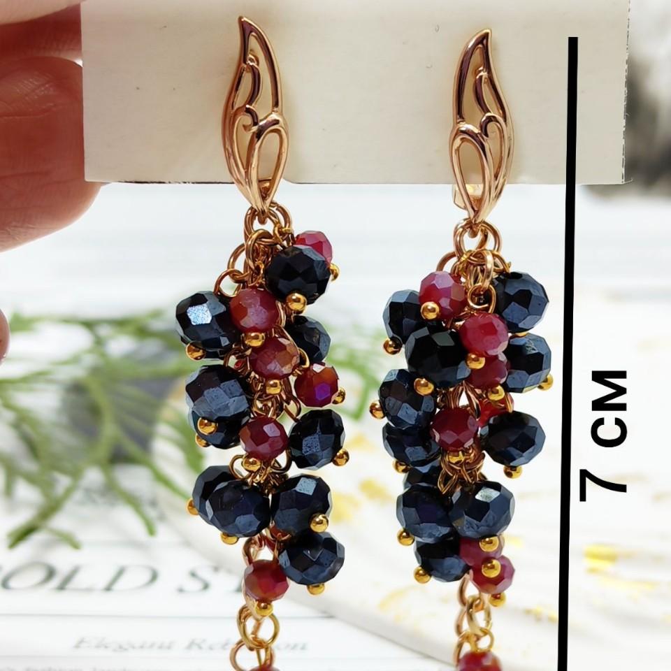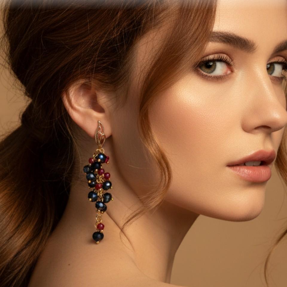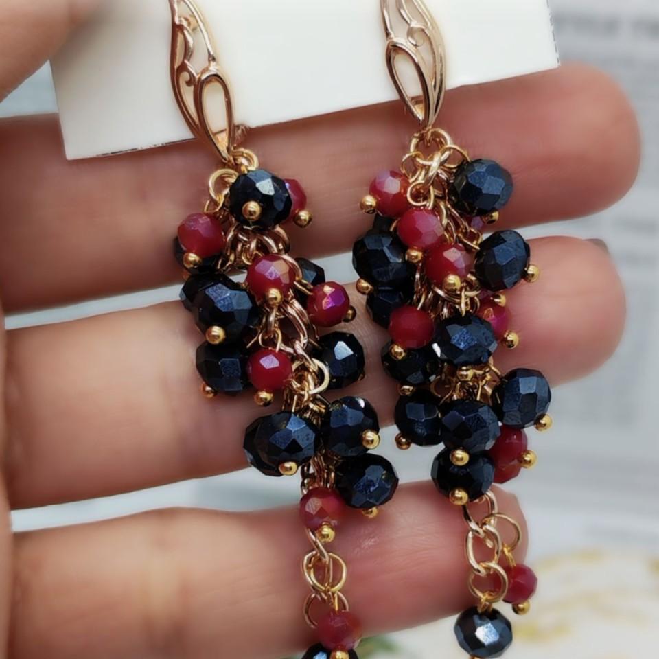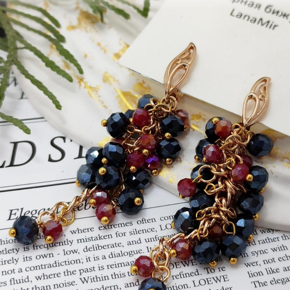Изящные серьги, которые станут ярким акцентом в любом образе! Украшение выполнено в виде пышной грозди, где гармонично сочетаются глубокие синие и насыщенные гранатовые бусины. Переливы граней создают завораживающий эффект — серьги буквально «играют» на свету, привлекая восхищённые взгляды.