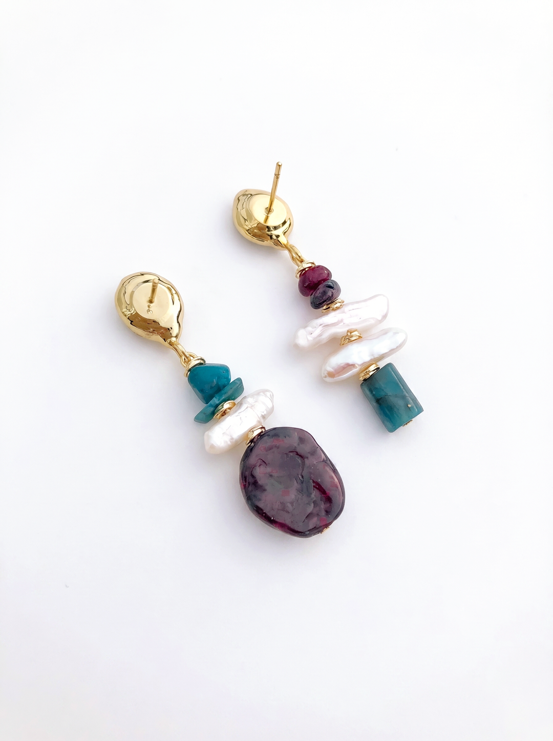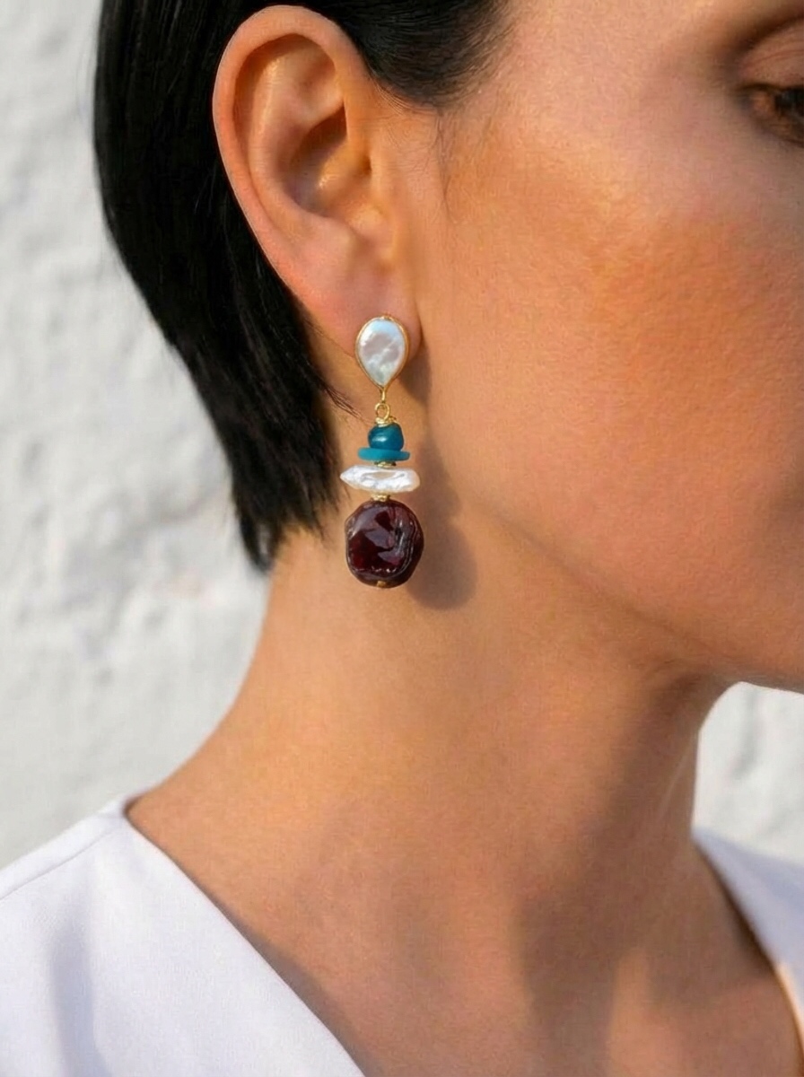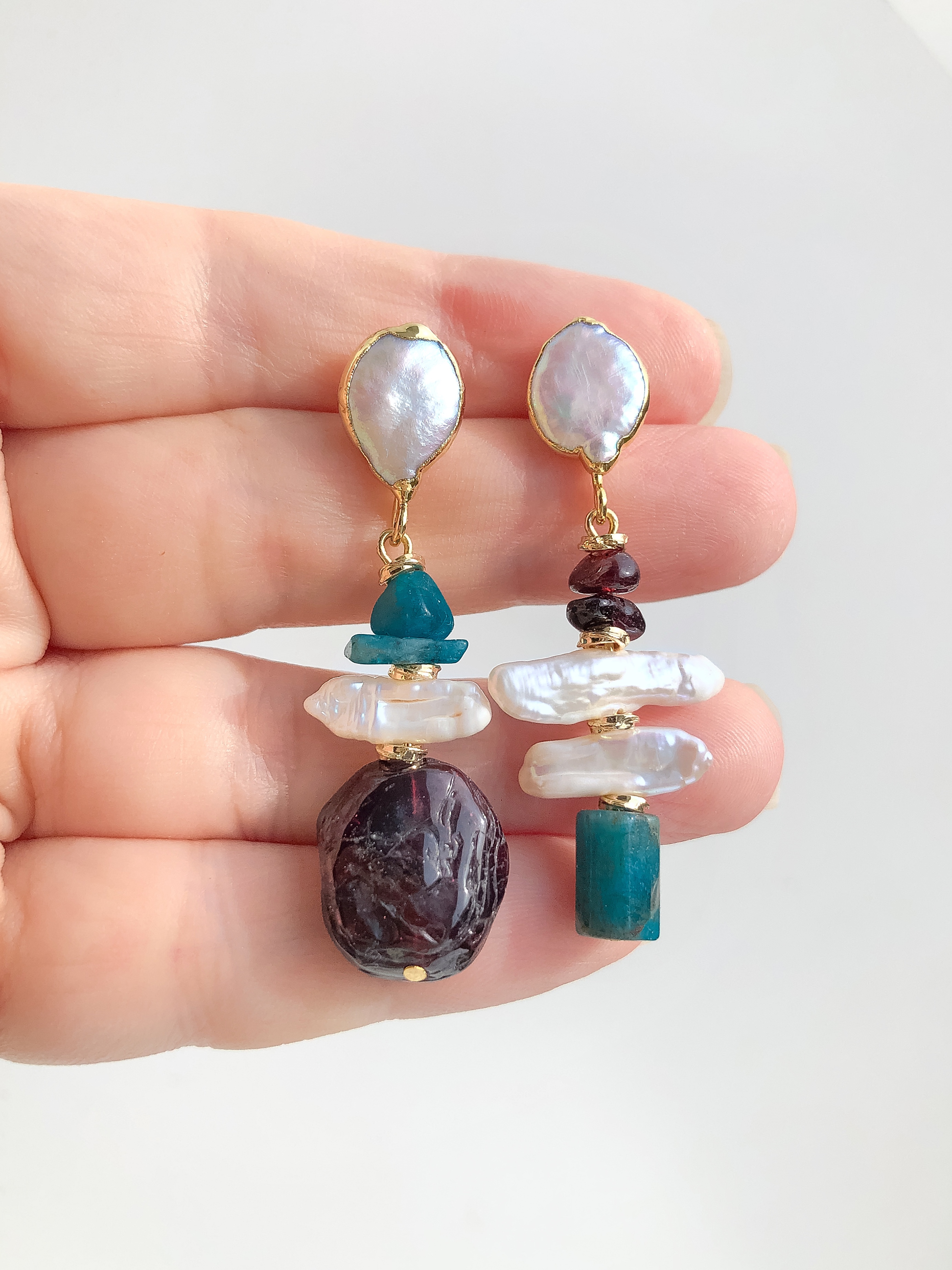 Подчеркнуть свою уникальность, раскрыть очарование и женственность можно в этих серьгах ручной работы по авторскому дизайну. Гранат, апатит и натуральный барочный жемчуг в невероятно эффектным миксе для ваших неповторимых образов!