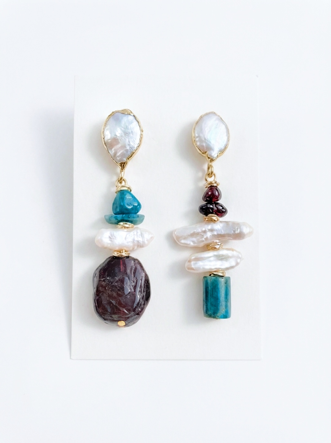 Яркая асимметрия и изысканная цветовая палитра натуральных камней гранат, апатит с белизной натурального жемчуга.