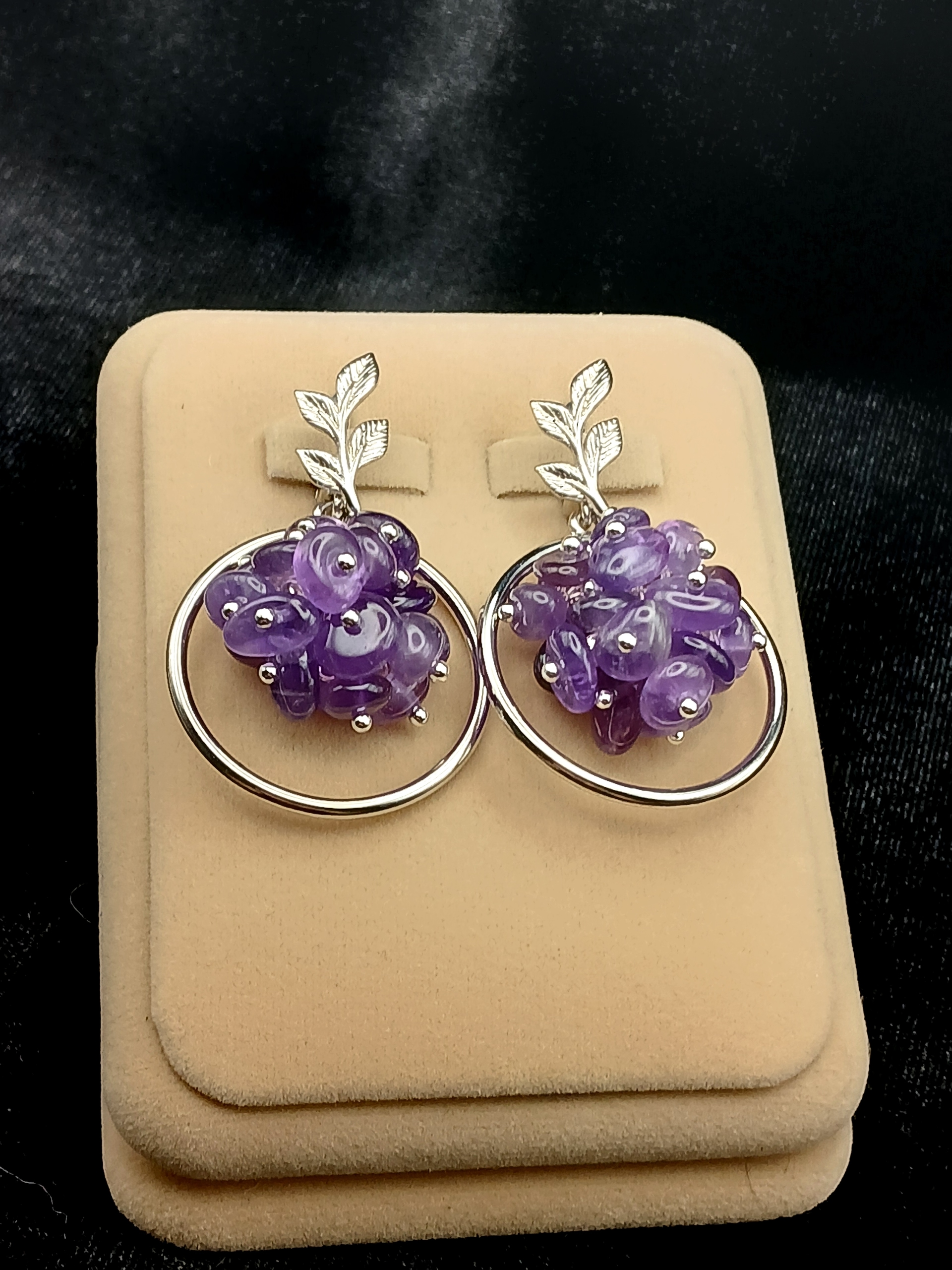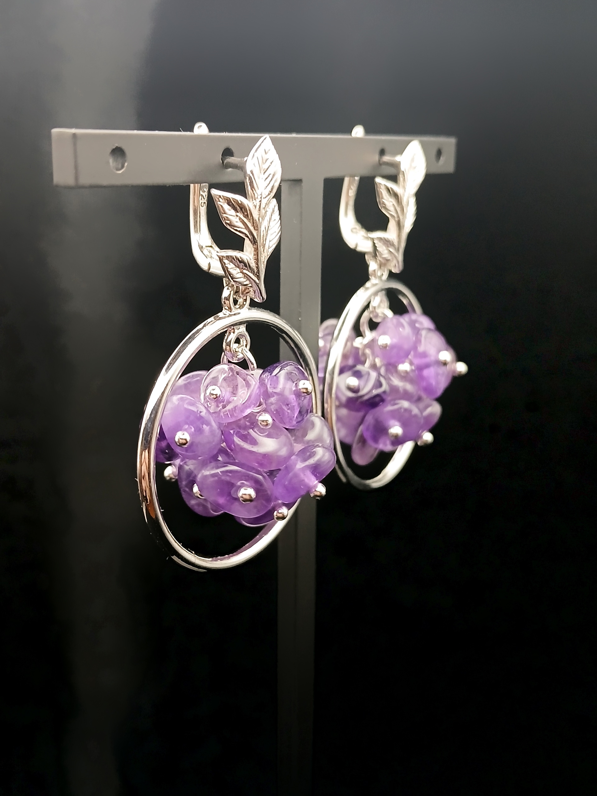Серьги с аметистом и родированной фурнитурой.