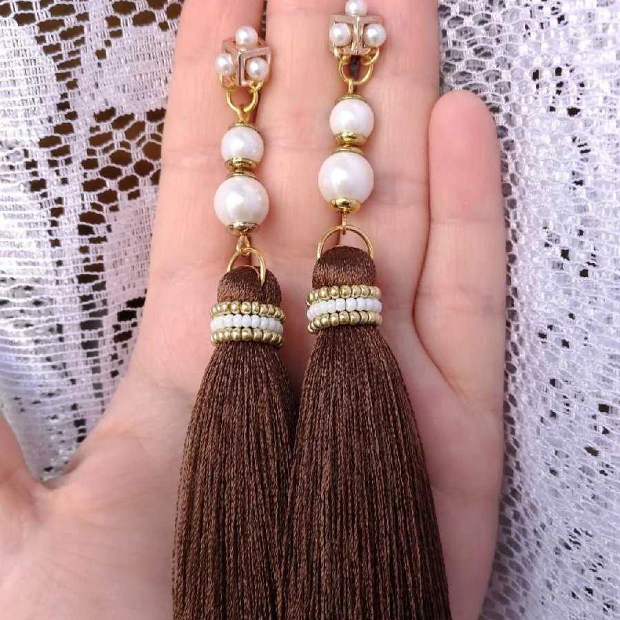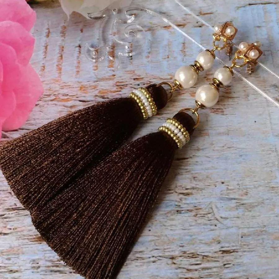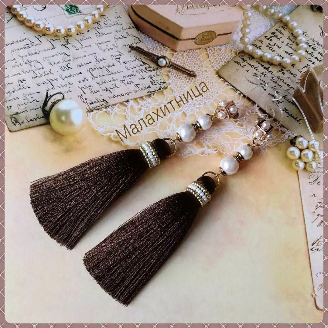 Кисти сделаны (мною лично) из 100% индийской вискозы, камень: жемчуг Майорика класса АА, вся фурнитура покрыта специальным ювелирным лаком, чтобы у вас не было аллергии, не потемнеет, не облезет, не потеряет свой внешний вид. Общая длина серег 12 см.
