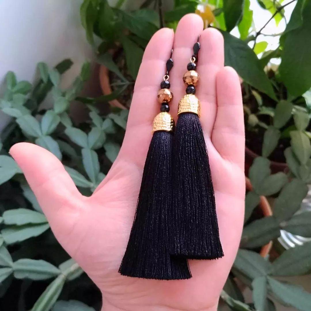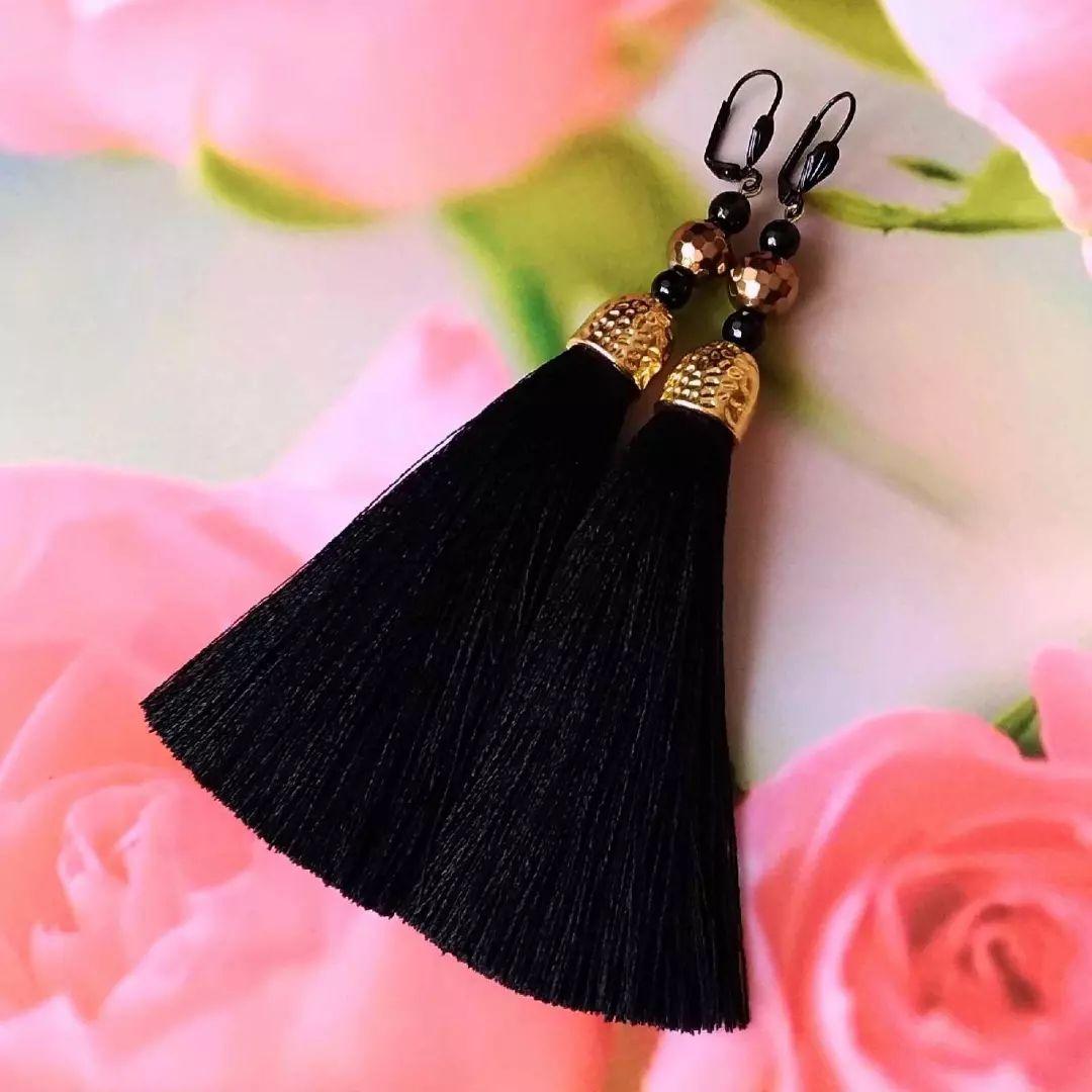 Общая длина серег 13 см. Кисточки сделаны мной, и поэтому они идеальны! Камни: золотистый граненный гематит и черный граненный агат. Колпачки родированные с позолотой. Швензы черненные с керамическим покрытием.