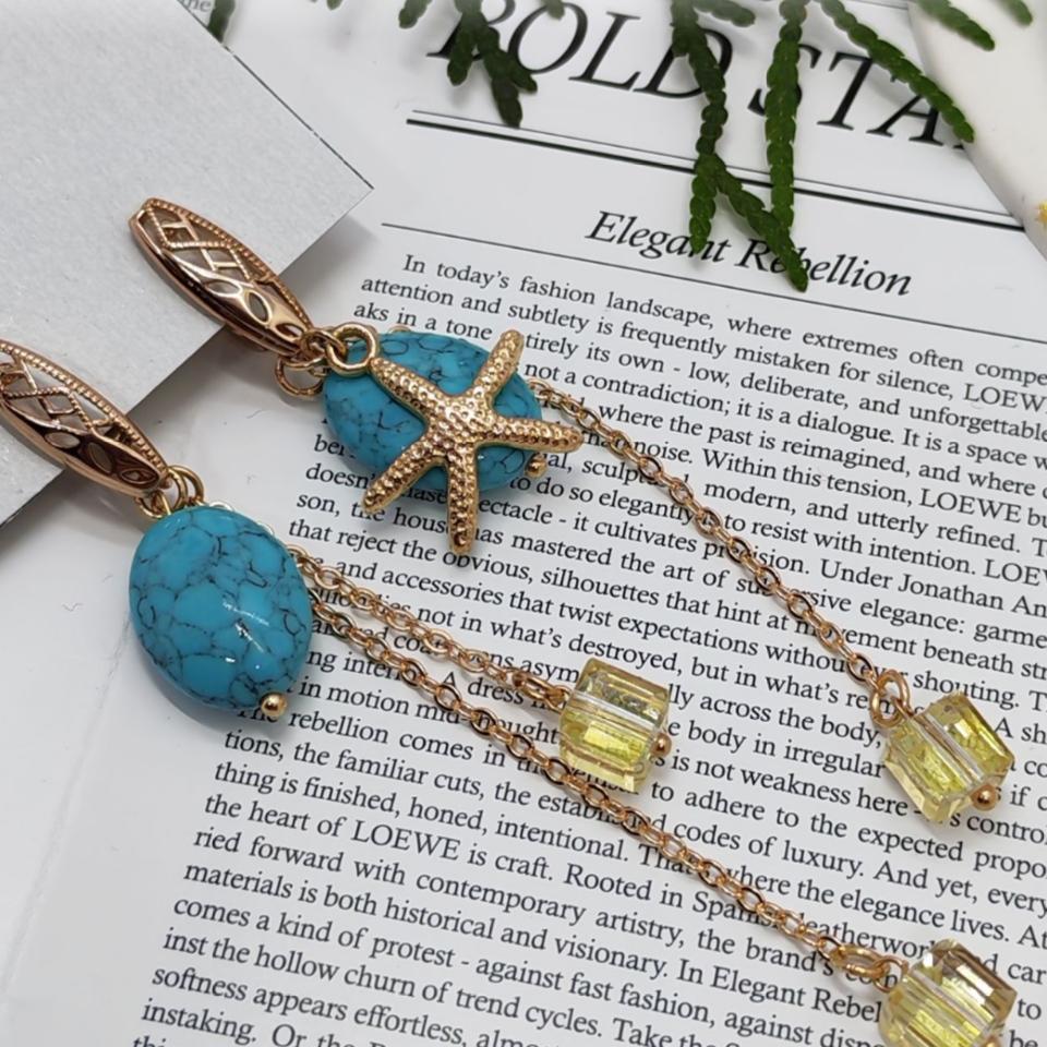 • Дизайн: композиция из бирюзового камня и подвески в виде морской звезды, дополненная изящной золотой цепочкой с гранёными жёлтыми элементами. Верхняя часть серьги оформлена в виде ажурной золотой детали, напоминающей морскую волну или ракушку.