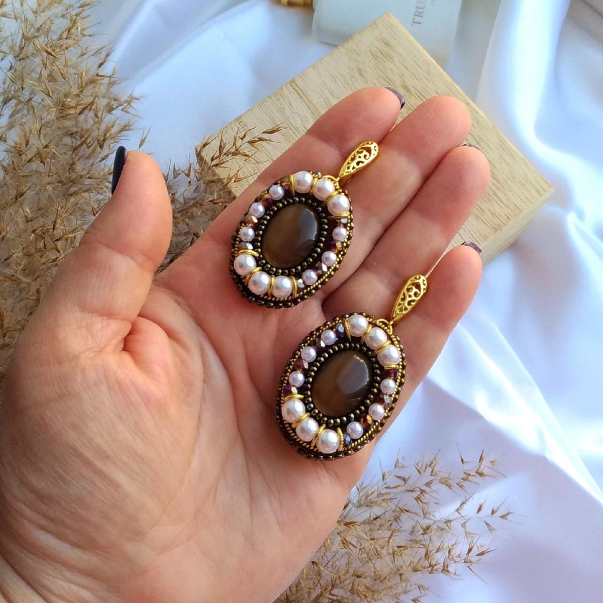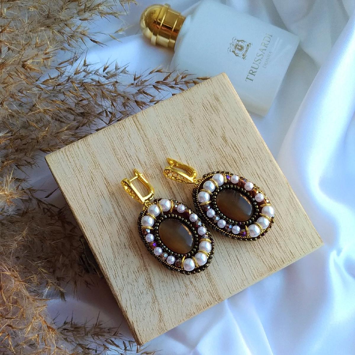 Выполнены мной вручную. Камень: кабошон кошачий глаз. Обшиты чешским бисером, чешским хрусталём и искусственным жемчугом. Швензы родиевое покрытие с позолотой.