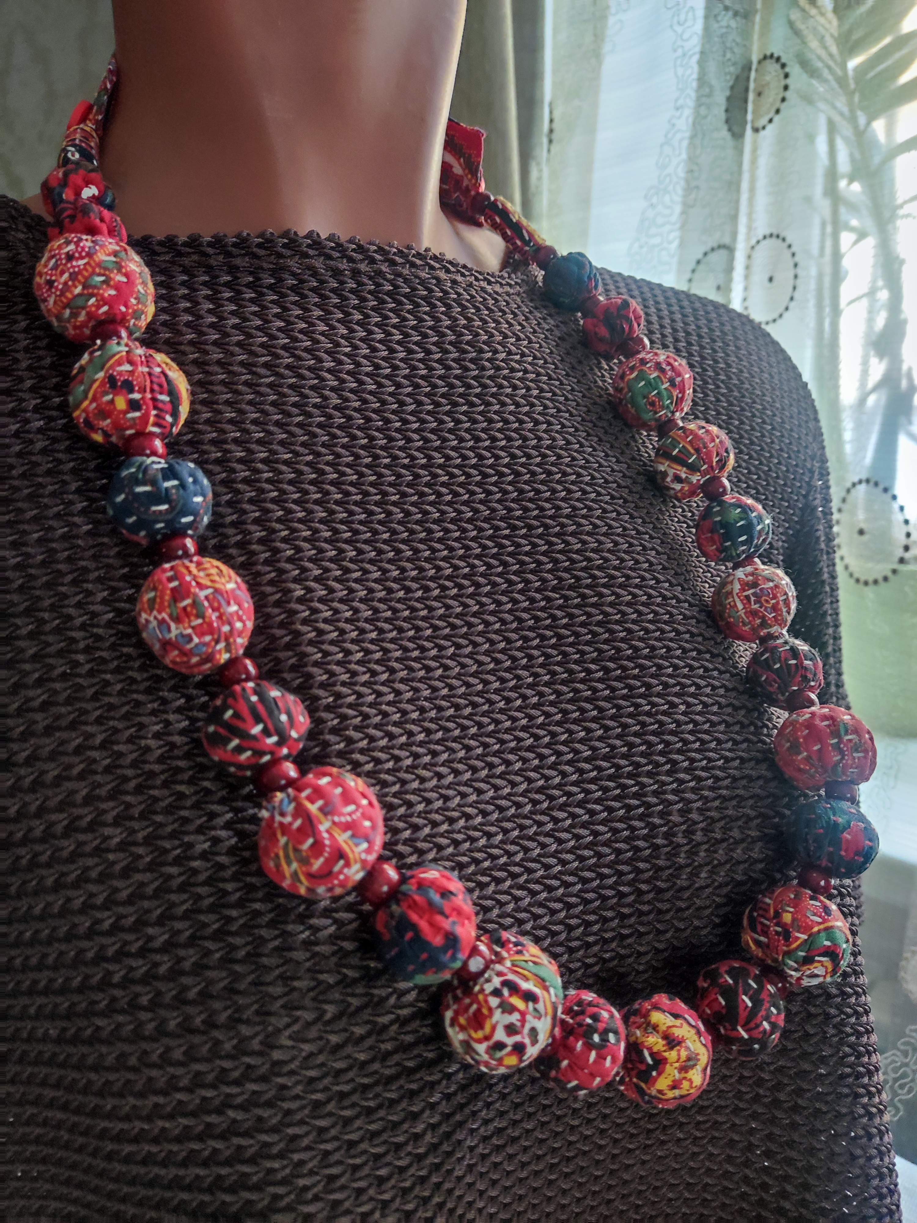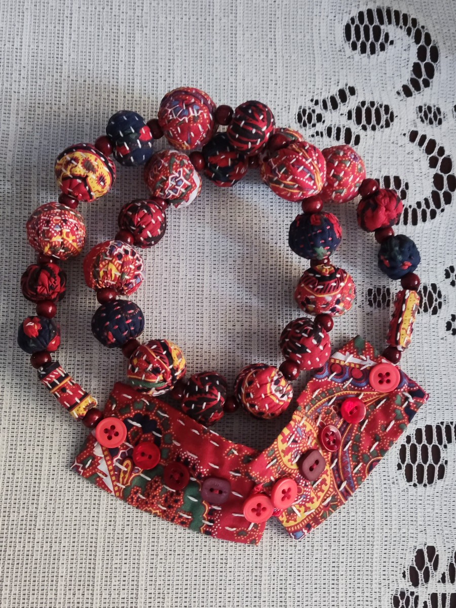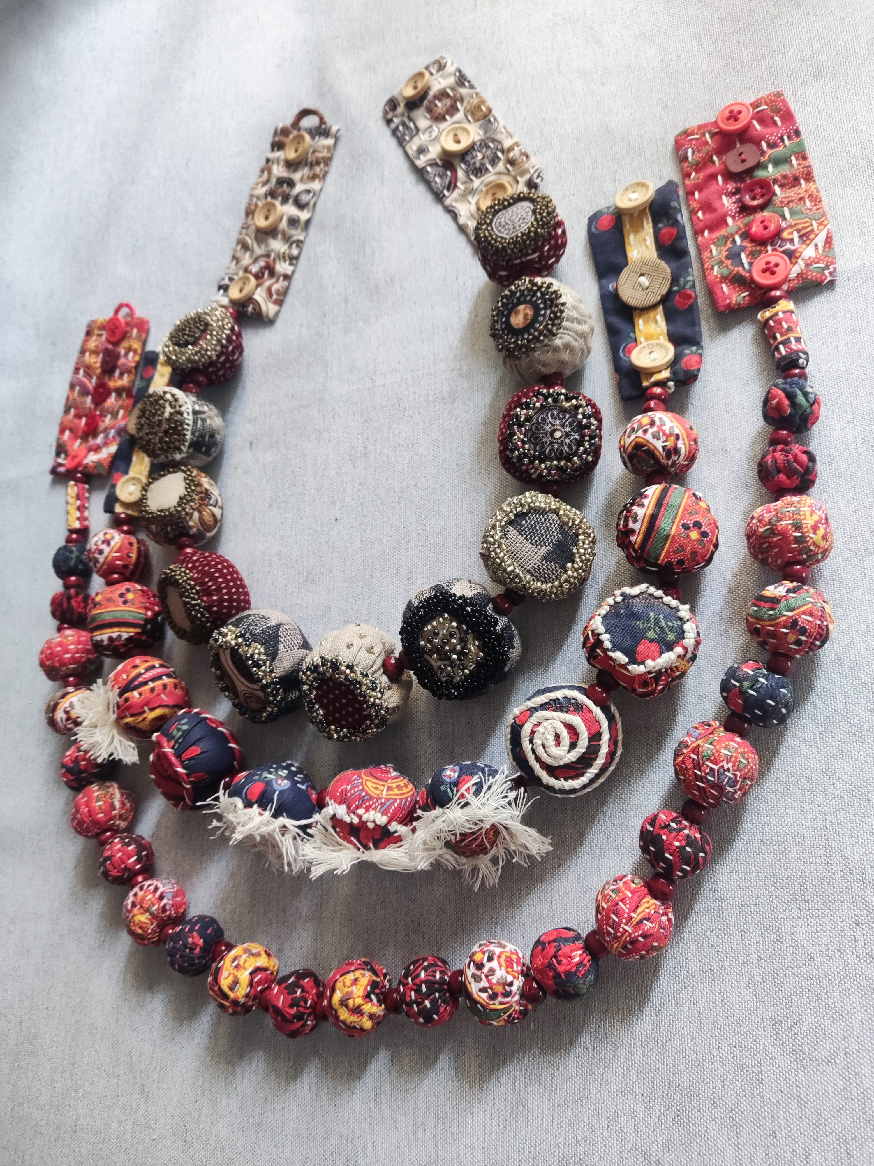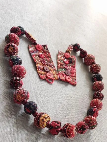 Каждая текстильная бусина изготовлена вручную в лоскутной технике, что придает им уникальный и эксклюзивный вид.