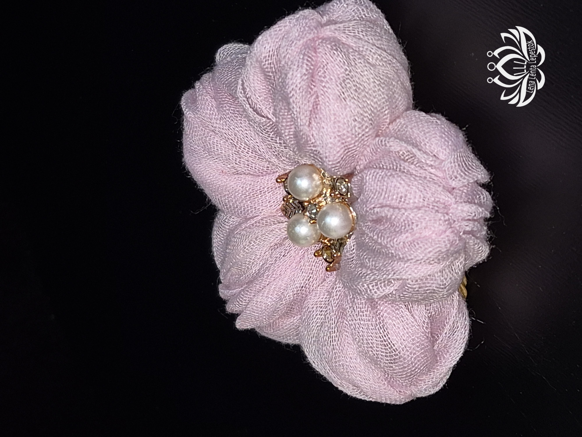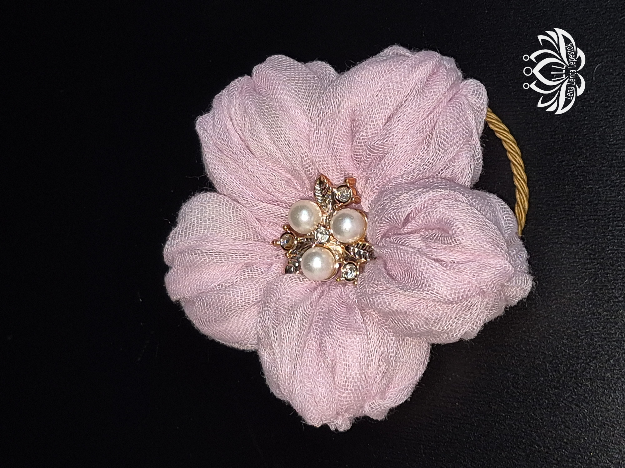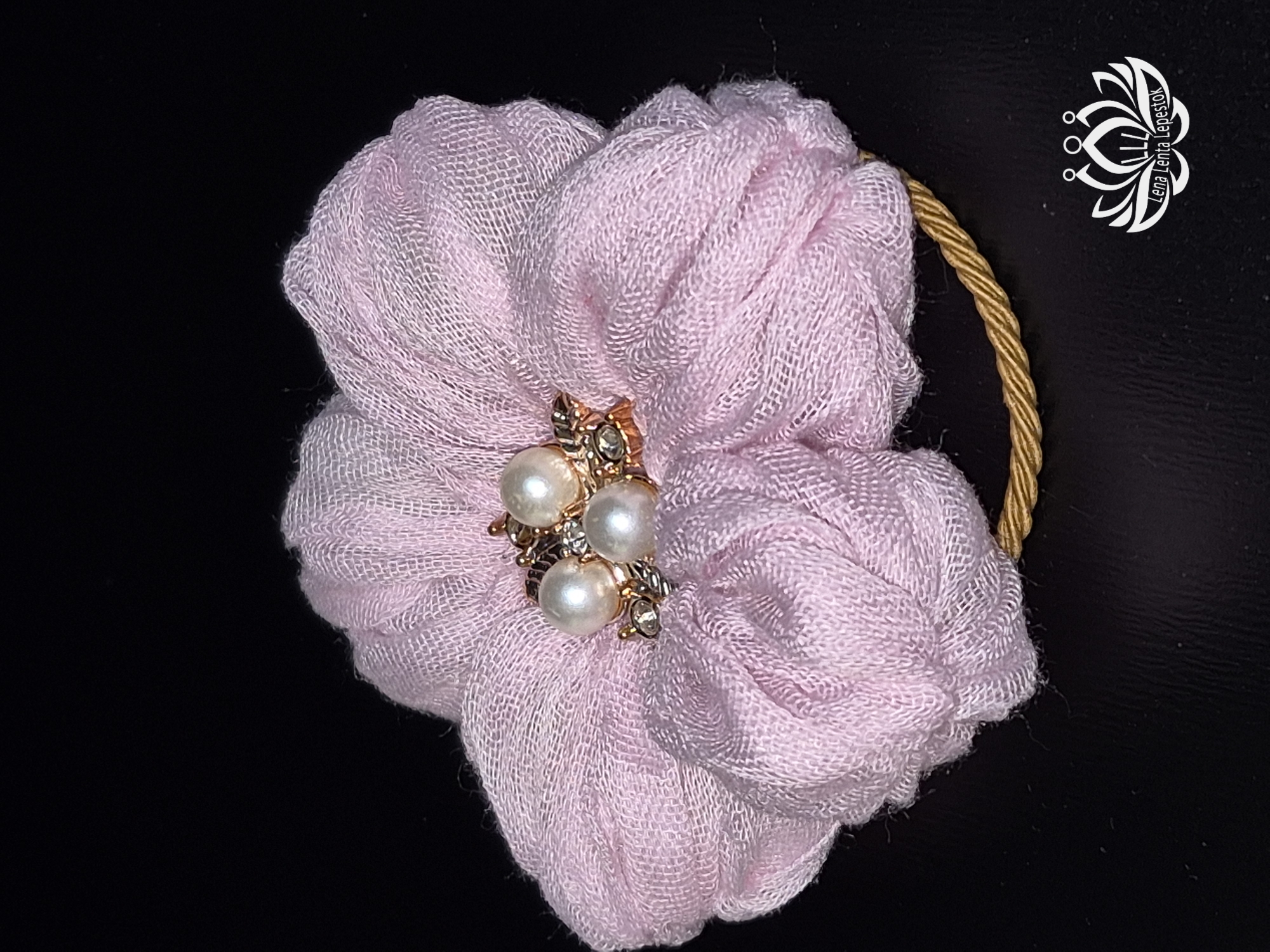 Розовый цвет резинки "Цветок" излучает нежность и романтику. Жатый хлопок придает цветку неповторимую текстуру и объем, а наполнитель обеспечивает его мягкость и форму. Блеск стразов и кабошона добавляет изысканности и шика этому уникальному аксессуару.