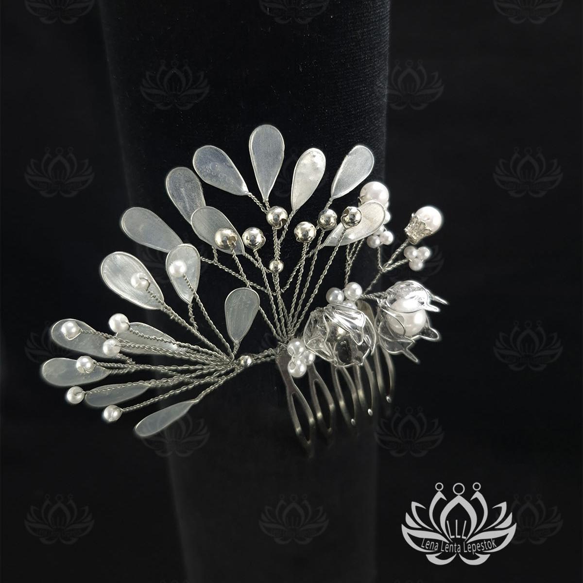 Каждый гребень "Сияние" украшен изящными серебристыми лепесточками и полупрозрачными цветами из ювелирной смолы Витраль. Эти элементы создают ощущение легкости и воздушности, как будто утренняя роса. Бисер и декоративные элементы добавляют глубины и фактуры, делая украшение запоминающимся.