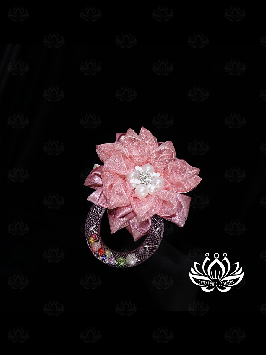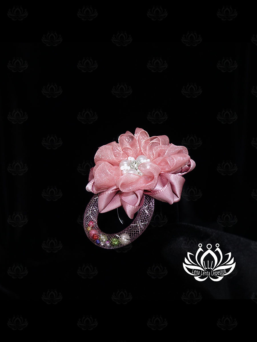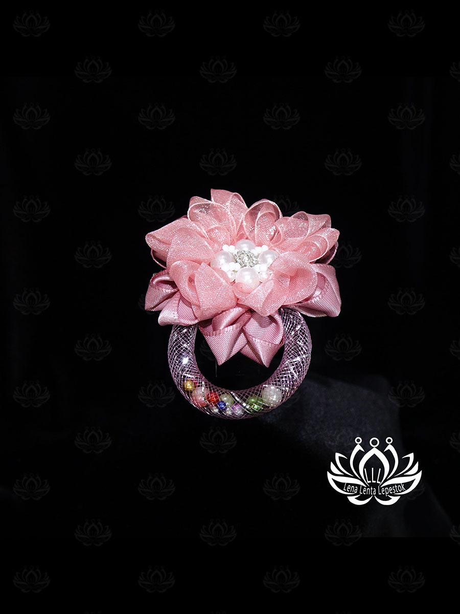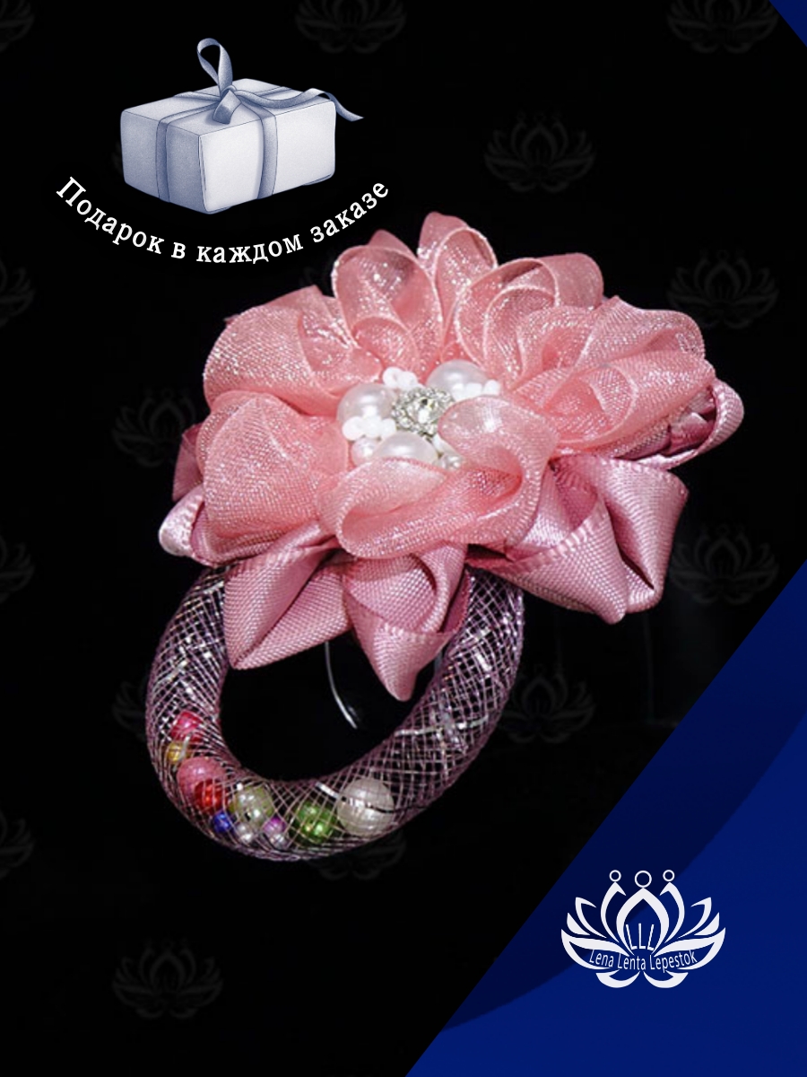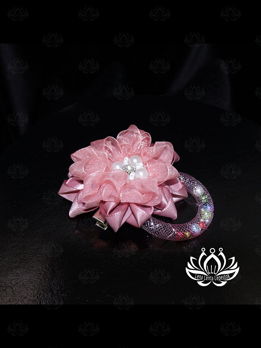 • Особенности: цветок из двух видов лент, самодельный кабошон из бусин и бисера в центре цветка, оригинальная дуга-подвеска из сетчатой трубки с подвижными бусинами.